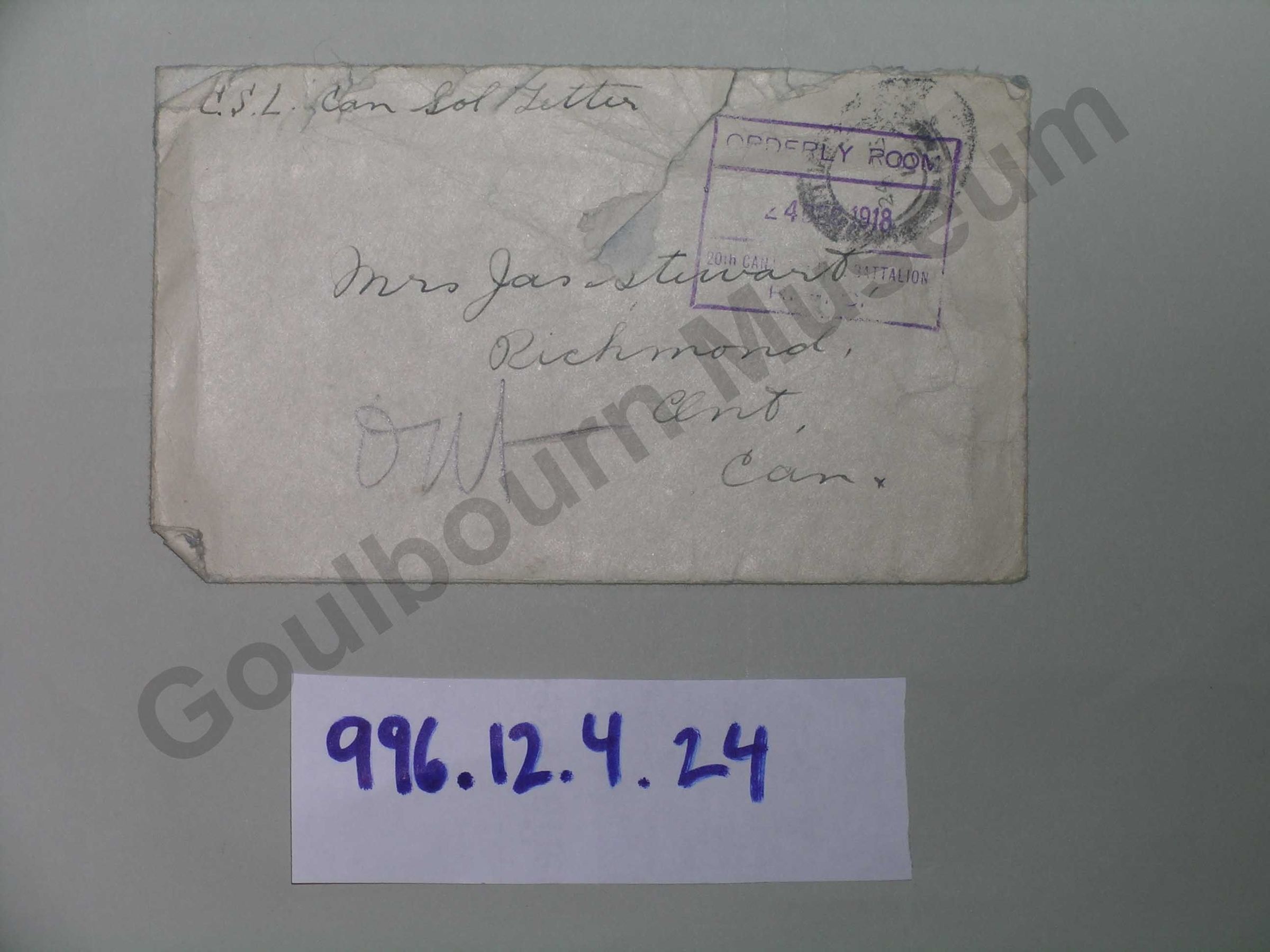 Paper envelope addressed to Mrs. Jas Stewart. Ont. CaSubject Person/Organization