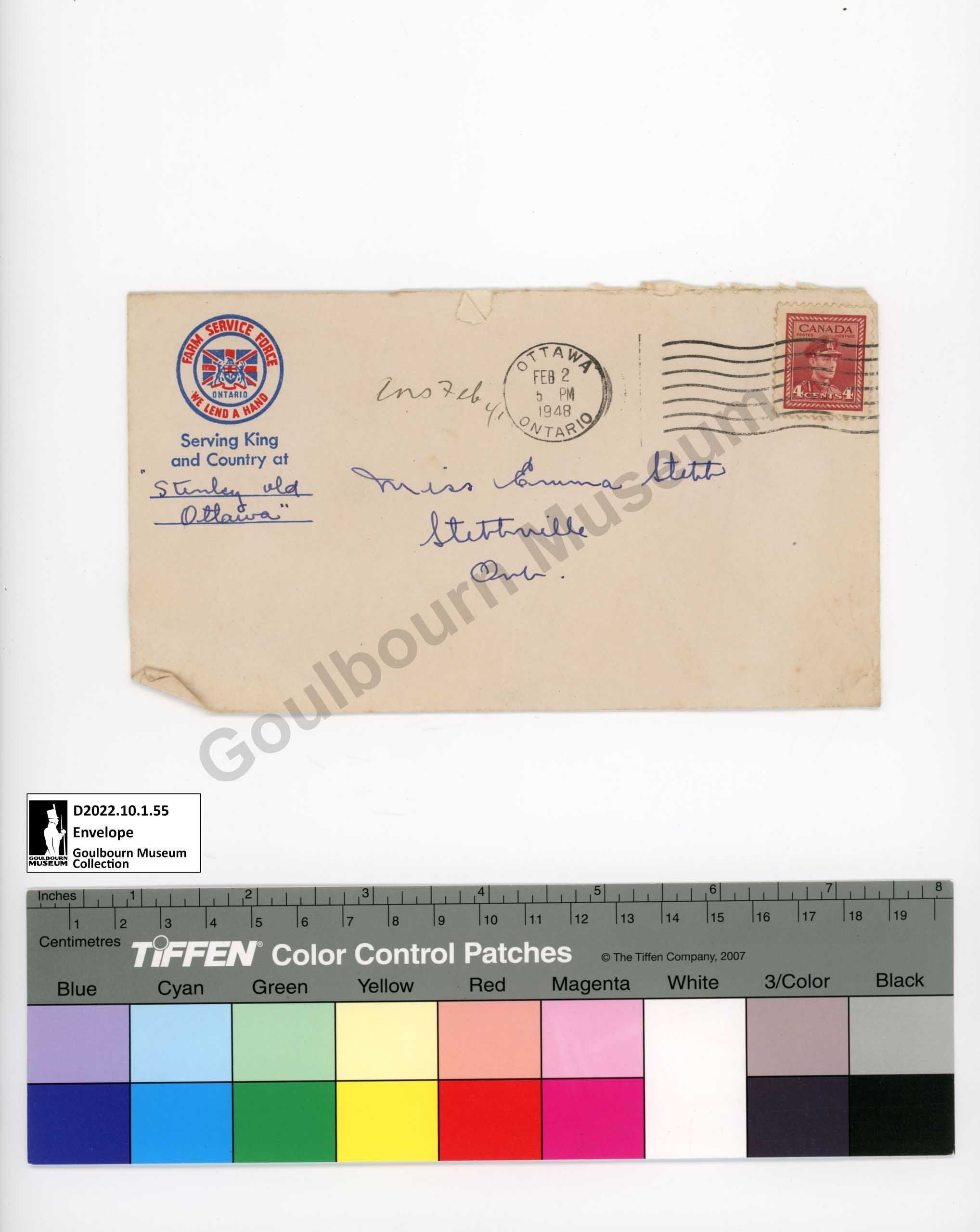 Envelope missing original letter. Farm Service Corps letterhead. Addressed to Emma Stitt of Stittsville.Subject Person/Organization