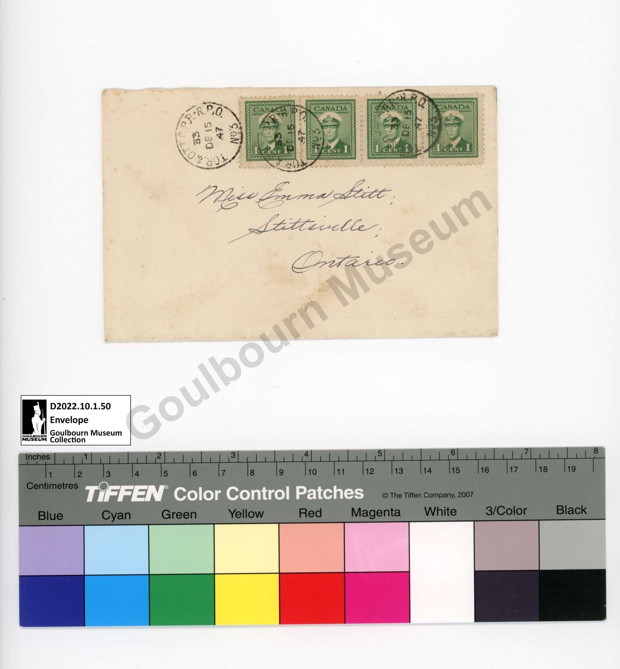 Posted envelope addressed to Emma Stitt of Stittsville.