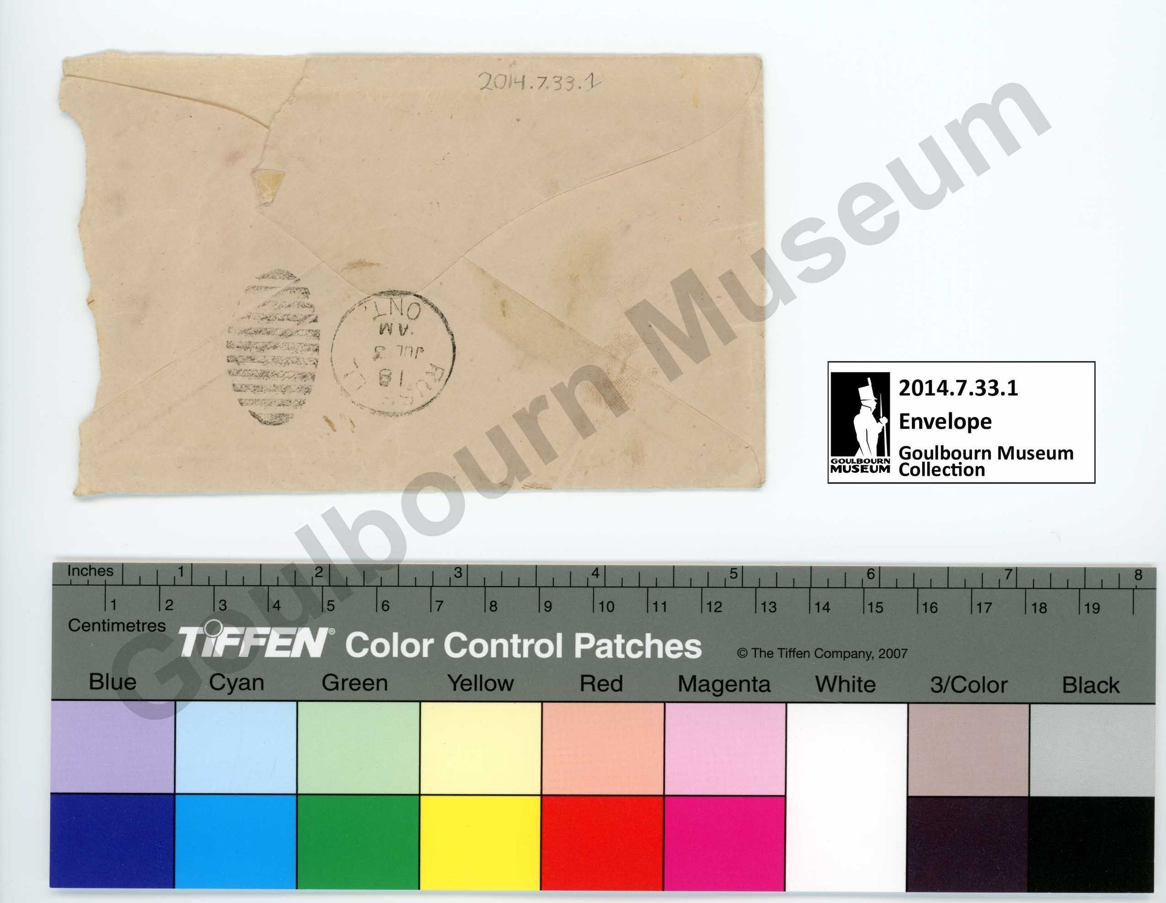 [Envelope Back] [Postmark] RICHMOND 18 [abbreviated: 1918] Jul [abbreviated: July] 3 AM [abbreviated: Ante Meridiem, Latin for Before Noon] ONT. [abbreviated: ONTARIO] [Oval ink stamp]"Language