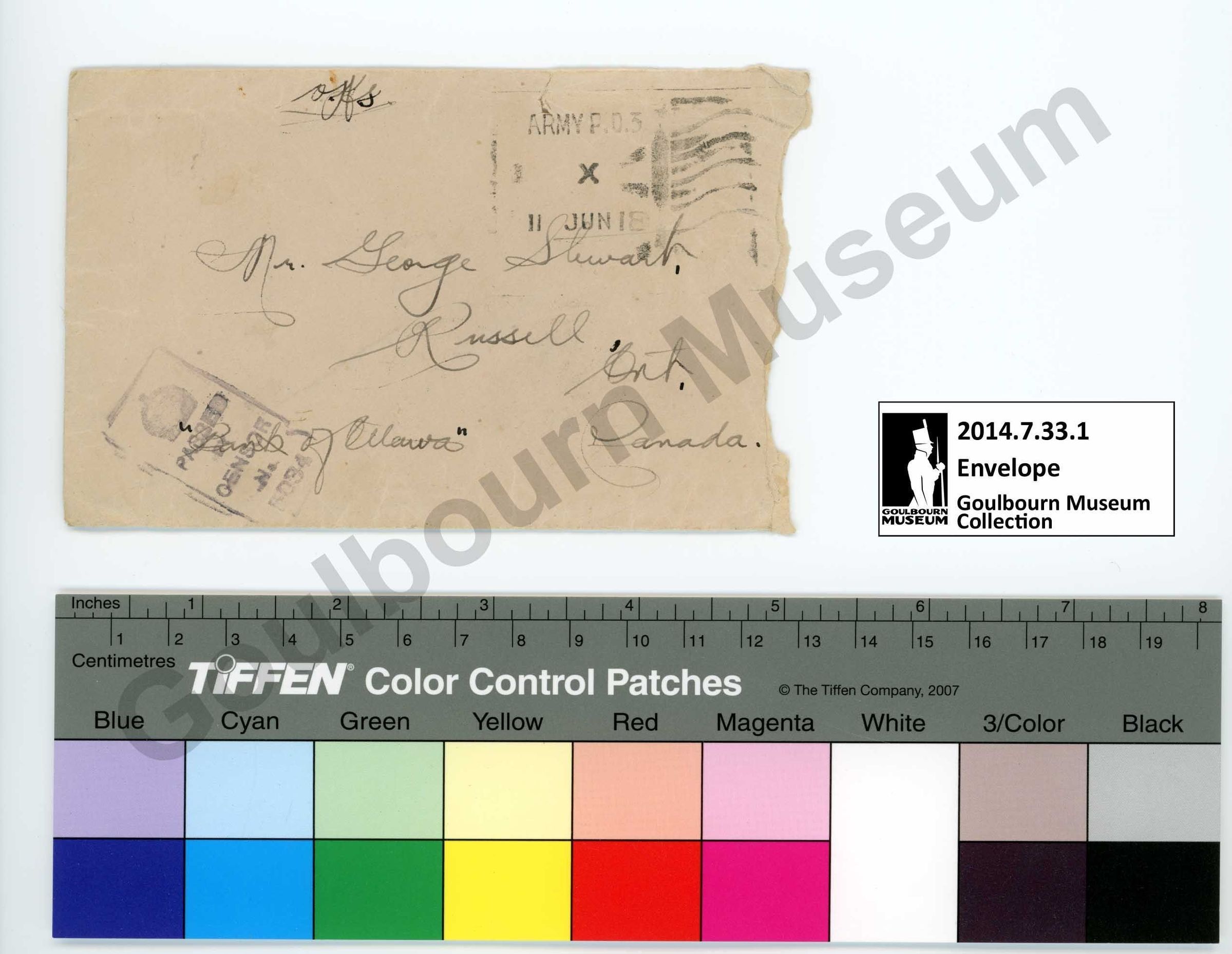 This object is an envelope made of a tan paper which has been folded into shape. It is held together with an unknown adhesive. The front bears an inscription written in a black medium. The inscription reads "Mr George Stewart" "Russell, Ont, Canada" and "[Illegible] of Ottawa". A darker black medium has been used to append the inscription adding commas and brackets. Another illegible, single word, inscription appears at the top center of the font. There are two rubber stamp imprints on the front rendered in black ink. At the proper bottom right of the front is a rectangular stamp which reads "Passed by Censor No. [Illegible]". At the proper top left of the front is a rectangular stamp which reads "ARMY P.O.3" "X" and "JUNE 18"; to the proper left of the script are wavy horizontal lines in a vertical arrangement. There are two rubber stamp imprints on the back rendered in black ink. The first, to the proper left of center in the proper bottom left quadrant is an oval comprised of horizontal lines with negative space between them. The second appears at the center of the back on the lower half; it presents as a circle with text on the interior which reads "RUSSELL 18 JUL 3 AM ONT". The circular inscription is upside-down in relation to the orientation of the envelope.Subject Person/Organization