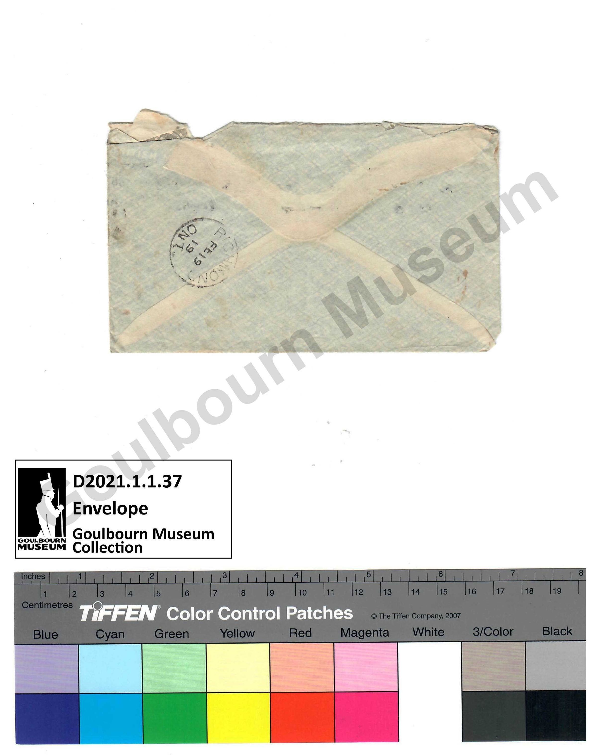 Digital Artifact: One empty envelope, made from paper, marked in black ink, addressed to Mrs. S. Stewart Richmond, ON and postmarked Richmond FE 19 19 ONT.Subject Person/Organization