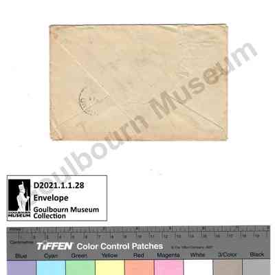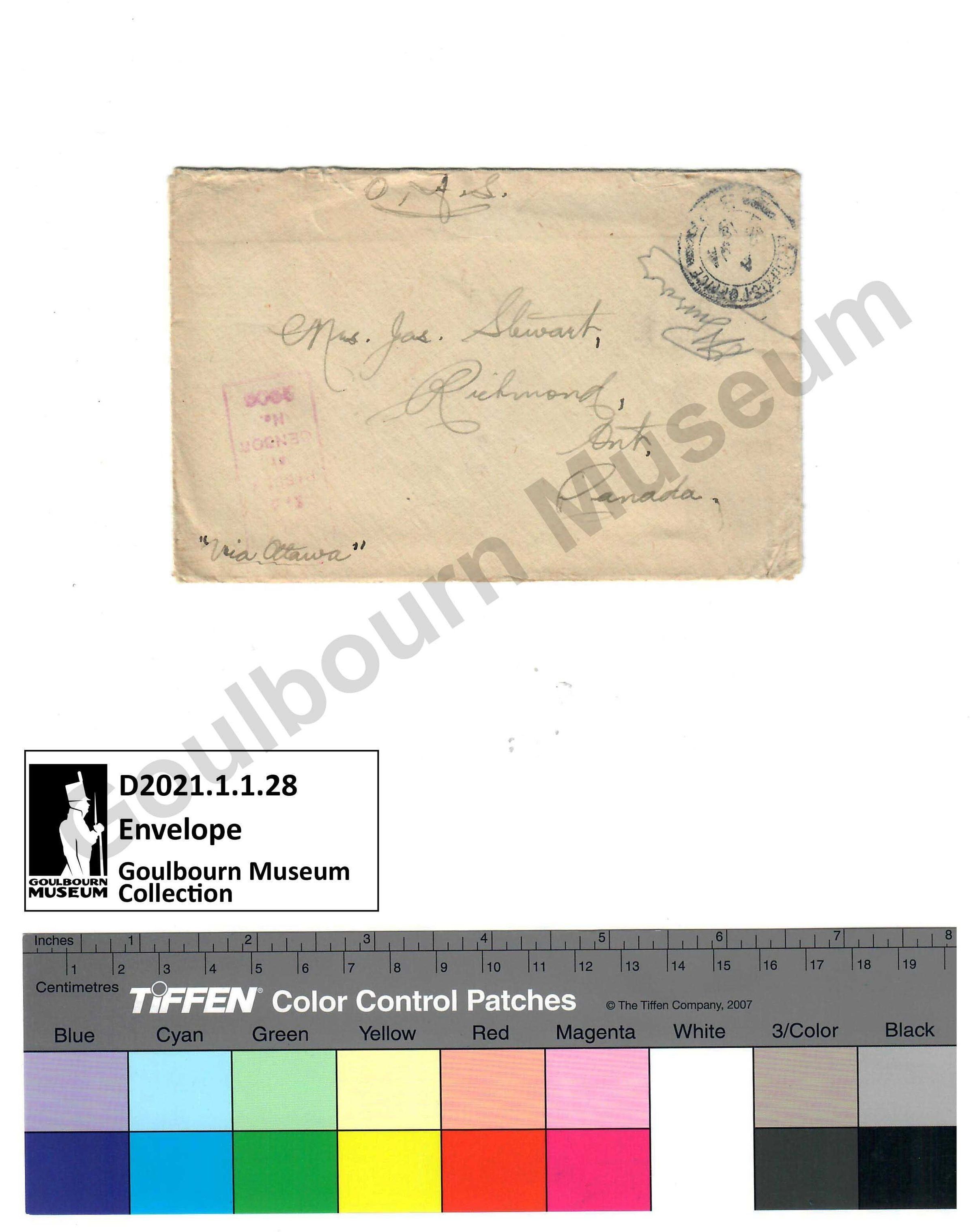 Digital Artifact: One empty envelope. Made from paper, marked in black ink. Addressed to Mrs. James Stewart, Richmond. Postmarked field post office January 1918.Subject Person/Organization