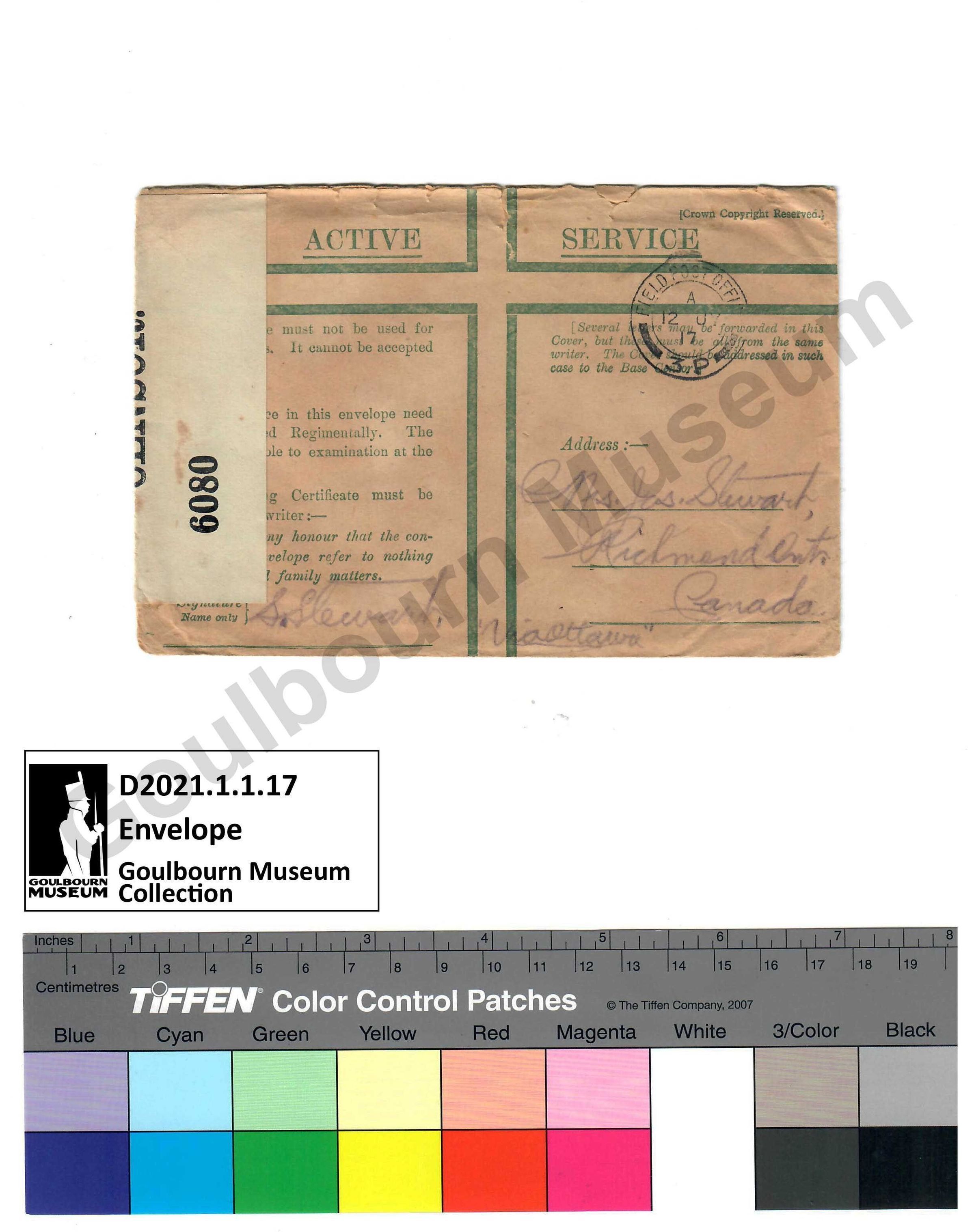 Digital Artifact: Empty envelope made from paper, marked in pencil. Active Service addressed to Mrs Jas. Stewart, Richmond ON, Postmarked Field Post Office 12 JY 17.Subject Person/Organization