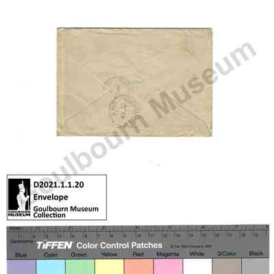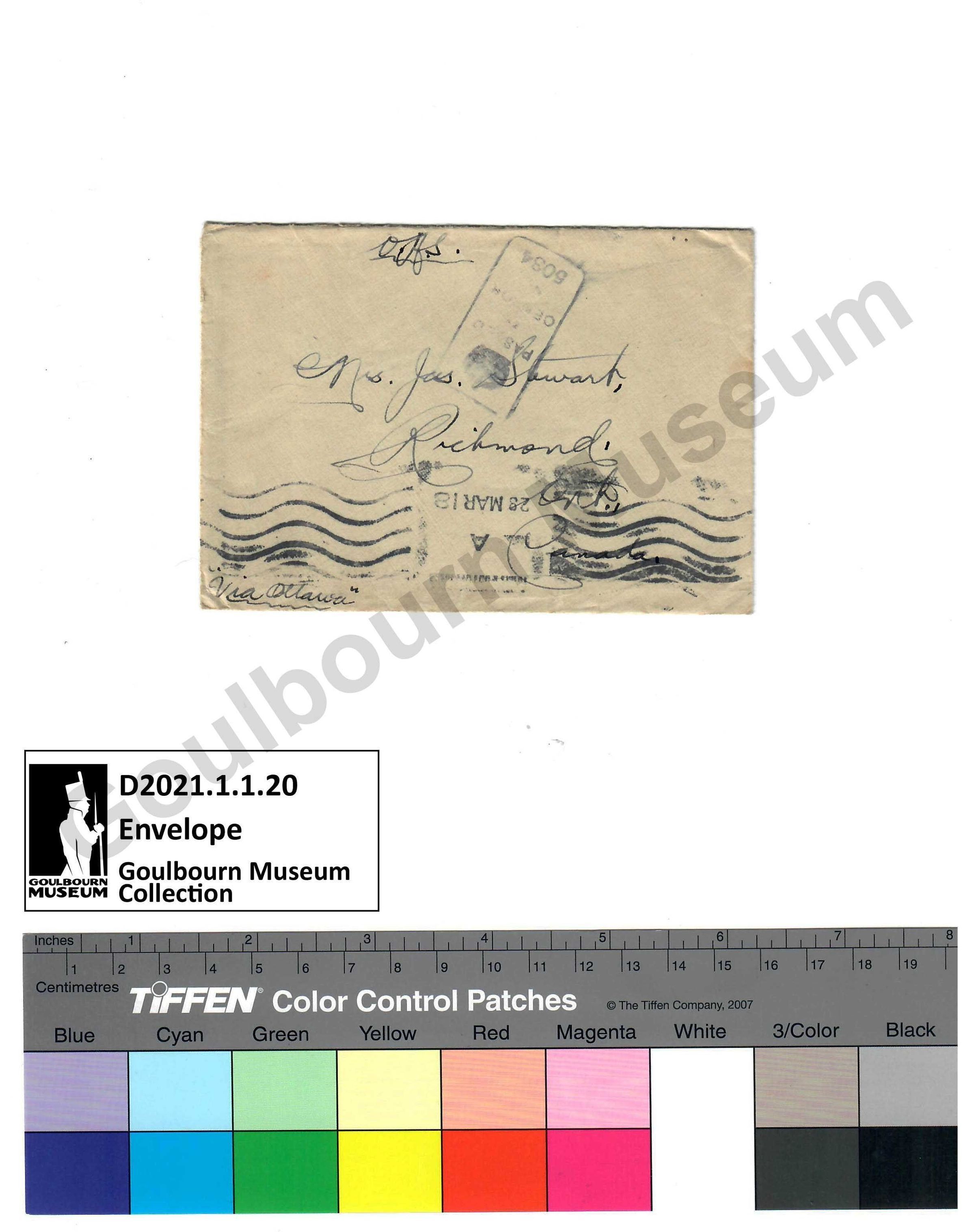 Digital Artifact: One empty envelope made from paper, marked in black ink. Addressed to Mrs. James Stewart, Richmond ON, Postmarked 28 March 18.Subject Person/Organization