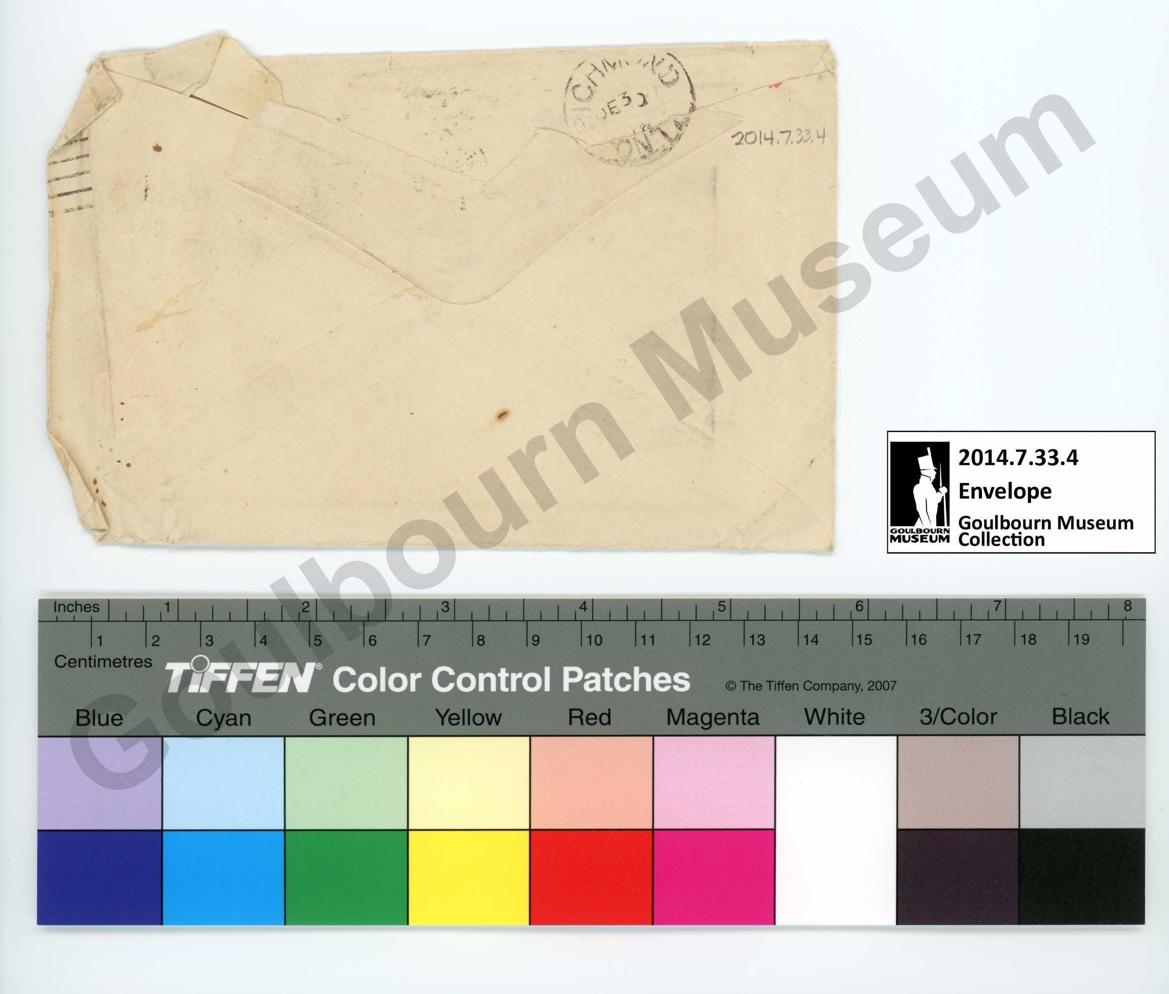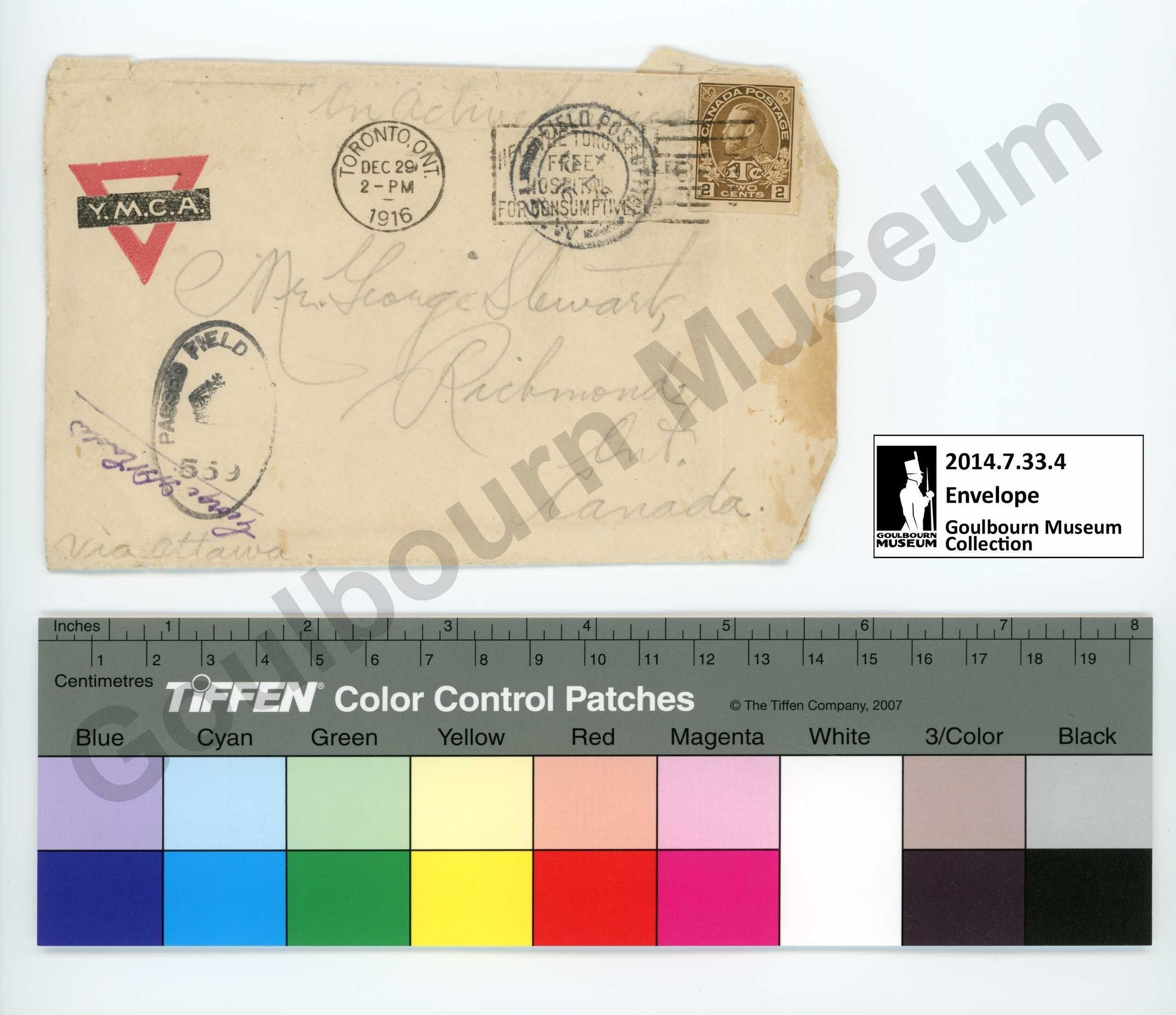 This object is a tan envelope made of a sheet of paper which has been folded into shape. It is held together with an unknown adhesive. There are three inscriptions handwritten on the front in pencil, rendered in cursive. At the center it reads "Mr. George Stewart, Richmond, Ont. Canada". At the proper bottom right corner it reads "Via Ottawa". At the top center of the front it reads "On Archive". An additional, illegible, inscription is rendered in blue ink at the proper bottom right corner of the front; this blue inscription is underlined and appears upside down in relation to the envelope. At the proper top right corner is a printed black and red Y.M.C.A. logo. At the proper top left corner of the front there is a brown rectangular two-cent postage stamp which bears a lateral profile of a male face, facing to the proper right. There are four rubber stamp imprints on the front rendered in black ink. At the proper bottom left is an oval containing the words "PASSED FIELD" and a crown in the center. At the top center is a circular stamp with the words "TORONTO ONT" within. At the proper top left corner there is a circular stamp with the words "FIELD POST" at top; this circular stamp is overlain by a rectangular stamp in which the word "FREE" appears roughly centered, along with horizontal lines to the proper left. The horizontal lines of the rectangular stamp overlie the postage stamp.