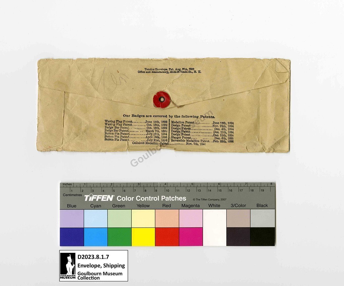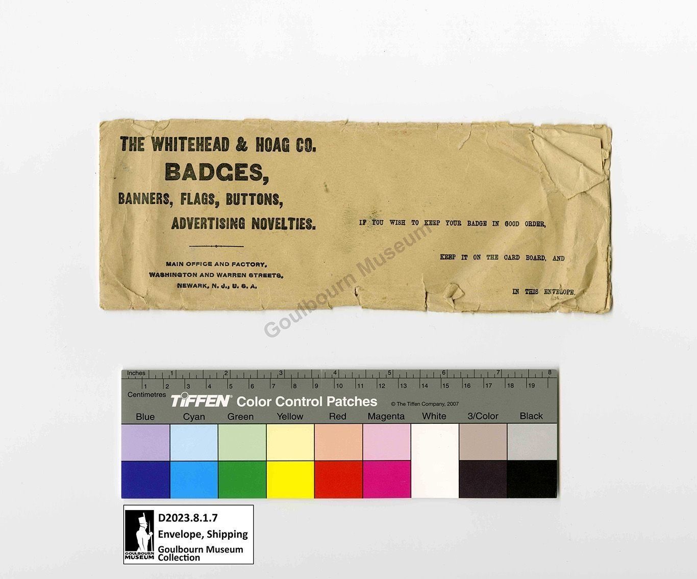 Brown coloured paper envelope used by The Whitehead & Hoag Co. to package and ship badges used by the Stittsville Orange Young Britons. The front of the envelope has the following text along the left side, "Whitehead & Hoag Co." "Badges," "Banners, Flags, Buttons," "Advertising Novelties." "Main Office and Factory," "Washington and Warren Streets," "Newark, N.J., U.S.A." On the right side of the envelope where typically the address would be placed is the following text, "If you wish to keep your badge in good order," "Keep it on the card board, and" "in the envelope." The reverse of the envelope has a round red coloured cardboard tie to close and secure the envelope. The top of the envelope has the following text centred along the top edge, "Tension Envelope, Pat. Aug. 2[8]th, 1990" "Office and Manufactory, 22-24-26 Reada St. N.Y." The bottom of the envelope has a list described as, "Our Badges are covered by the following Patents."Context