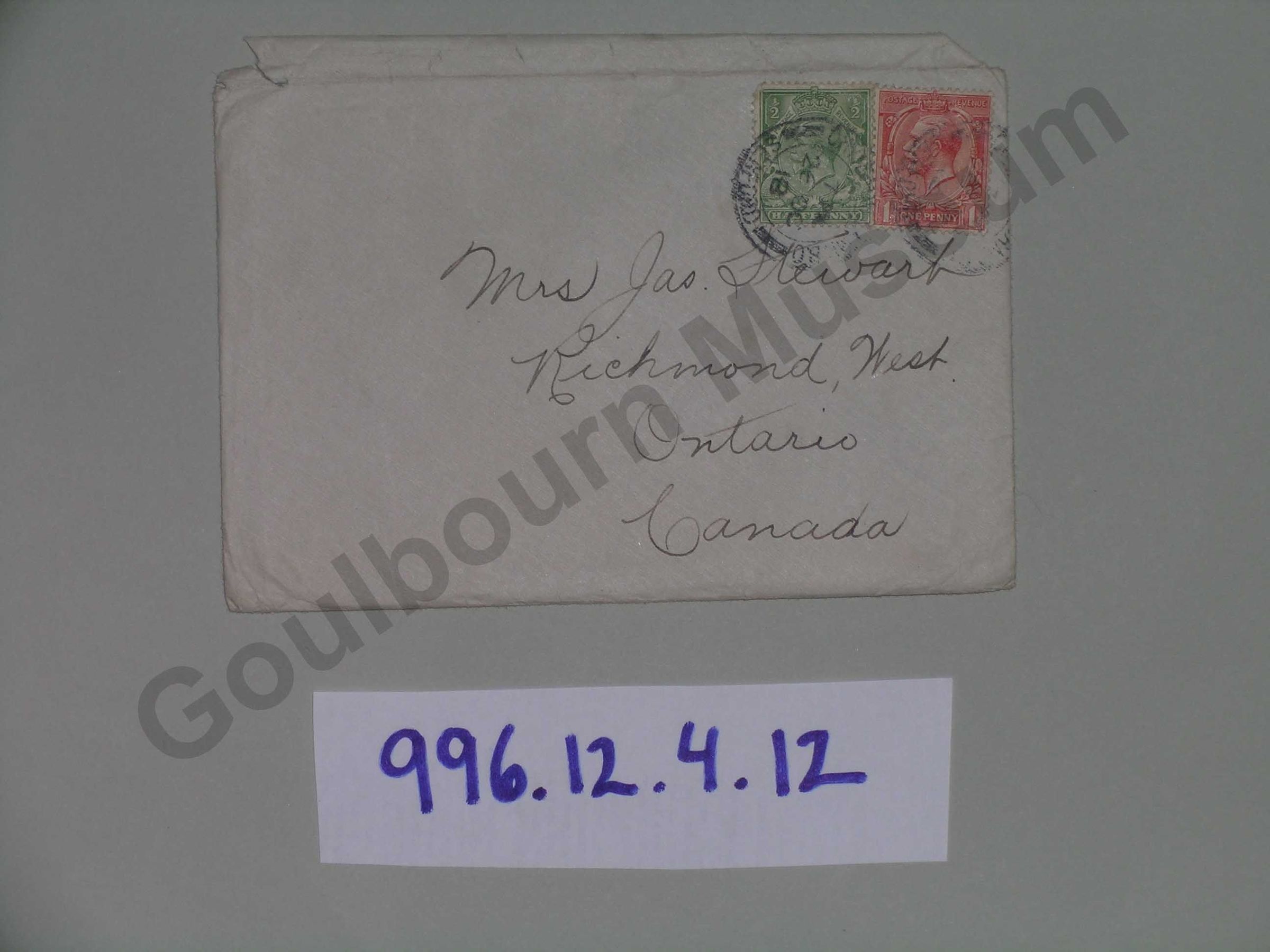 Paper envelope with two stamps of King George, addressed to Mrs. Jas Stewart. Richmond, West. Ontario Canada.Subject Person/Organization