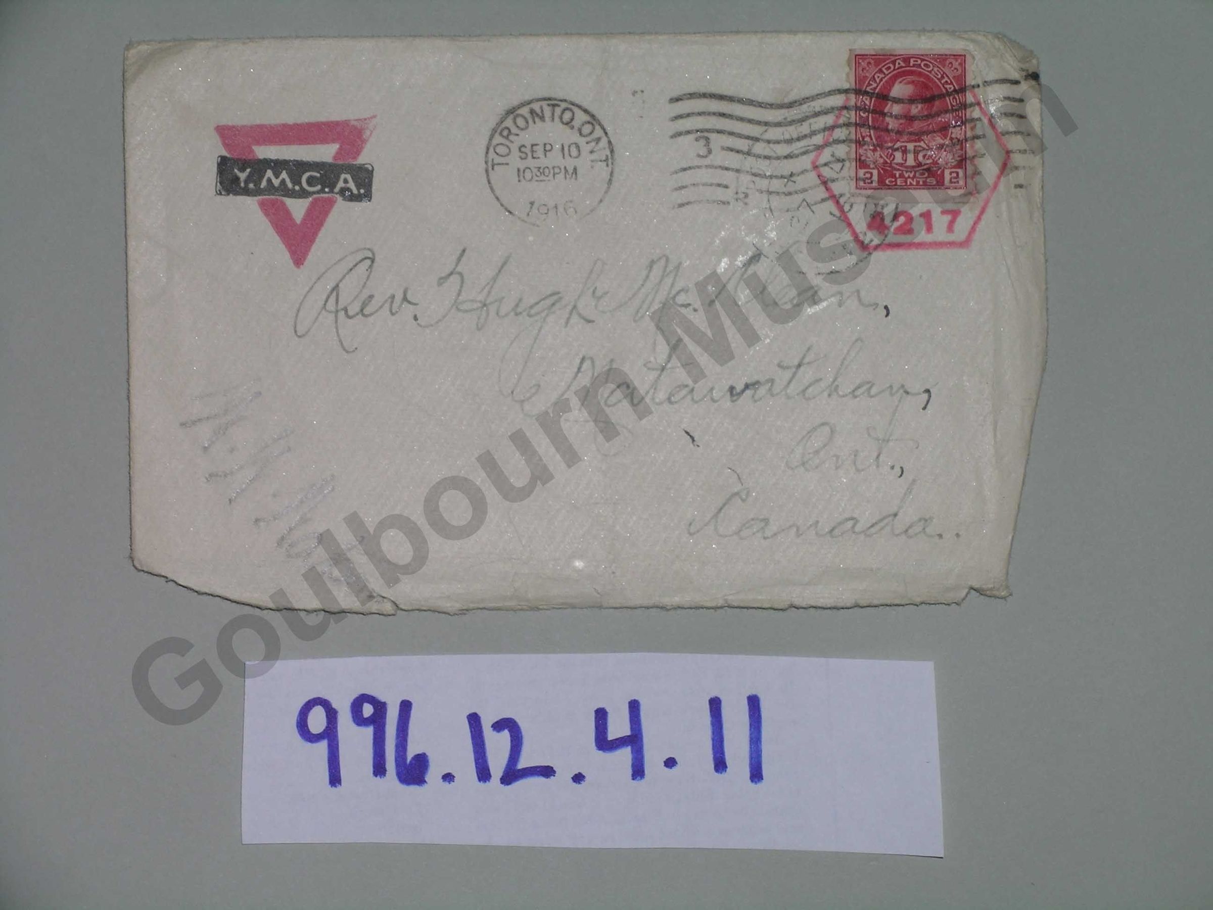 Paper envelope with the YMCA triangular letterhead, stamped "Toronto, On. Sept. 10, 10:30 pm 1916." Addressed to Rev. Hugh McClean, Matawatchan, Ont. Canada.Subject Person/Organization