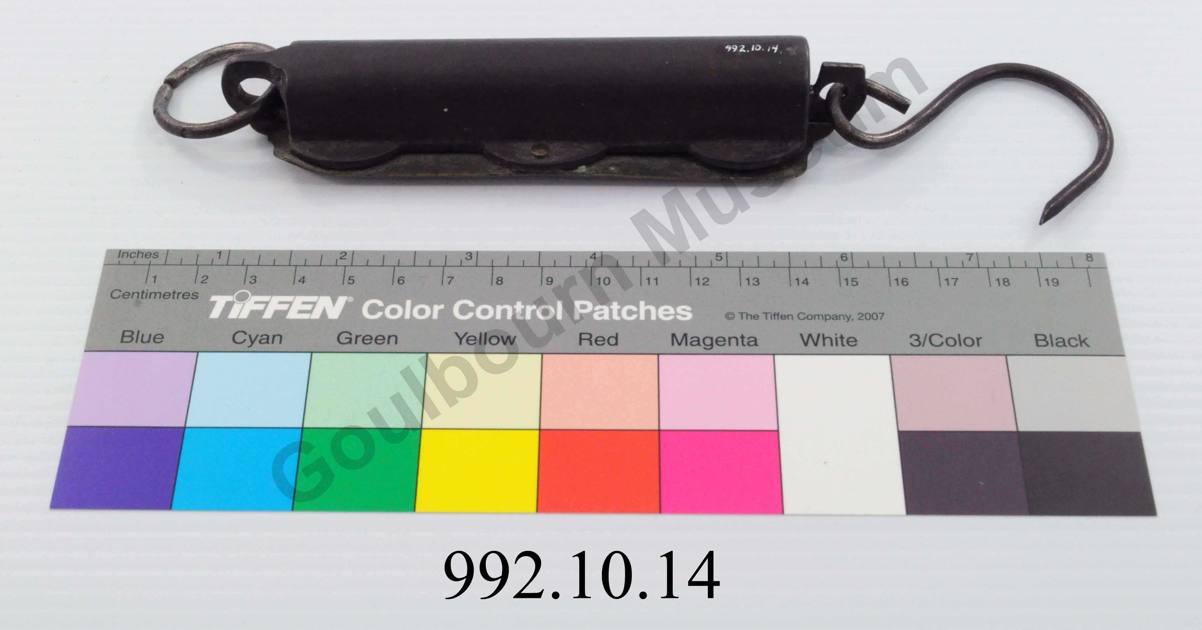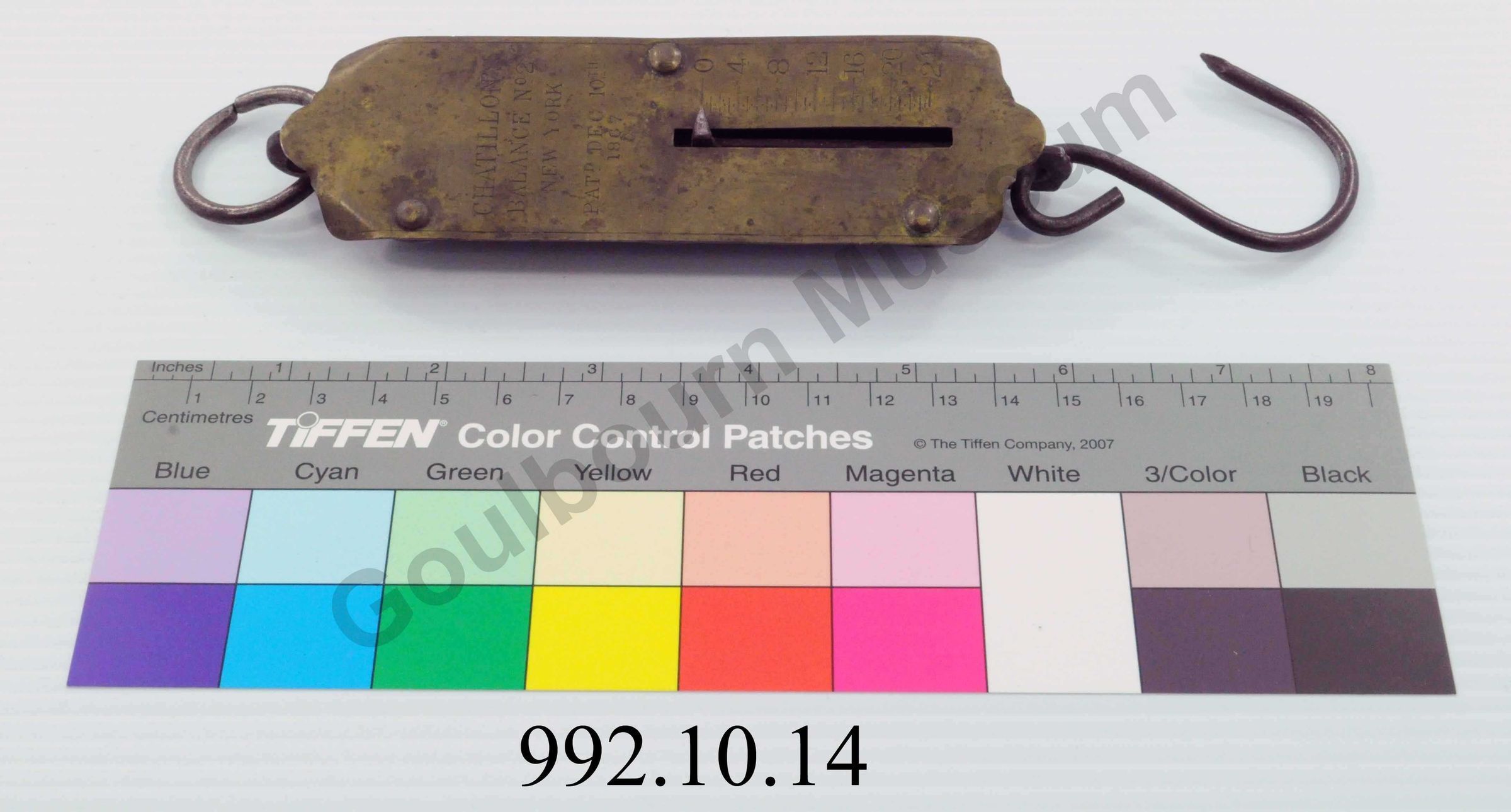 One spring scale. “Chatillon’s balance no 2 New York”. The scale has a hook on one end and a ring on the other. A number scale is on one side of the face of the scale.