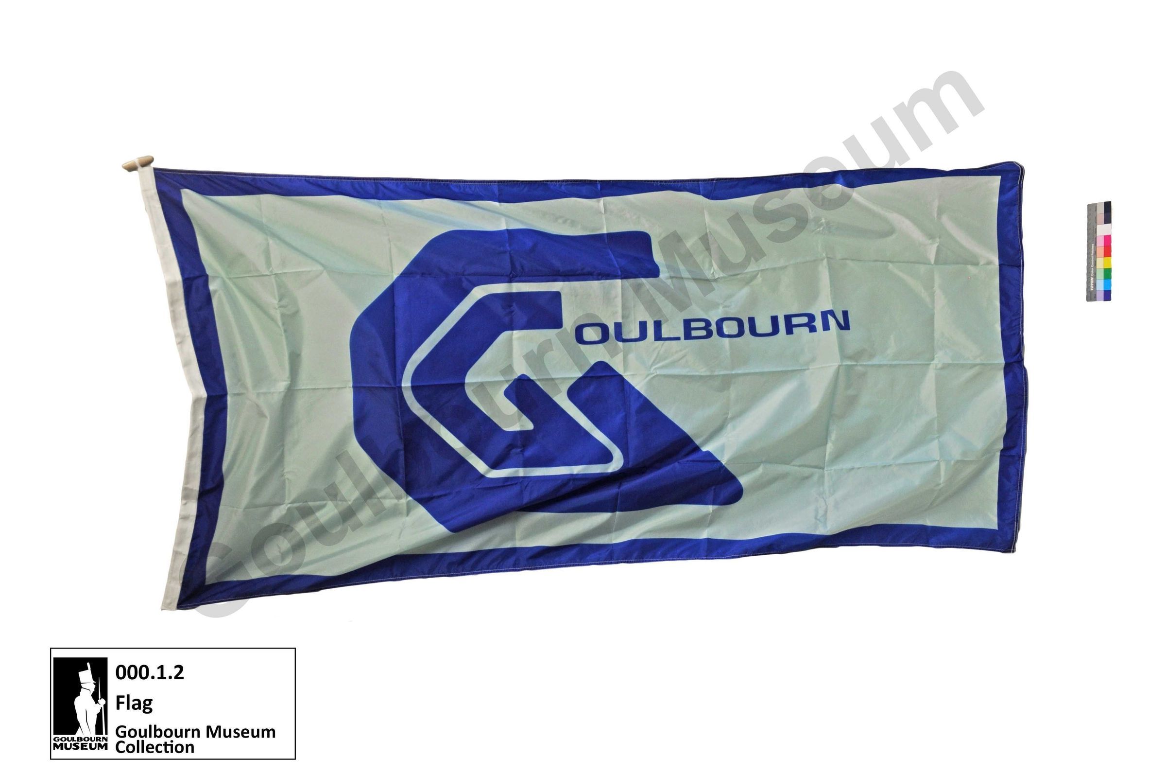One rectangular shaped fabric flag displaying the Goulbourn Township municipal logo. The flag has a white fabric reinforced edge on the proper right side, including a wooden toggle at the top and a fabric rope at the bottom edge to secure the flag to a flag pole. The design of the flag includes an exterior dark blue coloured rectangle border with an interior rectangle that is light blue in colour. In the centre of the flag there is a uniquely designed letter "G" that is representative of the Goulbourn Township logo and is the focal point of the flag. The "G" is centered inside the light blue rectangle and the remaining letters of Goulbourn, "OULBOURN" are oriented to the proper left of the "G" in smaller capital letters. This flag was owned by Jack MacKenzie and accompanied him on a ski trip to the North Pole in 1999 to celebrate "Year of the Older Person." During this expedition MacKenzie achieved a Guinness World Record as the oldest person to ski this distance to the North Pole.Context