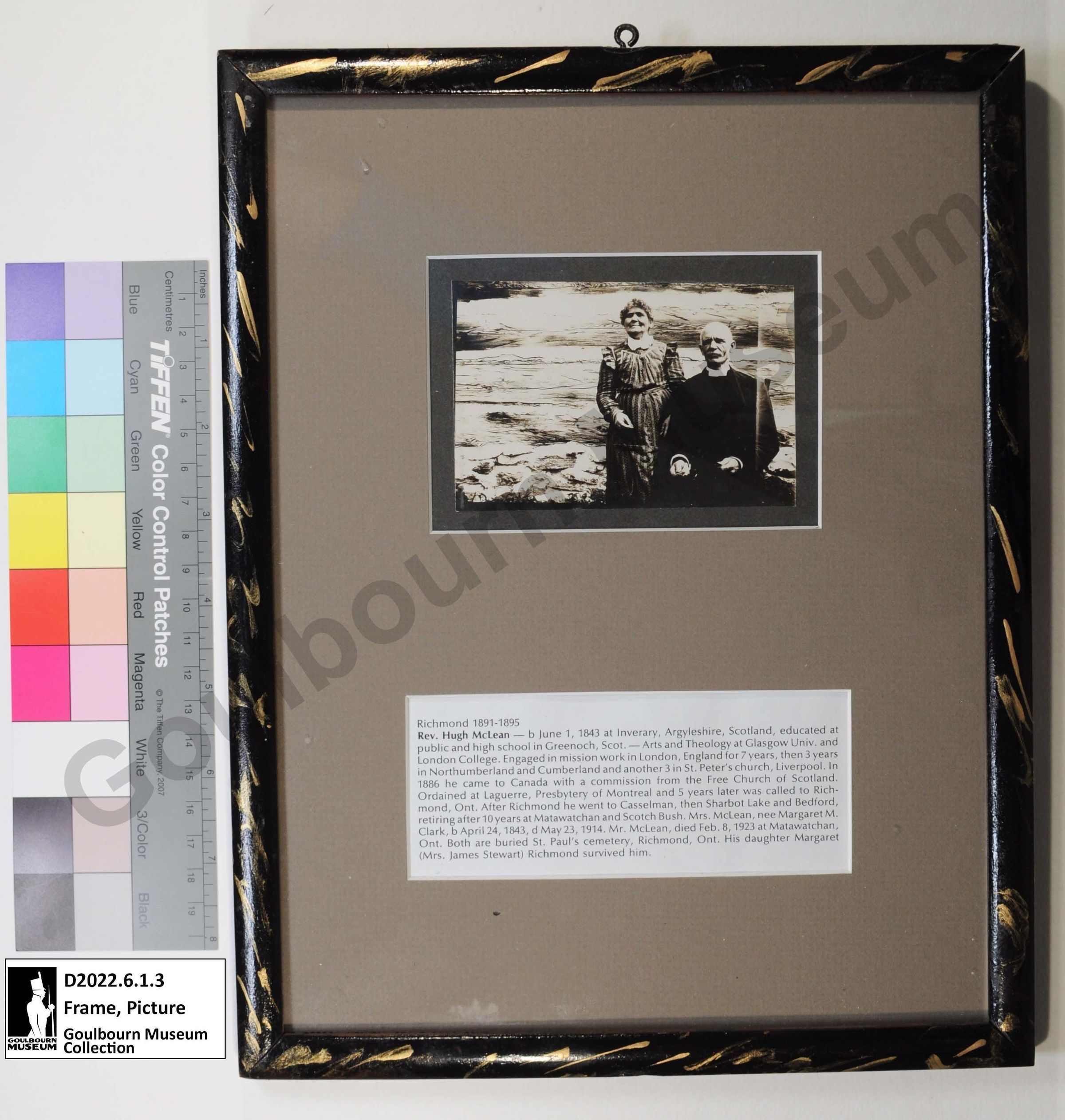 Rev. Hugh McLean - b [born] June 1, 1843 at Inverary, Argyleshire, Scotland, educated at public and high school in Greenoch, Scot. [Scotland] - Arts and Theology at Glasgow Univ. [University] and London College. Engaged in mission work in London, England for 7 years, then 3 years in Northumberland and Cumberland and another 3 in St. Peter's Church, Liverpool. In 1886 he came to Canada with a commission from the Free Church of Scotland. Ordained at Laguerre, Presbytery of Montreal and 5 years later was called to Richmond, Ont. After Richmond he went to Casselman, then Sharbot Lake and Bedford, retiring after 10 years at Matawatchan and Scotch Bush. Mrs. McLean, nee Margaret M. Clark, b [born] April 24, 1843, d [died] May 23, 1914. Mr. McLean, died Feb. 8, 1923 at Matawatchan, Ont. Both are buried St Paul's cemetery, Richmond, Ont. His daughter Margaret (Mrs. James Stewart) Richmond survived him.Notes