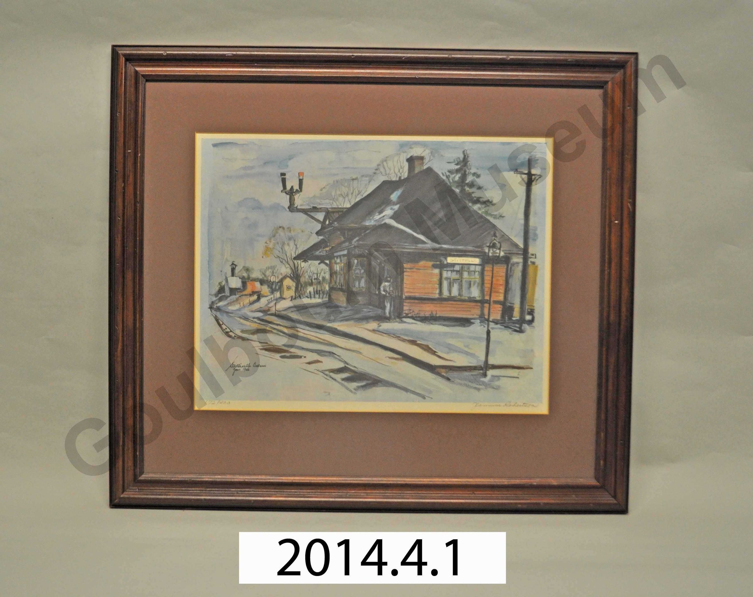 The painting is a water colour rendering of the Stittsville Train Station in winter in 1966. The picture shows the station with lights on in the snow, with a man leaning on the front porch in winter gear. Houses or buildings stretch off into the distance behind the station. The matboard surrounding the image is a beige colour. The wood is stained dark brown.Artwork Details