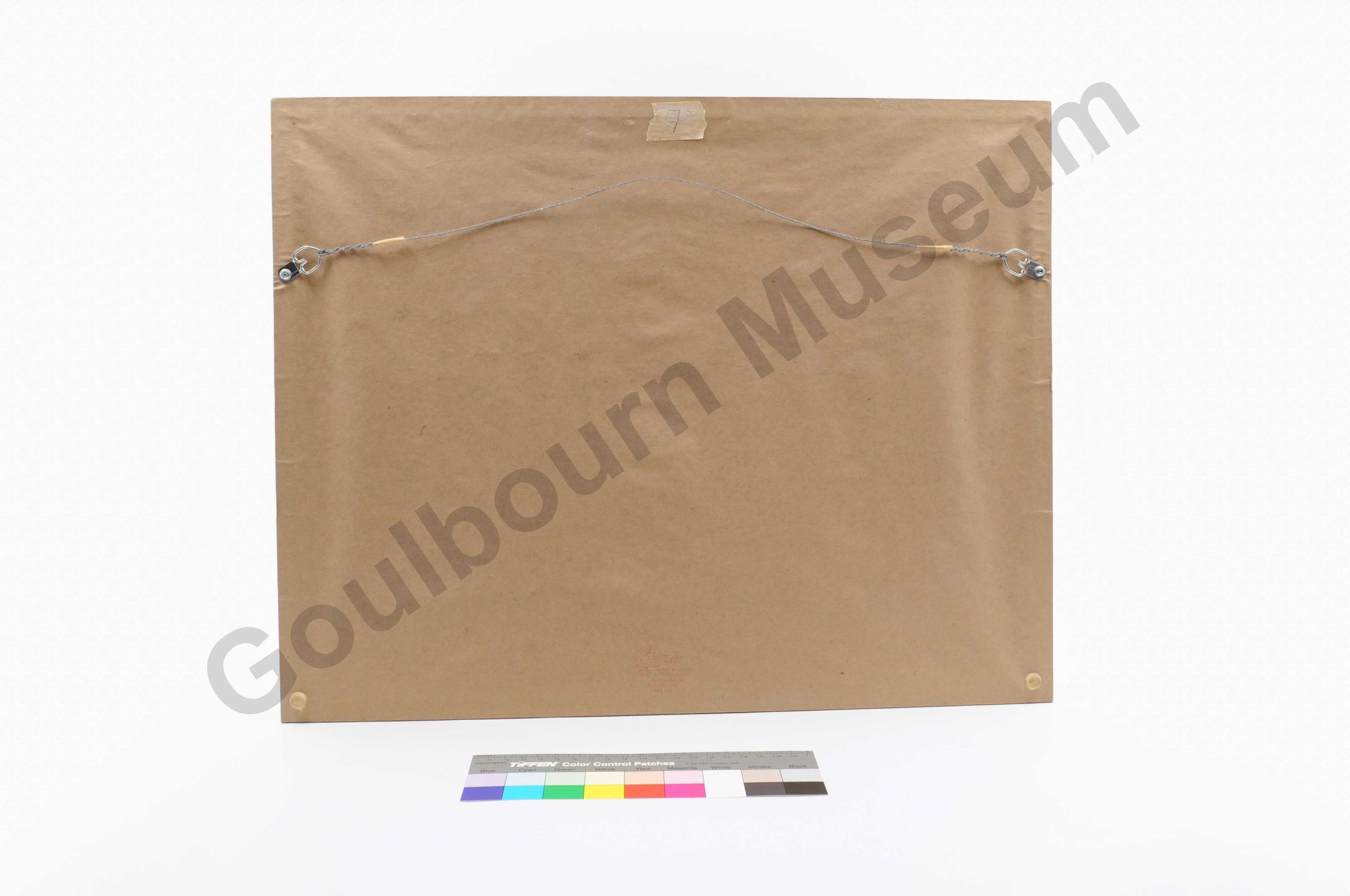 On the backing paper on the back there is an imprint of a red ink stamp at the bottom center. The word "Stittsville" is depicted with the S overtop a stylistic element. The stamp reads "Stittsville PICTURE FRAMING & STUDIO GALLERY Main St. Box 392 Stittsville. Ont. K2S 1A5Context