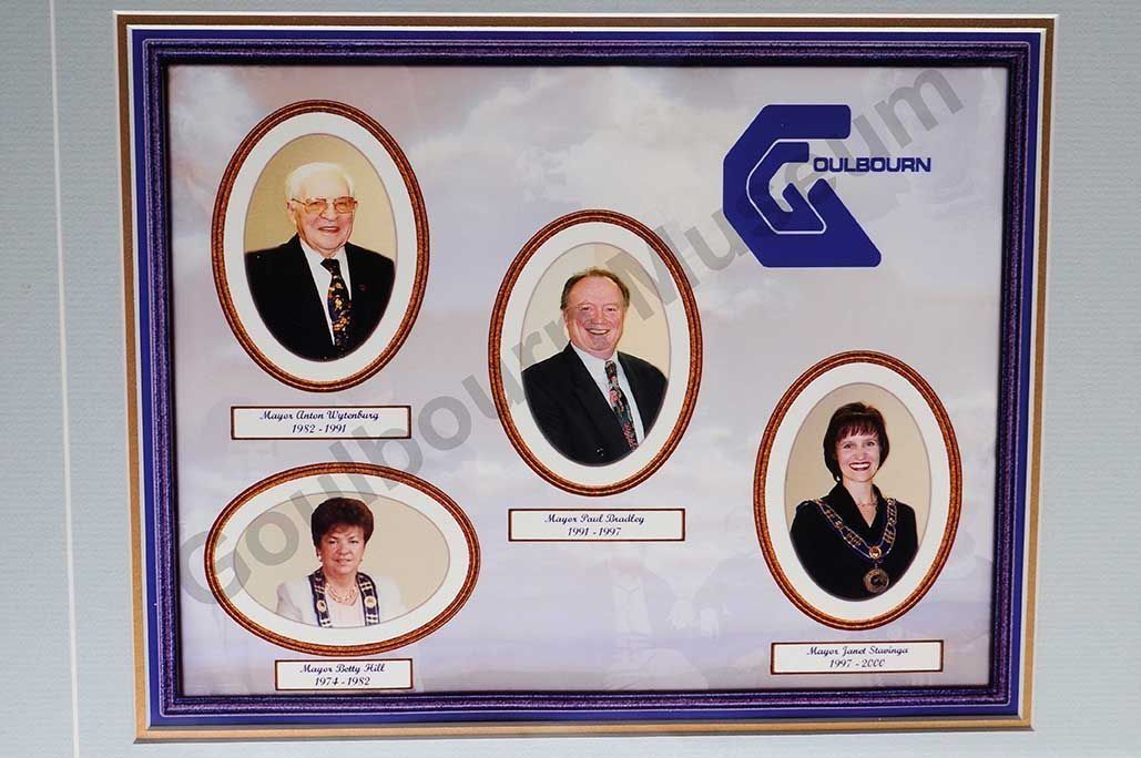 The collage on the front at top left has a purple/white background featuring images of persons. The word "Goulbourn" with a stylized G is at top right. There are four photos of persons depicted in gold oval frames. A white box with blue text is below each photo. From left to to right these read "Mayor Anton Wytenburg 1982-1991" "Mayor Betty Hill 1974-1982" "Mayor Paul Bradley 1991-1997" "Mayor Janet Stavinga 1997-2000"