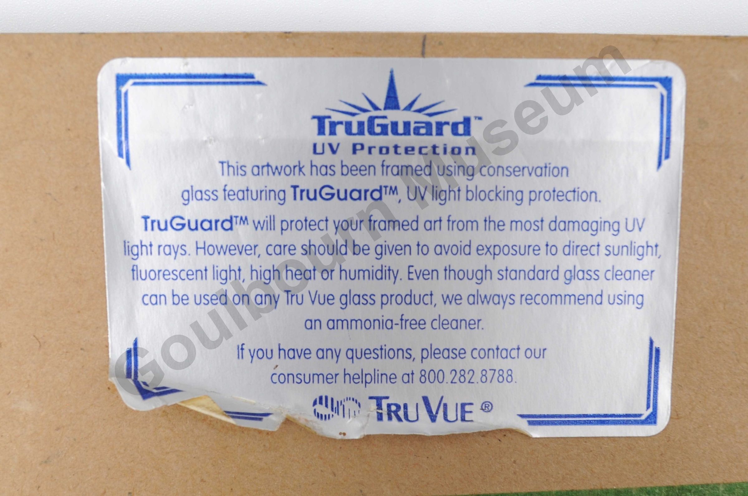 On the backing paper on the back there is a white and blue sticker at the top center which reads "TruGurard UV Protection This artwork has been framed using conservation glasses featuring TruGuard, UV light blocking protection. Truguard will protect your framed art from the most damaging UV light rays. However, care should be given to avoid exposure to direct sunlight, fluorescent light, high heat or humidity. Even though standard glass cleaner can be used on any Tru Vue glass product we always recommend using an ammonia-free cleaner. If you have any questions, please contact our consumer helpline at 800.282.8788. TruVue"Context
