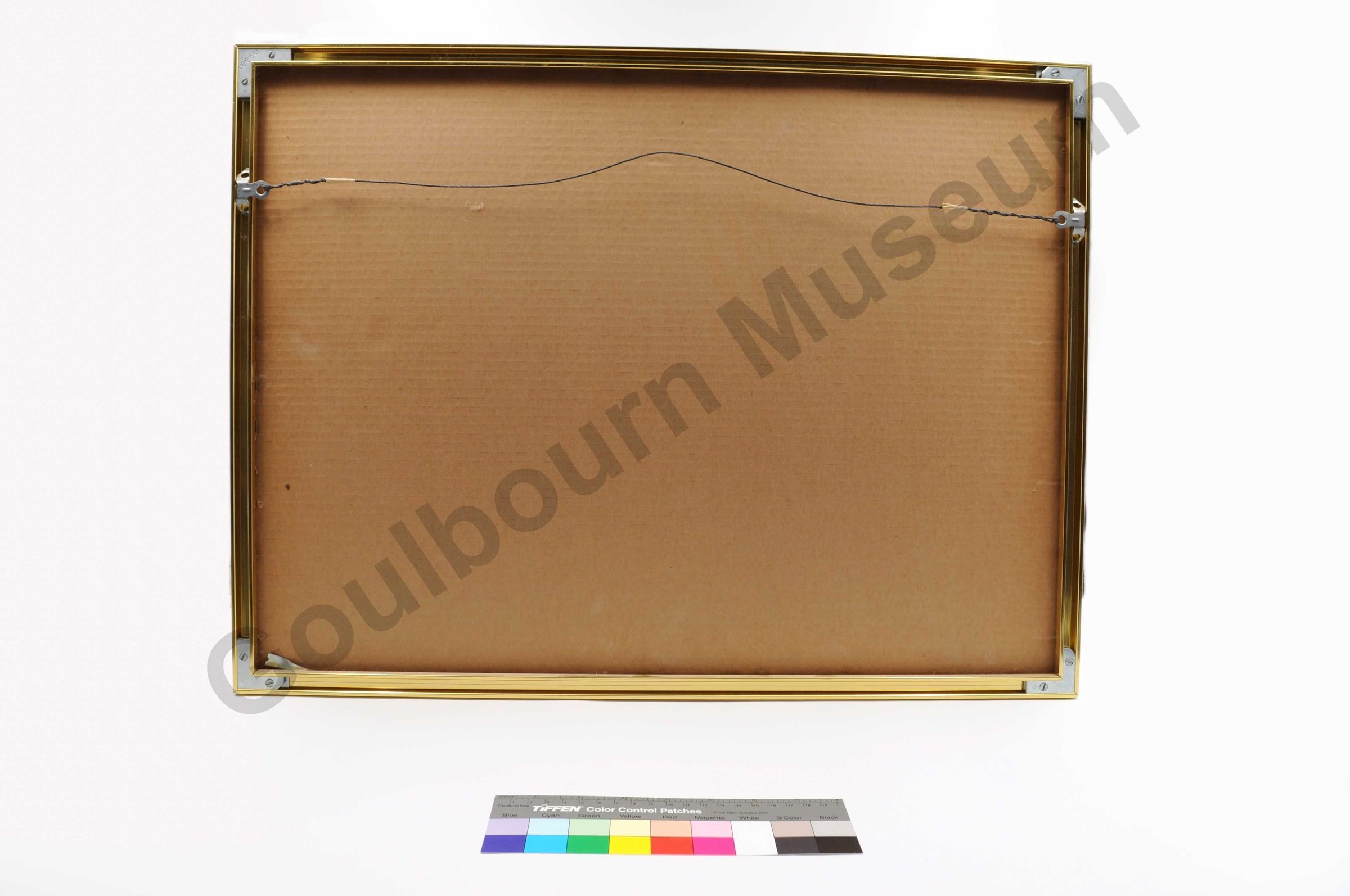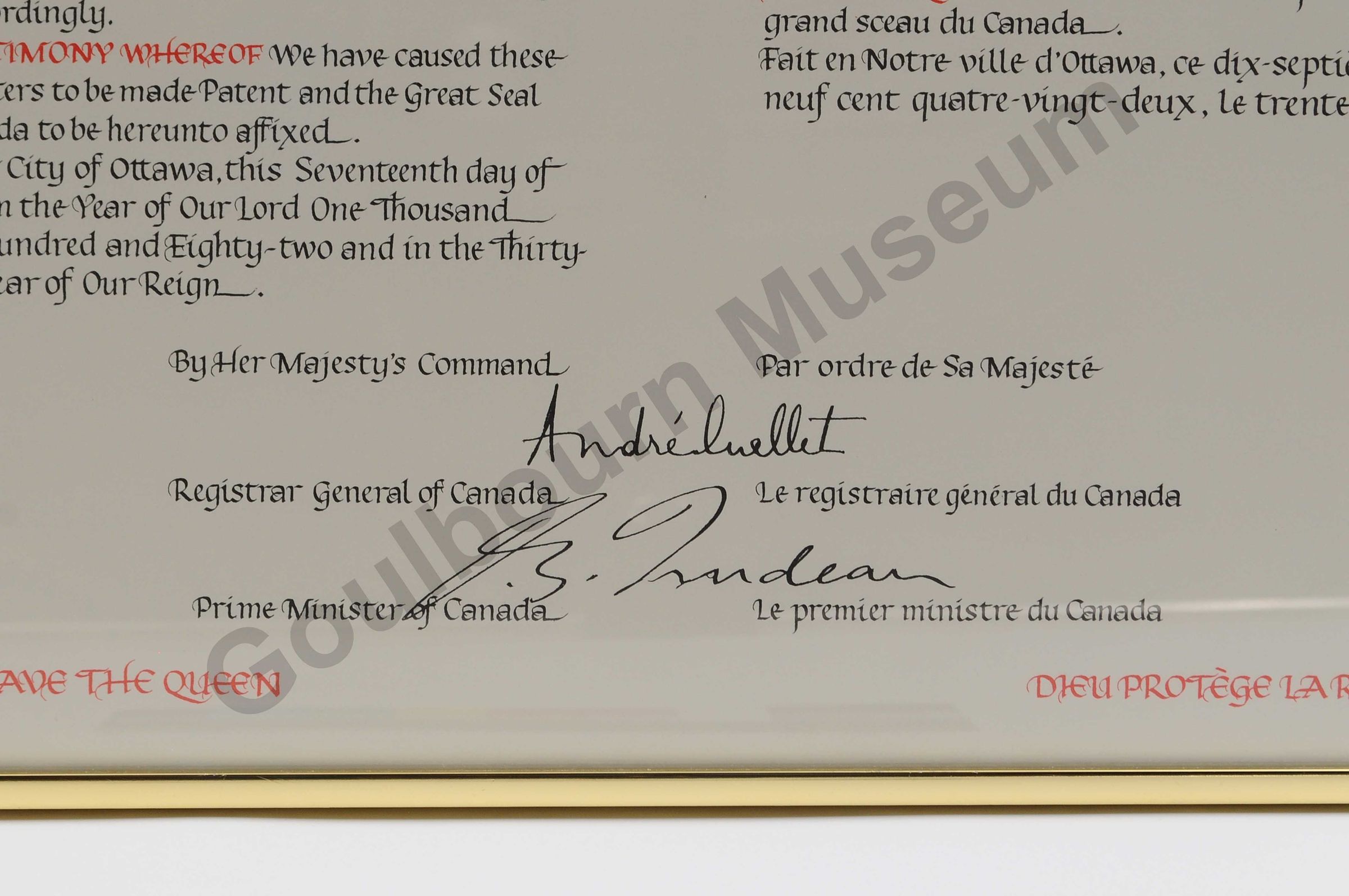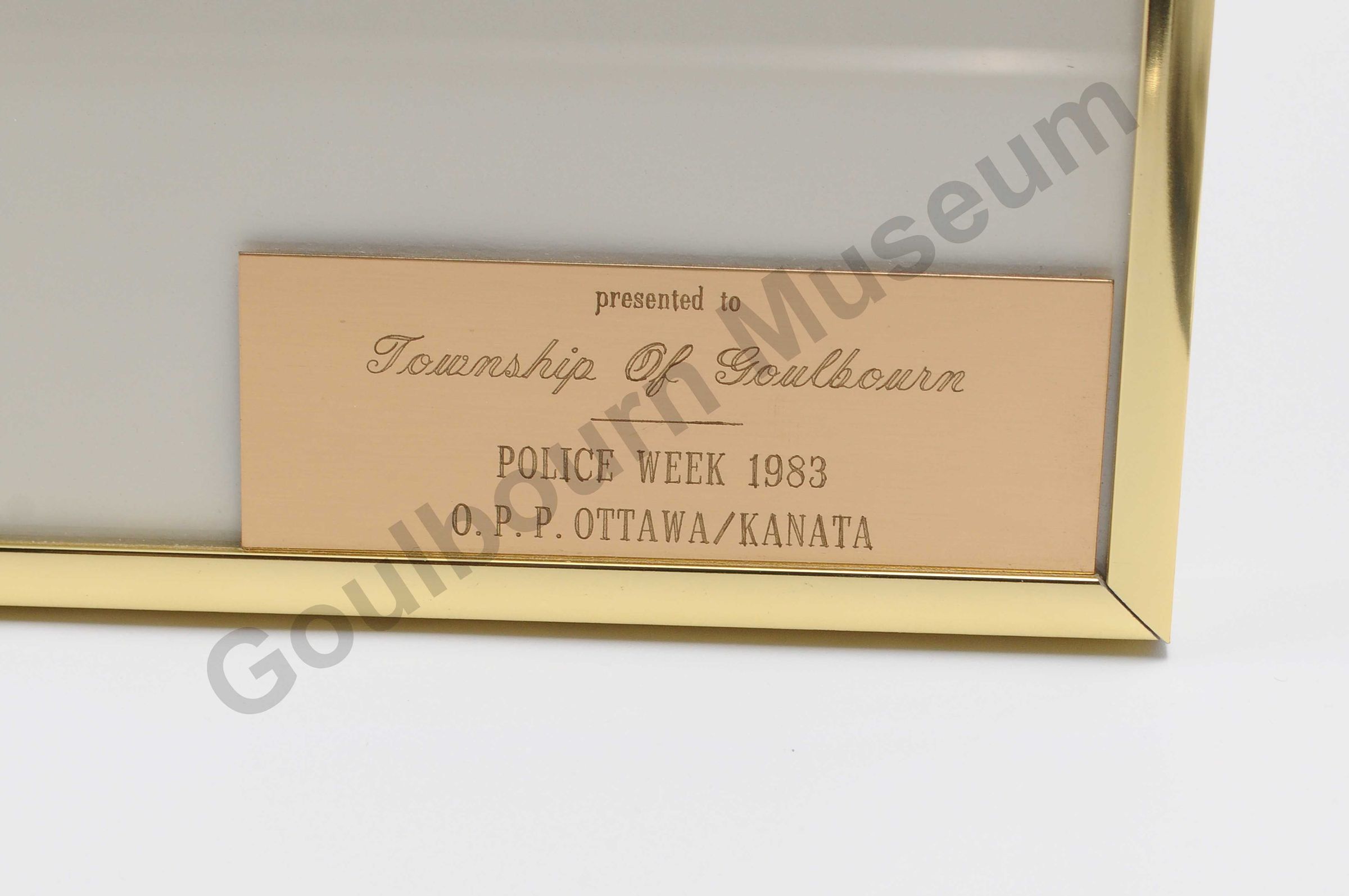 This item is a metal golden framed proclamation from Queen Elizabeth the Second. The proclamation is written in English (on the left side of the frame) and French (on the right side of the frame) in three coloured font; gold yellow, red and black. In the middle of the frame, along the top edge is a coloured insignia of the Royal coat of arms. Under this is the signature of Queen Elizabeth the Second. In the bottom left corner is a silver coloured round image of a wax seal representing Queen Elizabeth the Second. In the bottom right corner of the item is a metal gold name plate with the words etched in, "presented to Township of Goulbourn. Police Week 1983 O.P.P. Ottawa/Kanata." The reversed side of the item shows a cardboard backing under the metal frame. On the sides of the frame is the metal clasps that hold a thin metal wire, running horizontal of the frame, that holds the item up on walls and surfaces.Context