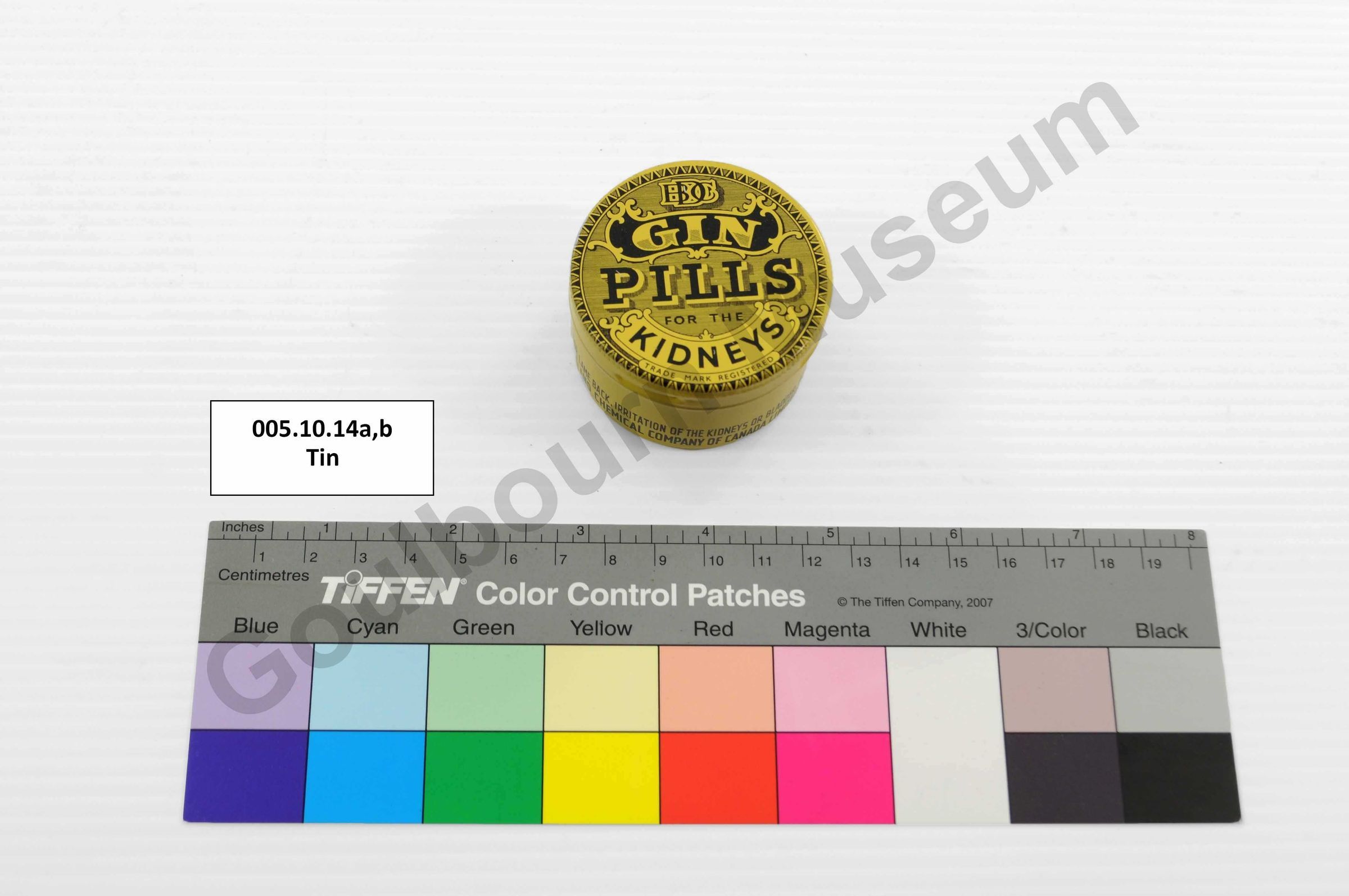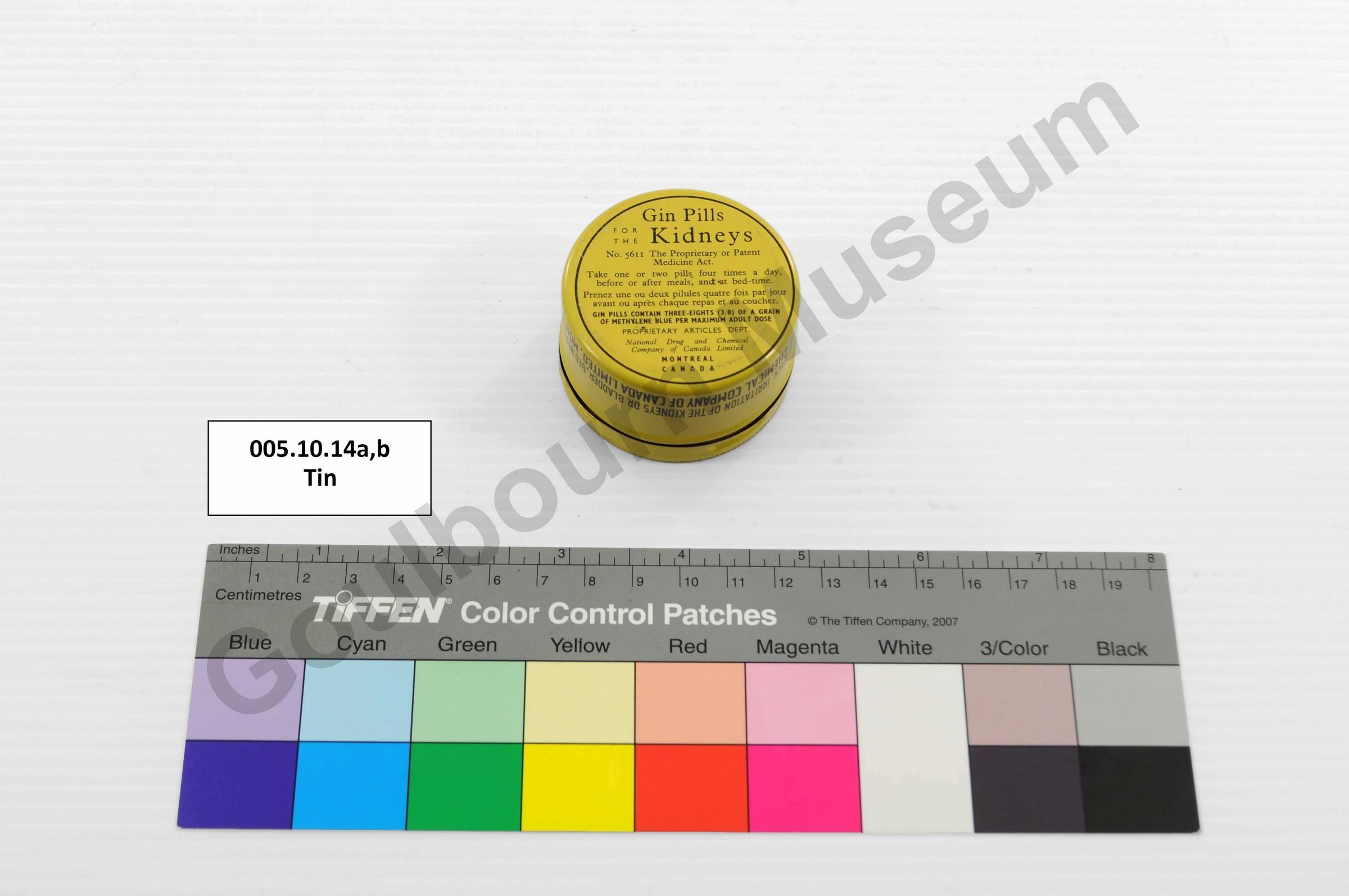 Yellow metal tin (empty) of Gin Pills for the Kidneys. These pills are recommened for lame back, irritation of the kidney or bladder, bed wetting, niucous deposition the urine. 40 pills National Drug and chemical company of Canada limited, Montreal, Canada.Collection