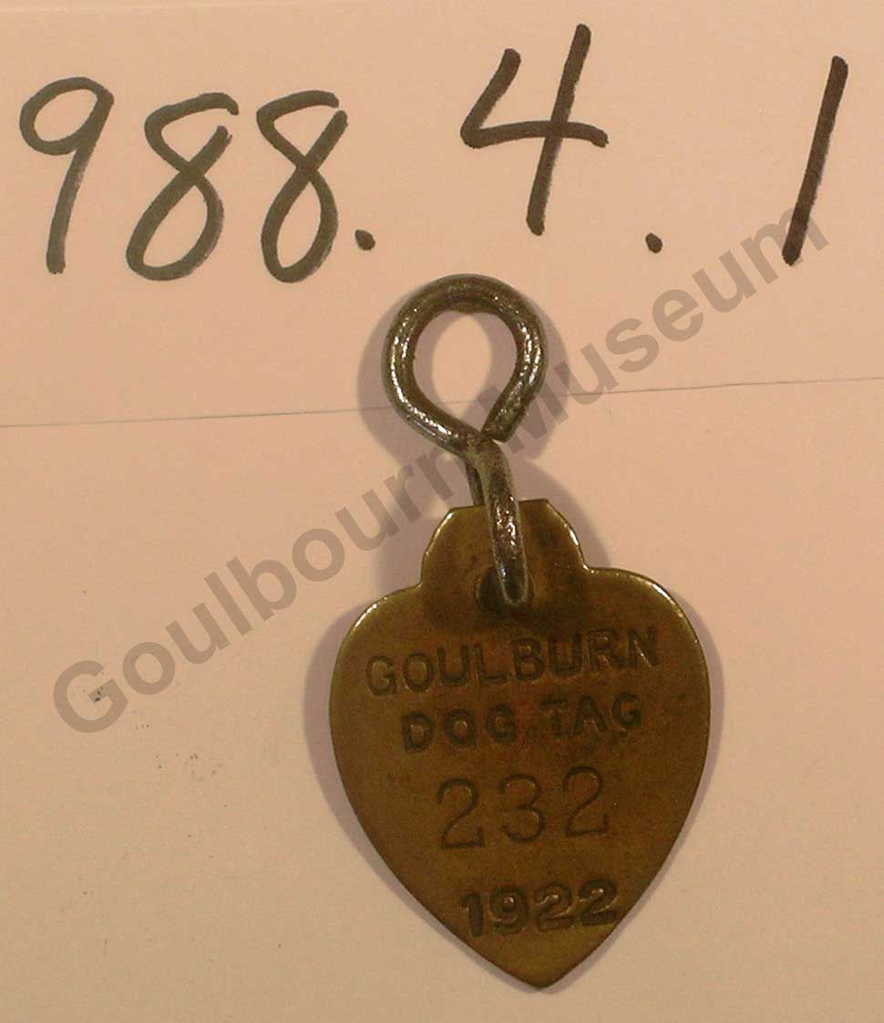 Heart-shaped brass dog tag with text that reads: "Goulbourn Dog Tag 232. 1922."