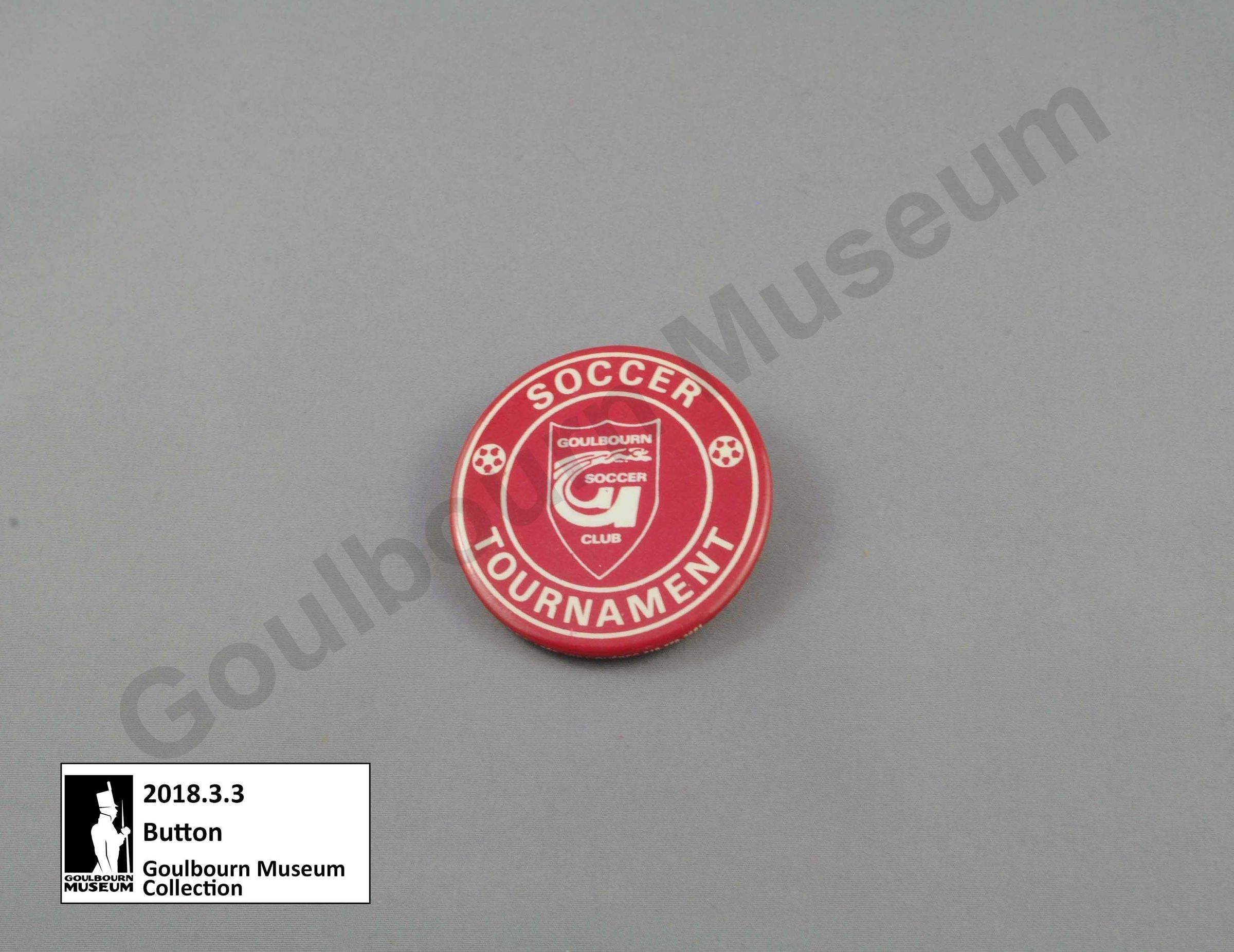 The object is a red button from the Goulbourn Township Soccer Club Tournament. On the recto side of the button is a graphic displaying the symbol of the Soccer club. As well as two soccer balls. The text Soccer Tournament is present on the button. Along the true bottom rim of the button is the text D.R.S Hull-Quebec 819-778-3681.Context