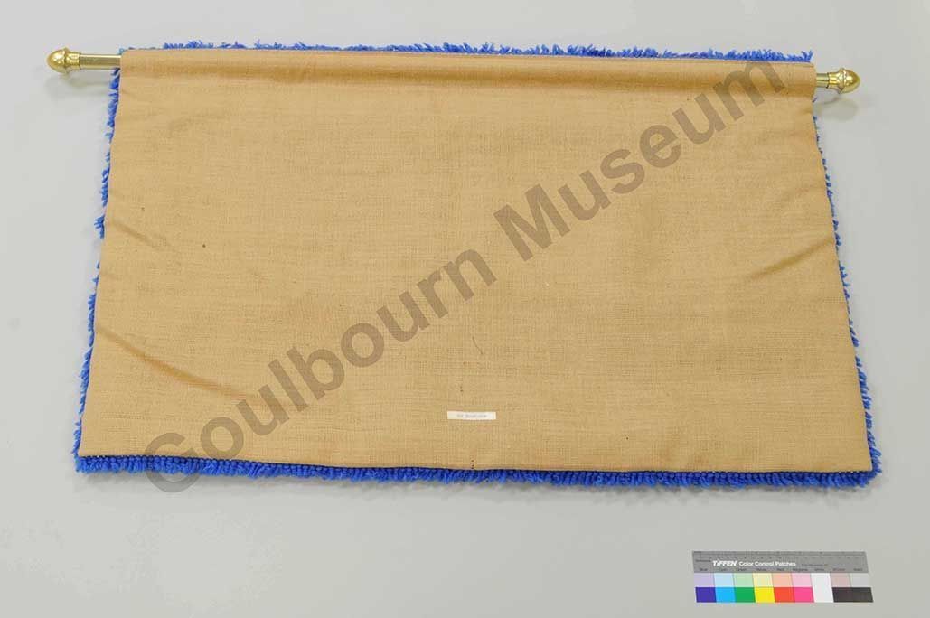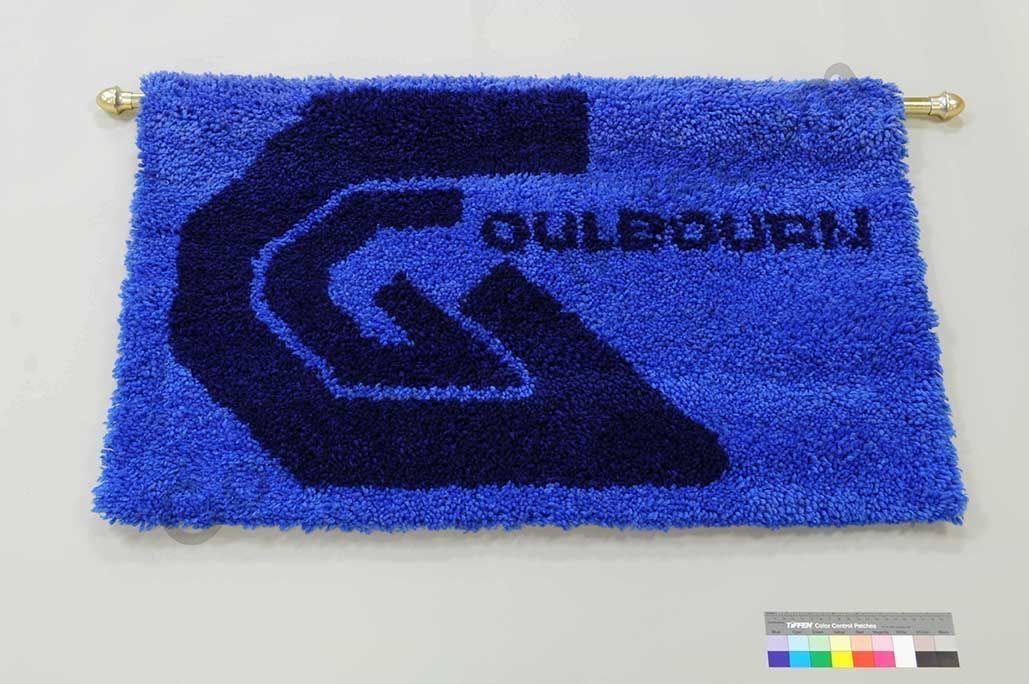 This rug hook or latch hook style wall hanging is comprised of many short lengths of yarn strands. It is attached to a metal rod, meant to be hung on the wall for display. The background colour of the design is a medium blue with a darker shade of navy blue used for the central design. A large stylized capital letter G extends to the top and bottom edges and in smaller letters the remaining word Goulbourn is displayed. The reversed side has been backed by a beige coloured fabric. A small white rectangular label is attached and has black font on it.Context
