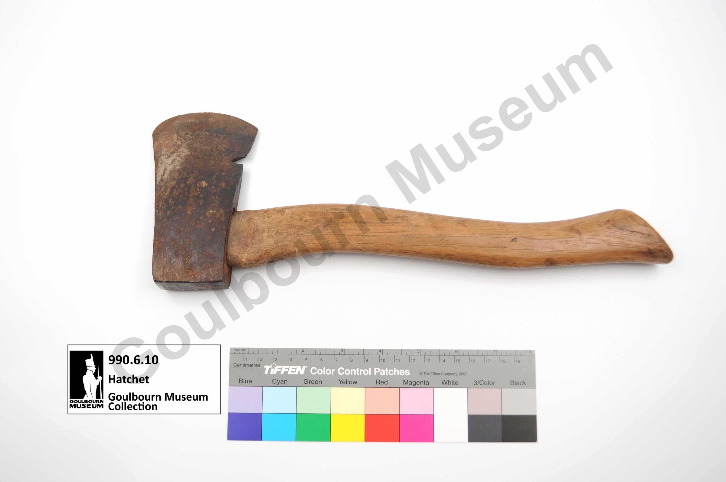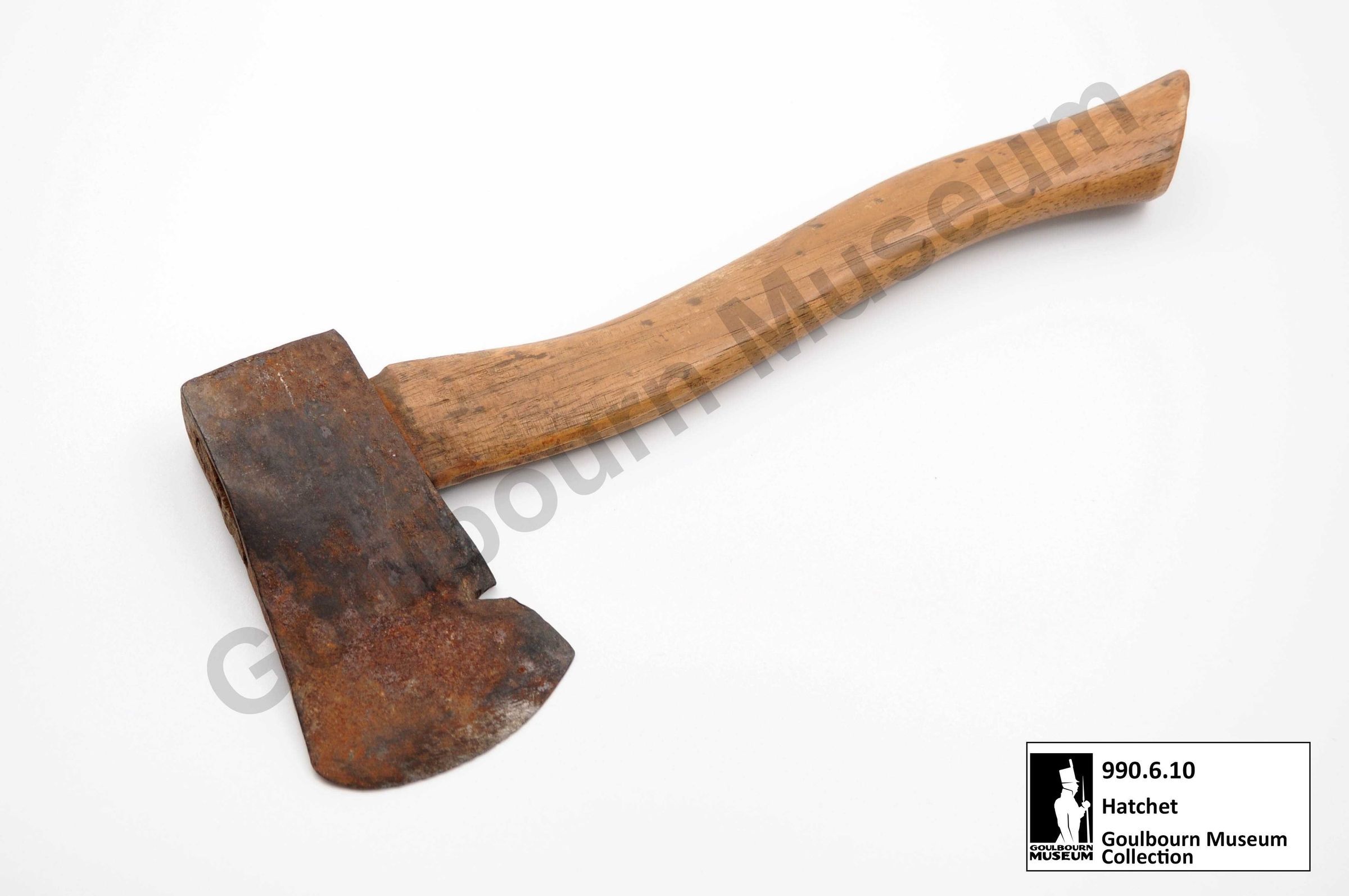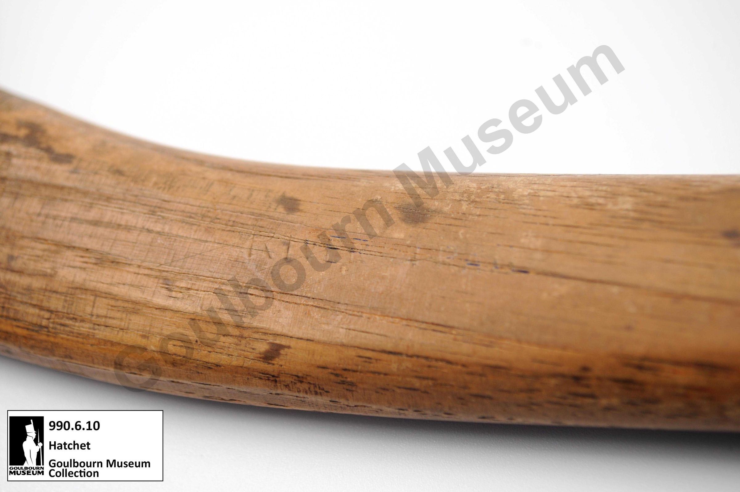 A hatchet tool with a carved wooden handle attached to a hatchet head. The metal hatchet head is dark in color with orange corrosion spots over approximately half of the surface area. The wooden handle is light brown colored with minor dark colored stains. The wooden handle slightly curves twice before being cut on an approximate 45 degree angle at the end. The hatchet head has a notch in the underside edge.