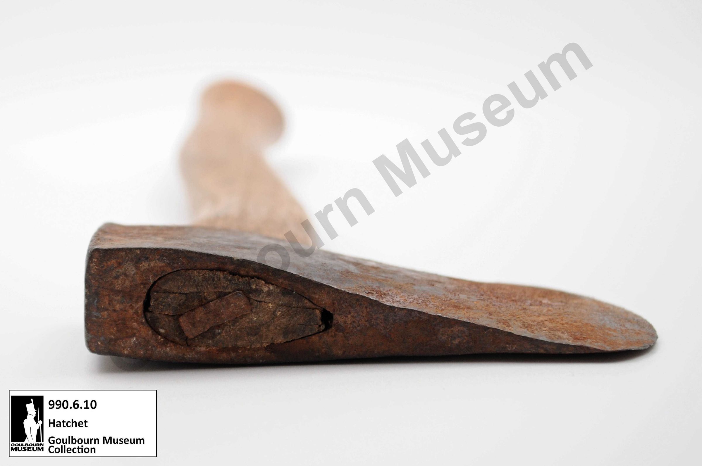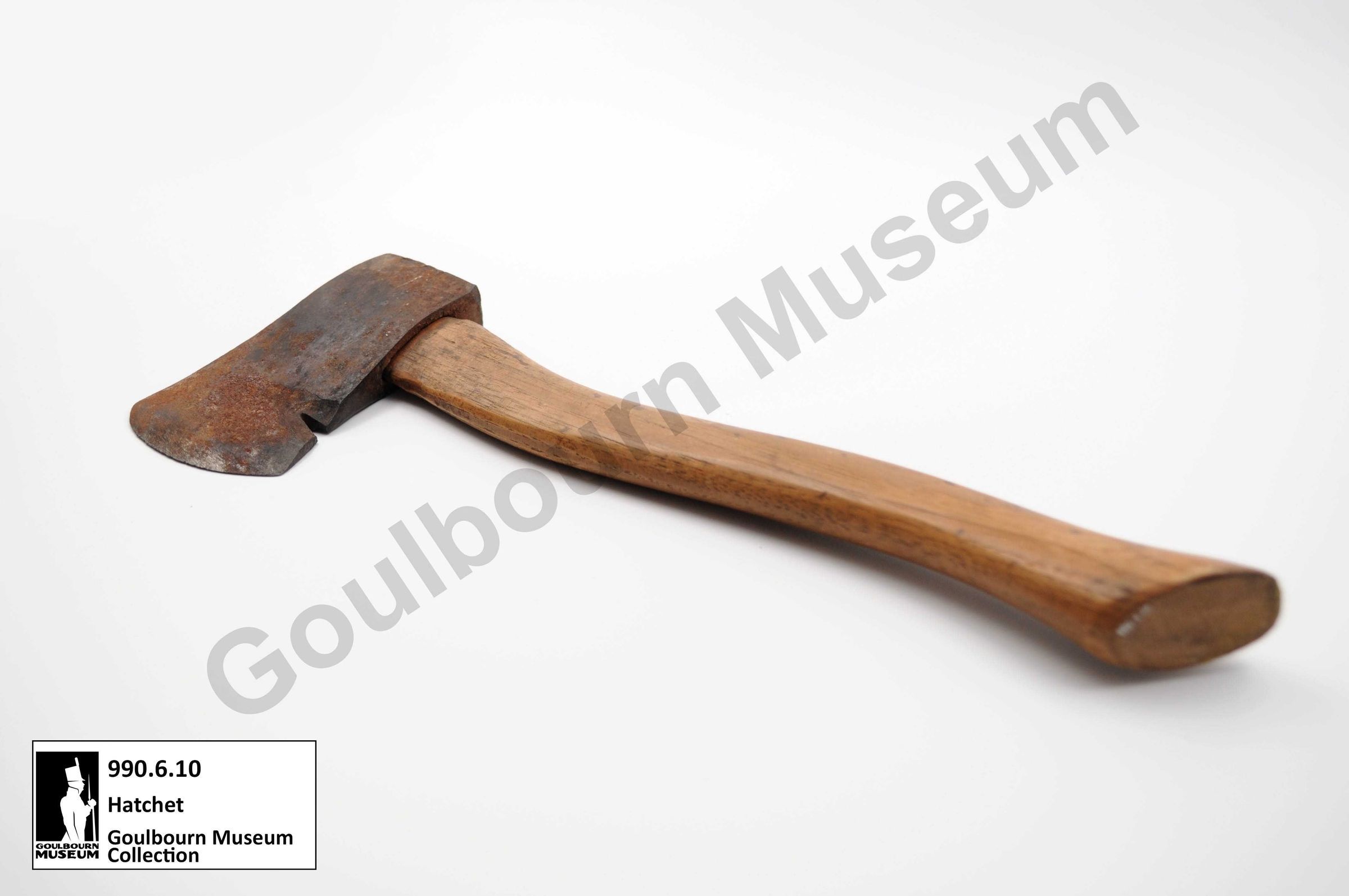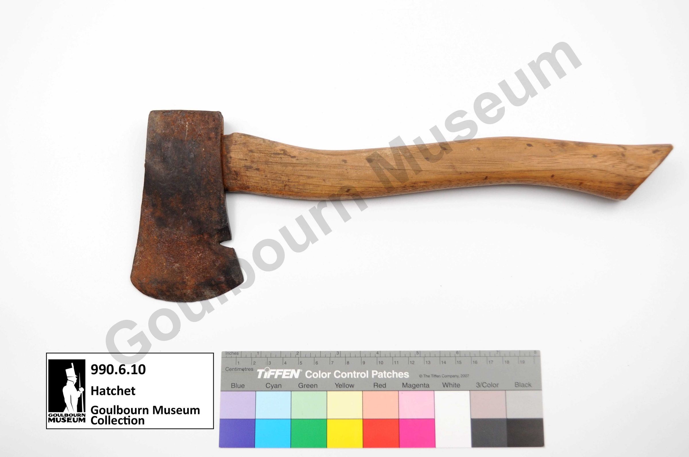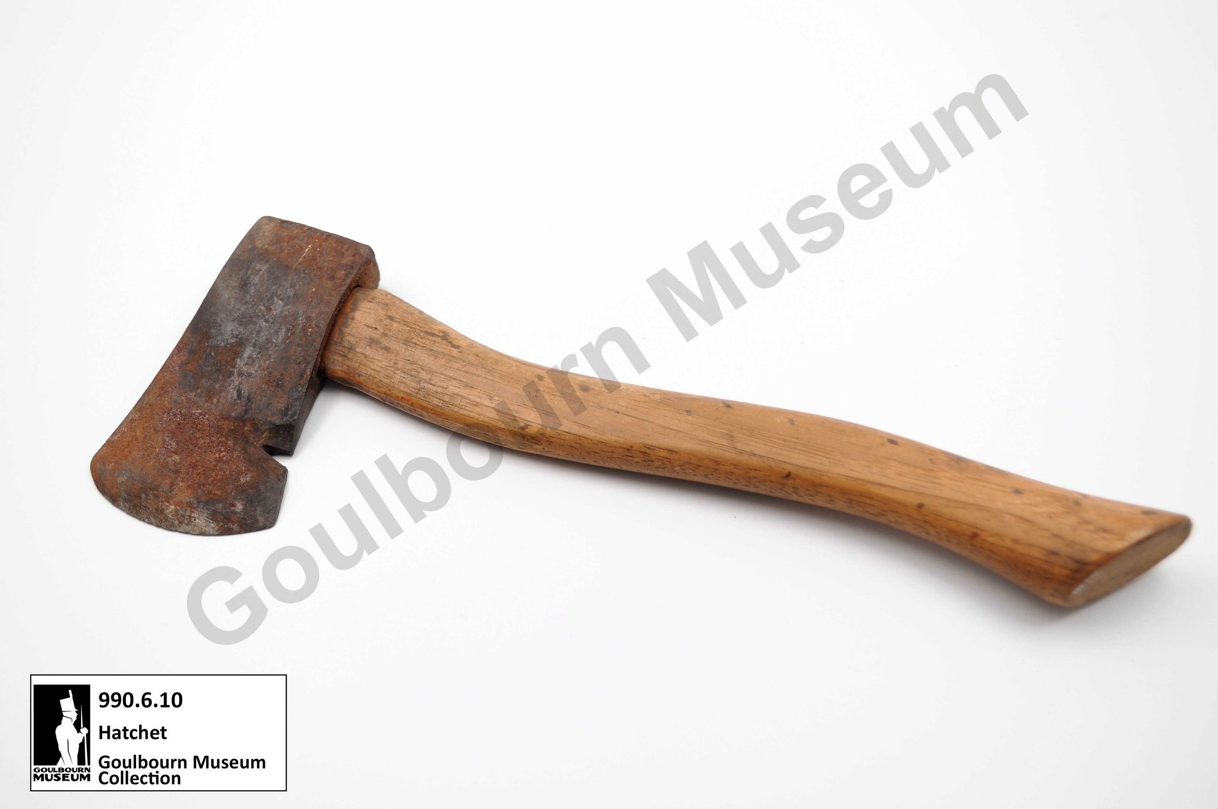 A hatchet tool with a carved wooden handle attached to a hatchet head. The metal hatchet head is dark in color with orange corrosion spots over approximately half of the surface area. The wooden handle is light brown colored with minor dark colored stains. The wooden handle slightly curves twice before being cut on an approximate 45 degree angle at the end. The hatchet head has a notch in the underside edge.