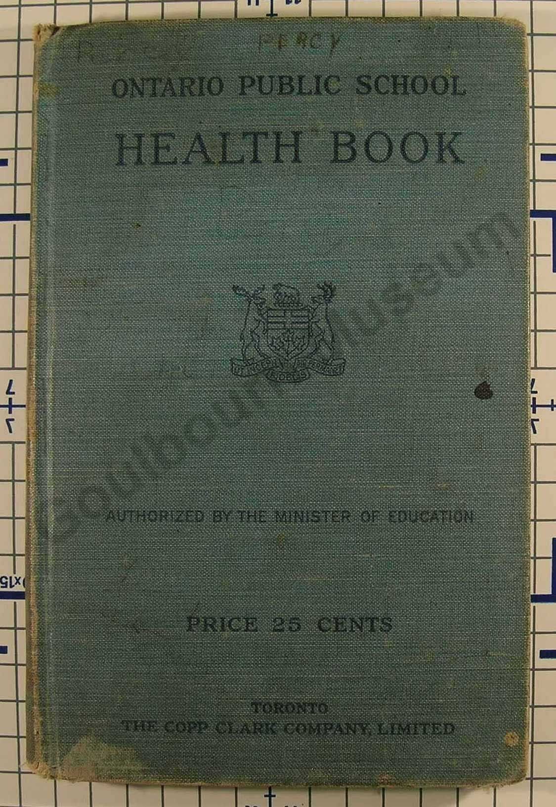 Light blue book with black text reading "Ontario Public School. Health School. Authorized by the Minister of Education"