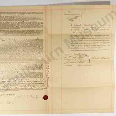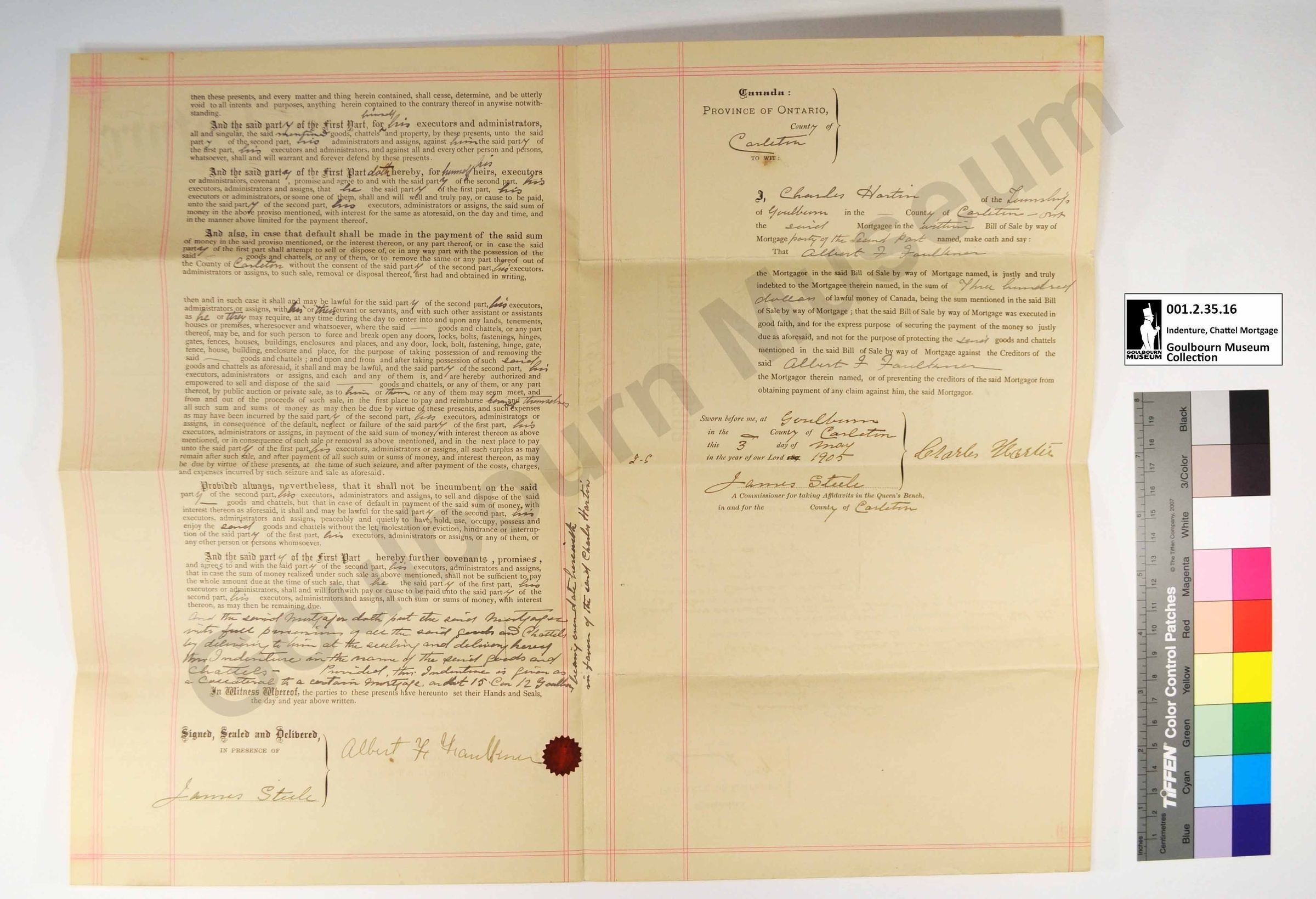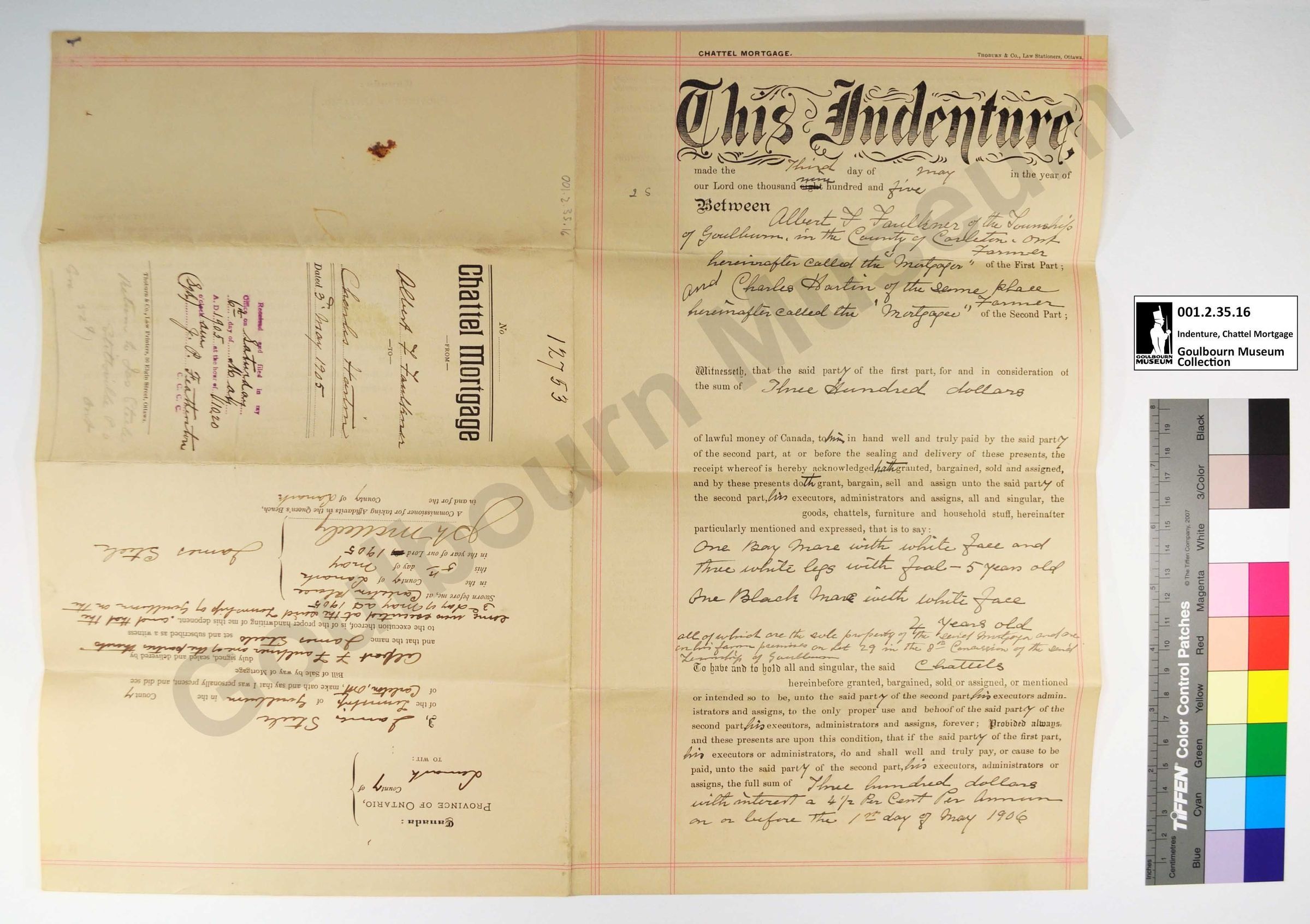 This object is an indenture for a chattel mortgage; a mortgage for moveable property. In this instance, the agreement concerns three horses "one bay mare with white face and three white legs with foal -5 years old" and "One black mare with white face 4 years old". The object is dated May 3, 1905. The support is a cream colored piece of paper. The medium is a printed black ink. Red ink has been used to create borders. A rubber stamp imprint has been rendered in purple ink. Black and brown/gold handwritten ink have been used to fill in the fields, rendered in cursive. An additional inscription appears rendered in pencil.