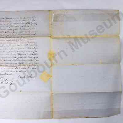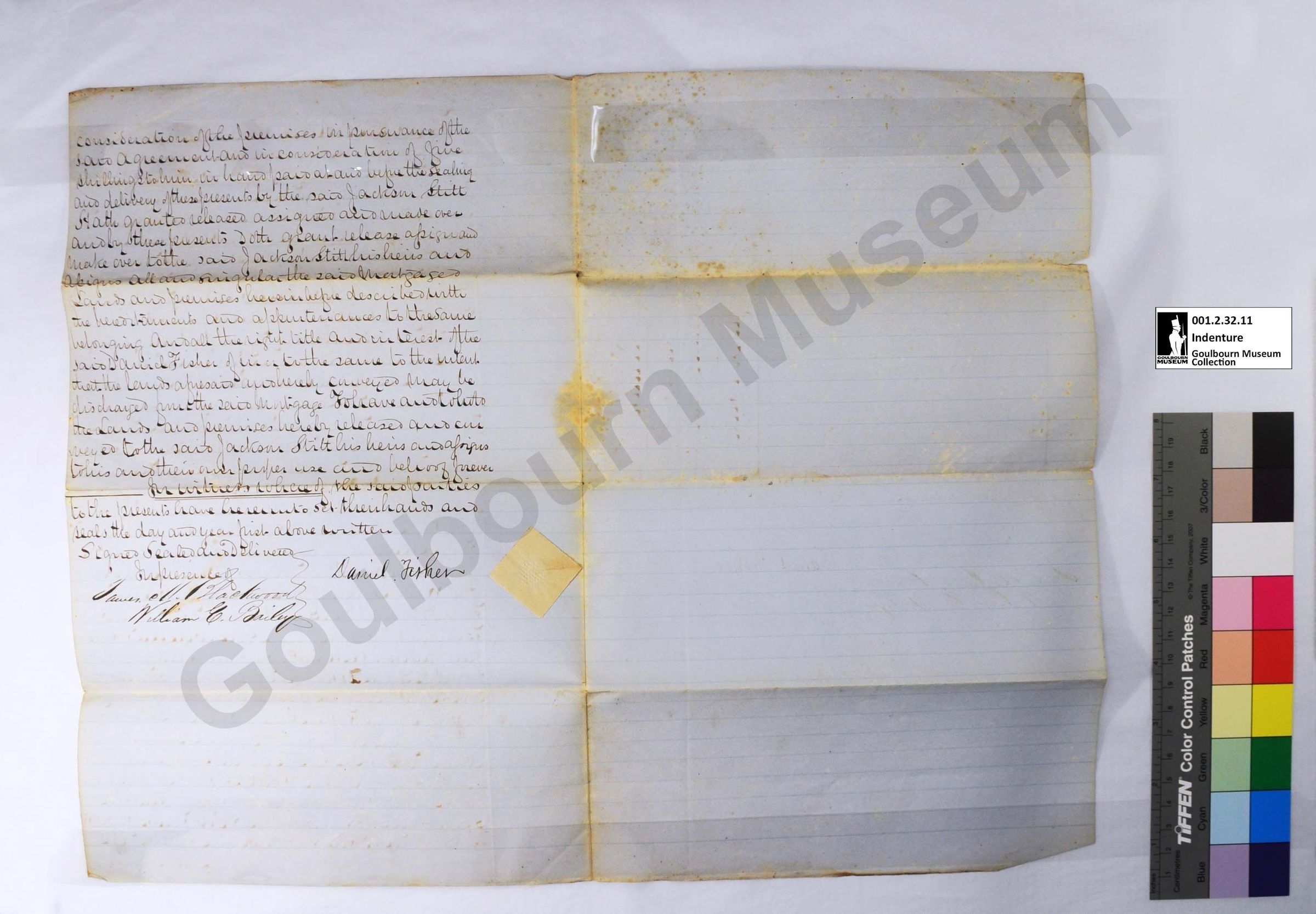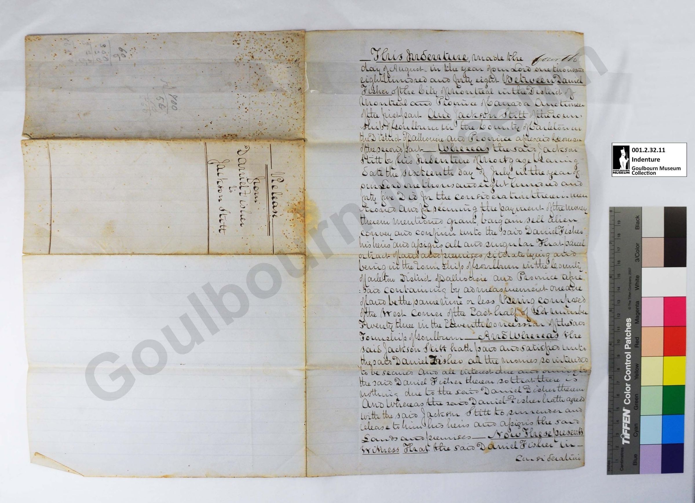 This object is an indenture between Jackson Stitt and Daniel Fisher. It is dated August 4, 1848. It concerns a plot of land designated E1/2 Lot 23 Concession 11. The support is a grey piece of lined paper; the lines are significantly faded. The medium is a black ink, handwritten, rendered in a unique cursive font. An inscription appears on the title page rendered in pencil outlining what appears to be mathematical calculations. The title page appears on the front proper top right quadrant, perpendicular to the primary text as this object was intended to be folded into a brochure form for transport and storage. The words "This Indenture" appear in a slightly larger font at the top of the proper left half of the front. There is a seal on the proper bottom left quadrant of the back, near the center margin. The seal takes the form of a yellowed square piece of paper, adhered to the page with an unknown adhesive; this is oriented with the corners pointed towards the top and bottom of the page.Context
