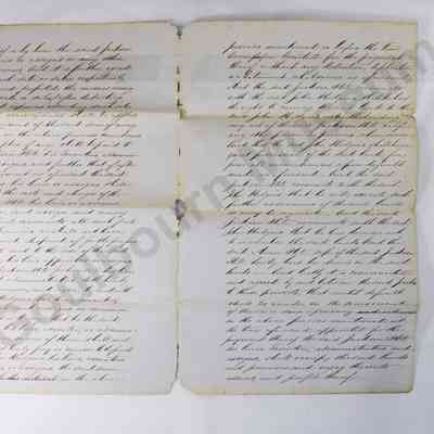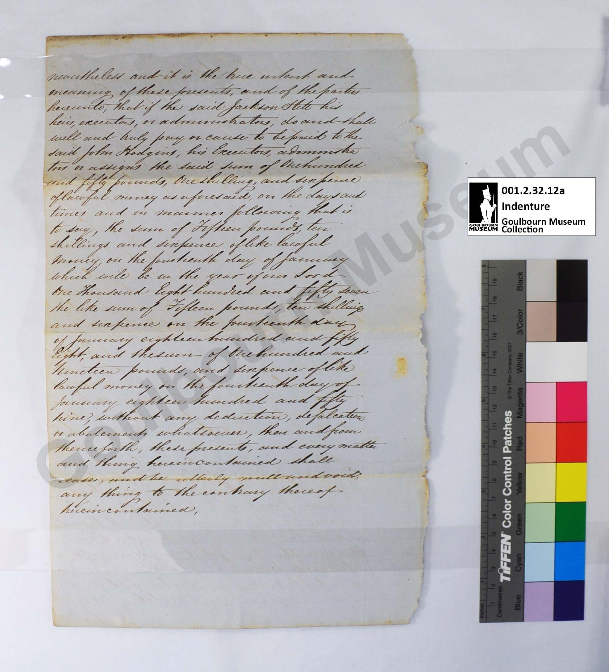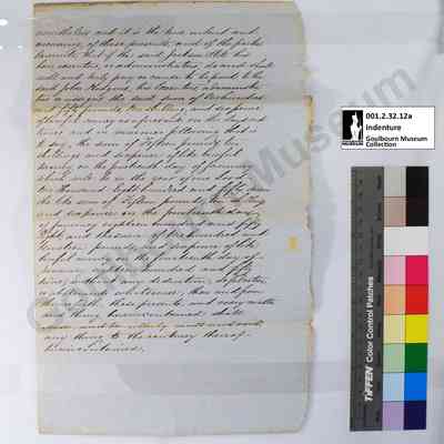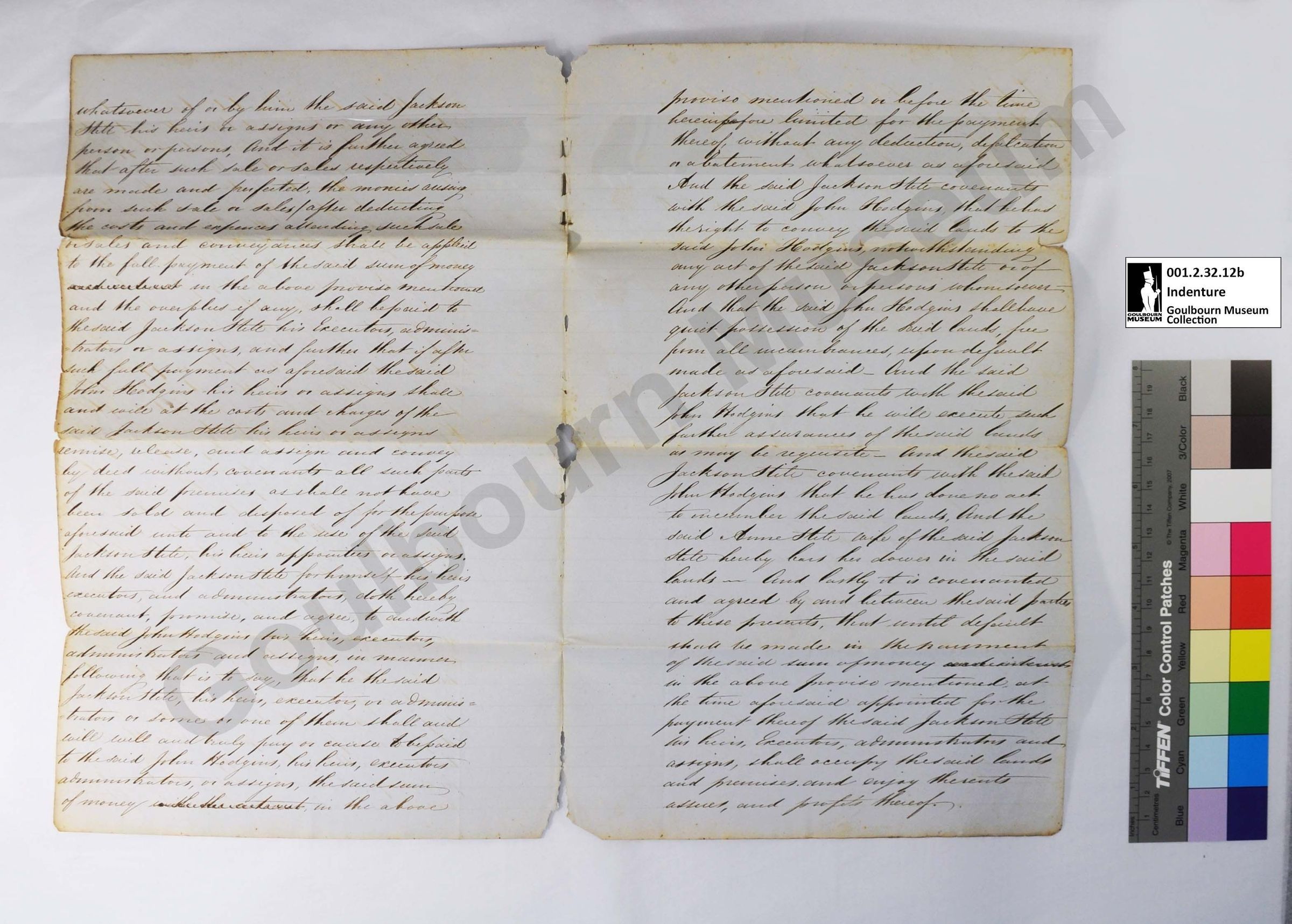 This object is an indenture between Jackson Stitt and John Hodgins regarding a parcel of land designated E1/2 Lot 23 Concession 12. It is dated to January 14, 1856. The support is a grey lined paper; the lines are significantly faded. The medium is a black handwritten ink, rendered in cursive. A metal nail has been punched through the vertical center of 001.2.32.12b with the point facing towards the top of the page to create a spine/hinge.