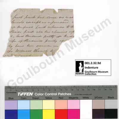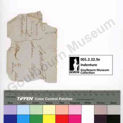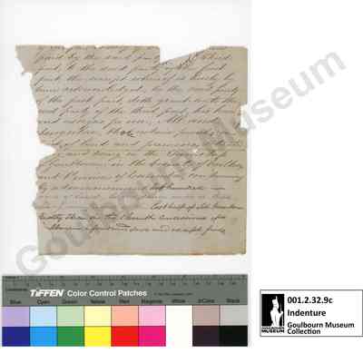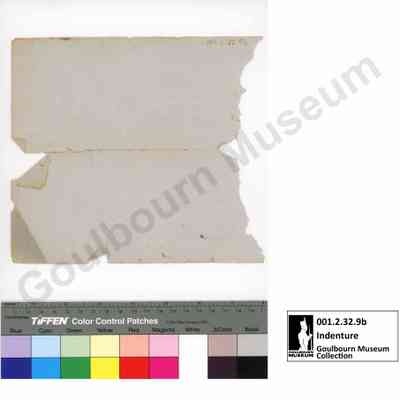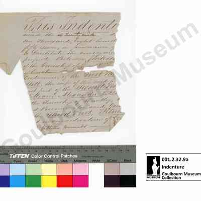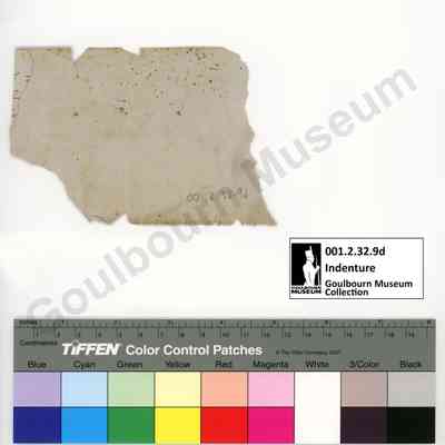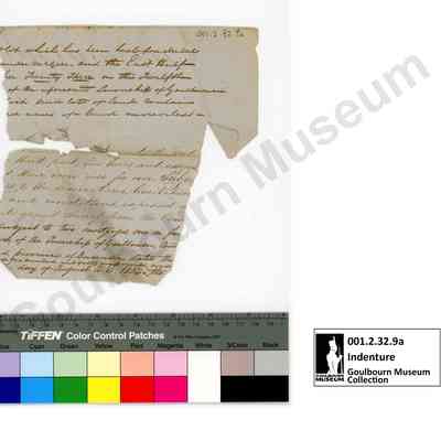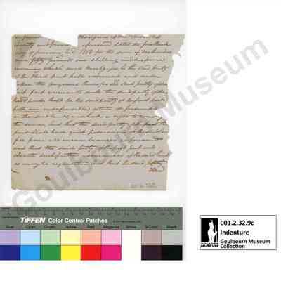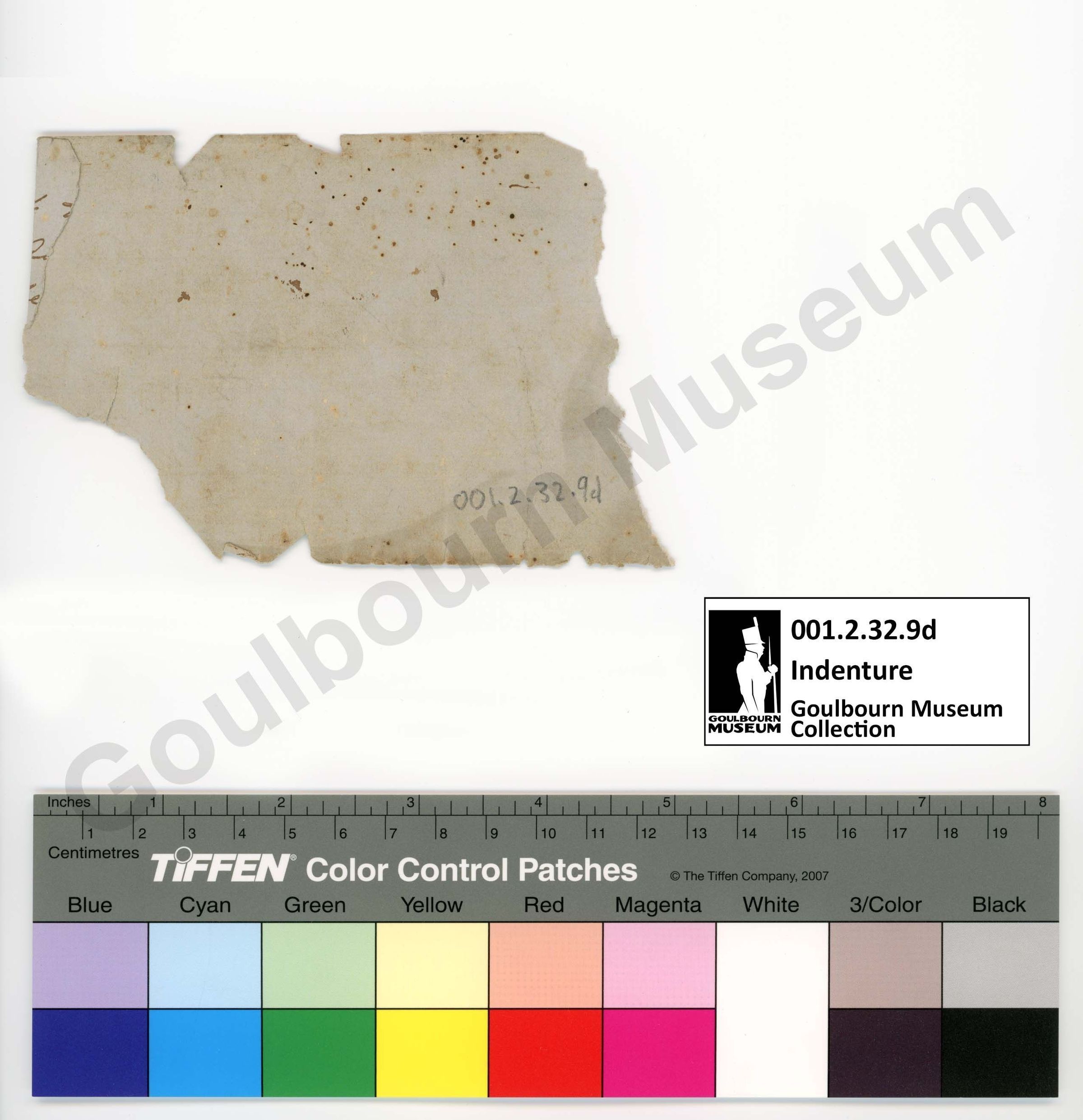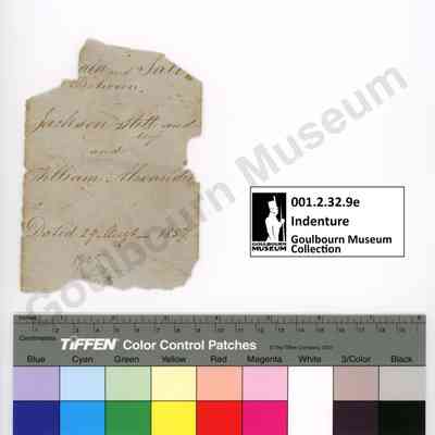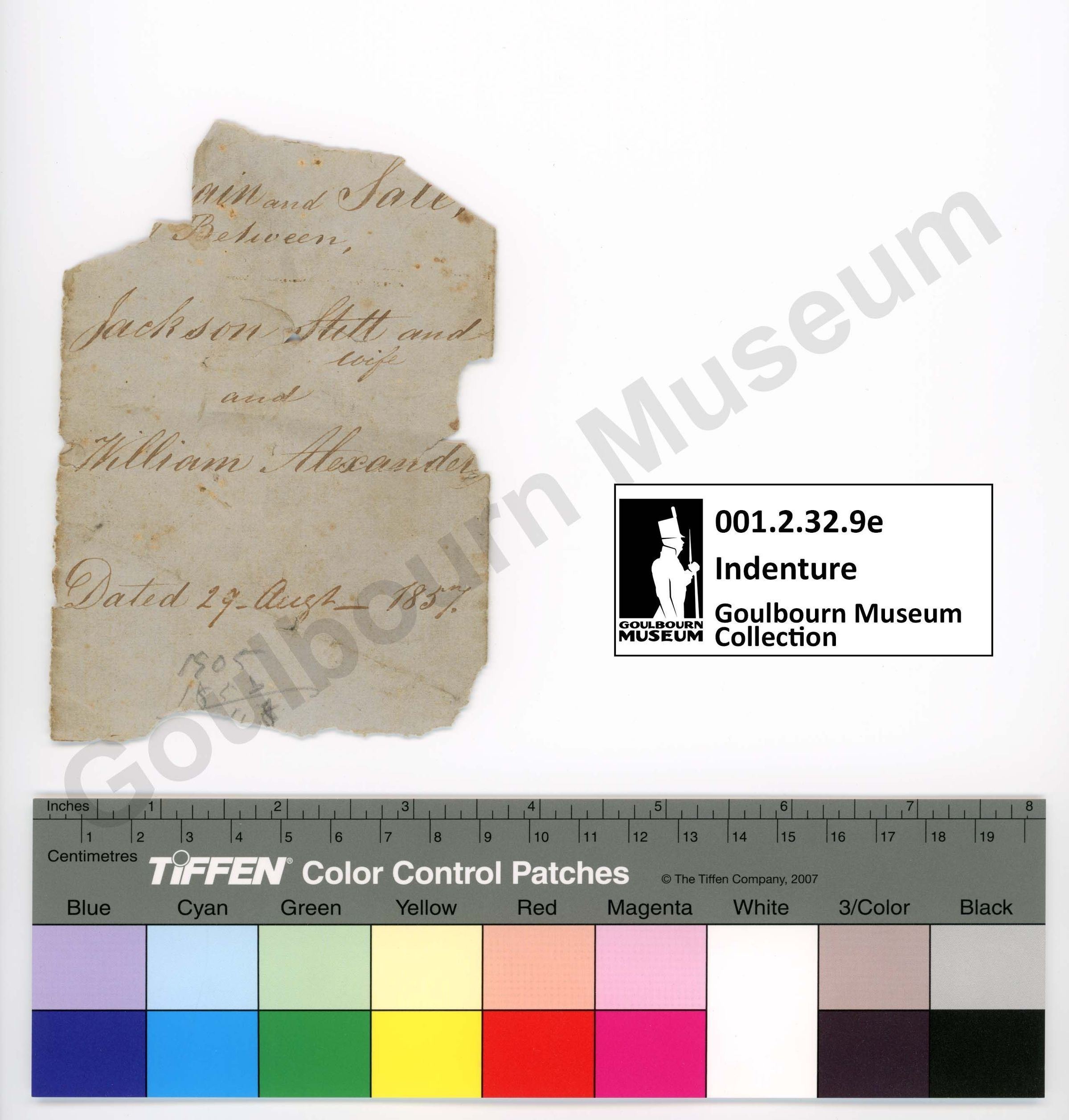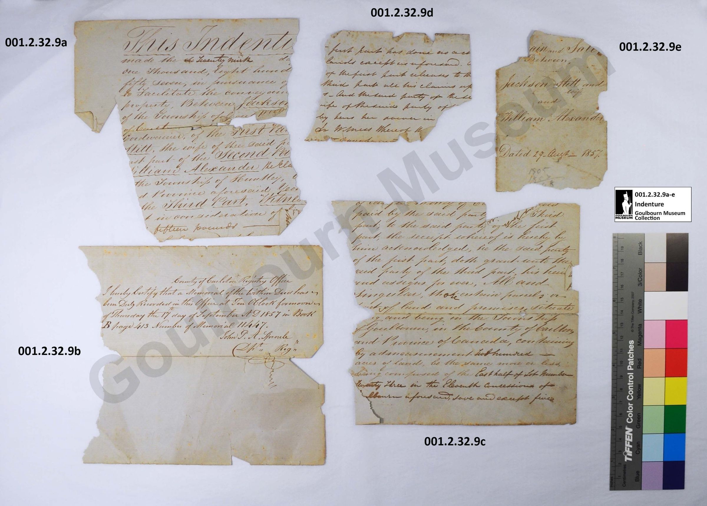 This object is an indenture between Jackson Stitt and William Alexander. It is dated August 29, 1857. The support is a grey/green sheet of paper which has been torn into five fragments. The medium is a handwritten brown ink rendered in a cursive script. There is a single inscription on 001.2.23.9e in pencil. Individual fragments are described as follows.