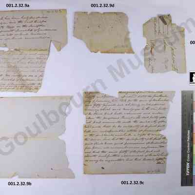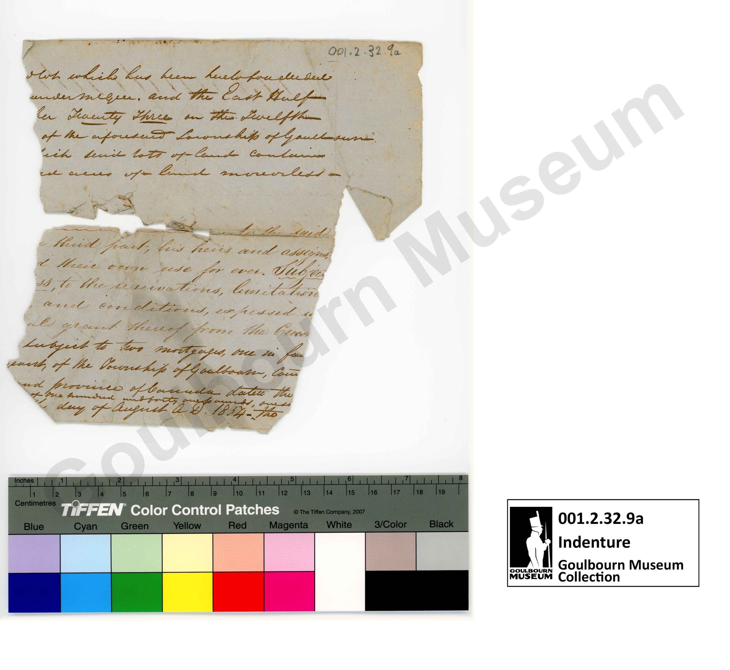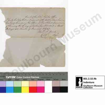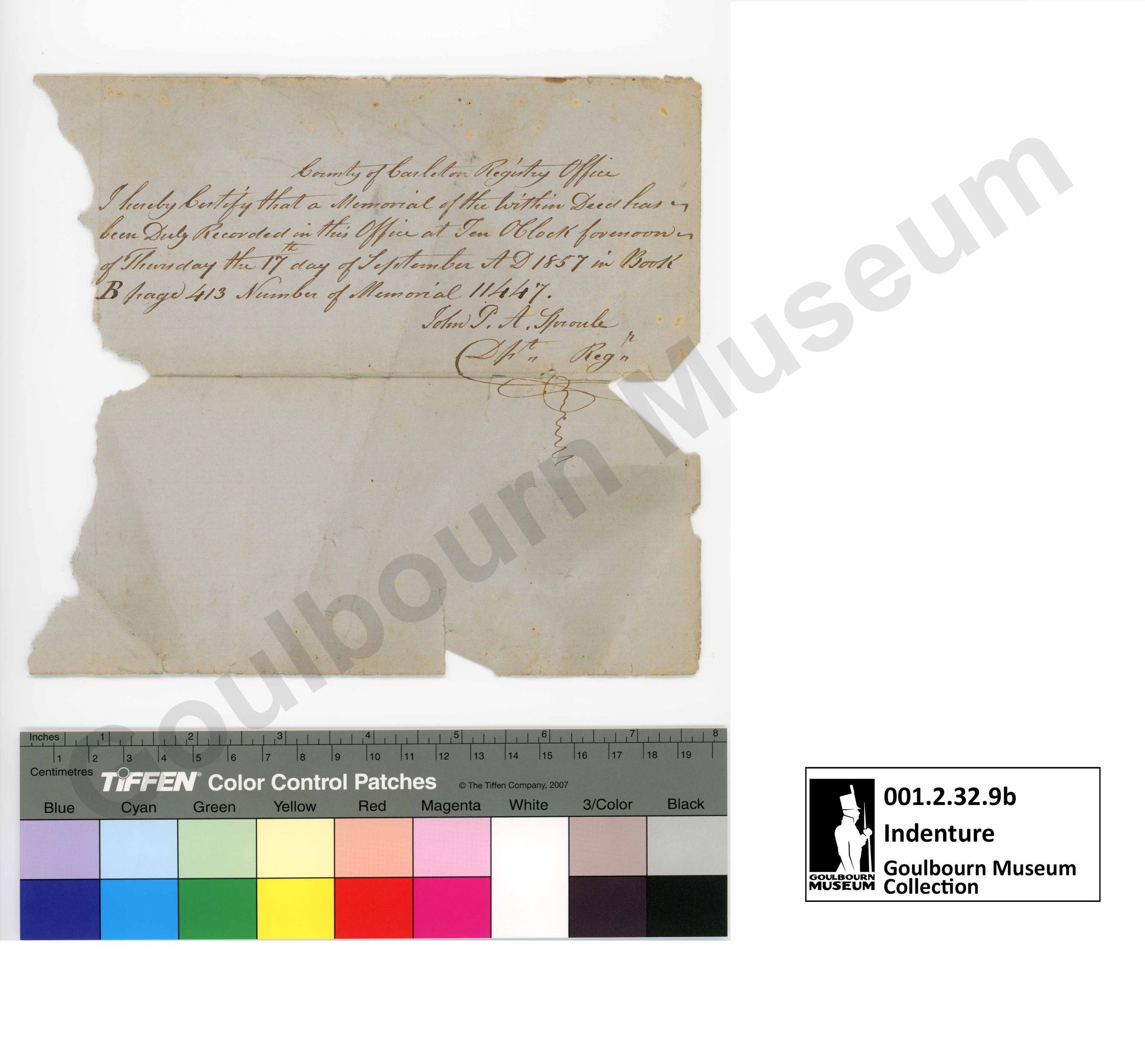 001.2.32.9b contains a corner as well as a portion of two edges. There is text on the front; the font is slightly smaller than that of the rest of the document however it is rendered in the same brown ink and handwritten script. The words "County of Carleton Registry Office" appear at the top of this body of text. This text block appears to be an independent body from the primary document. The reverse is blank.