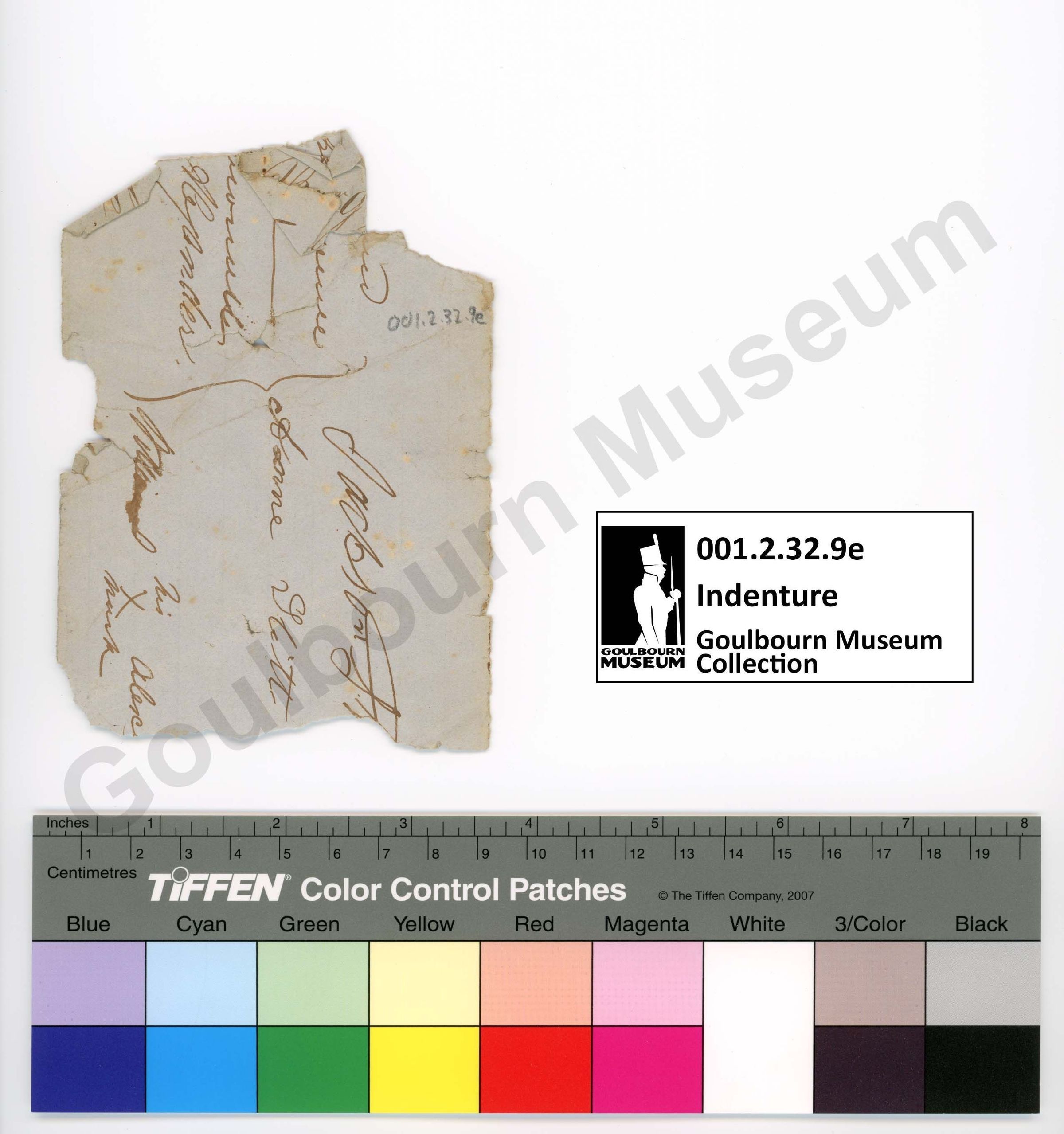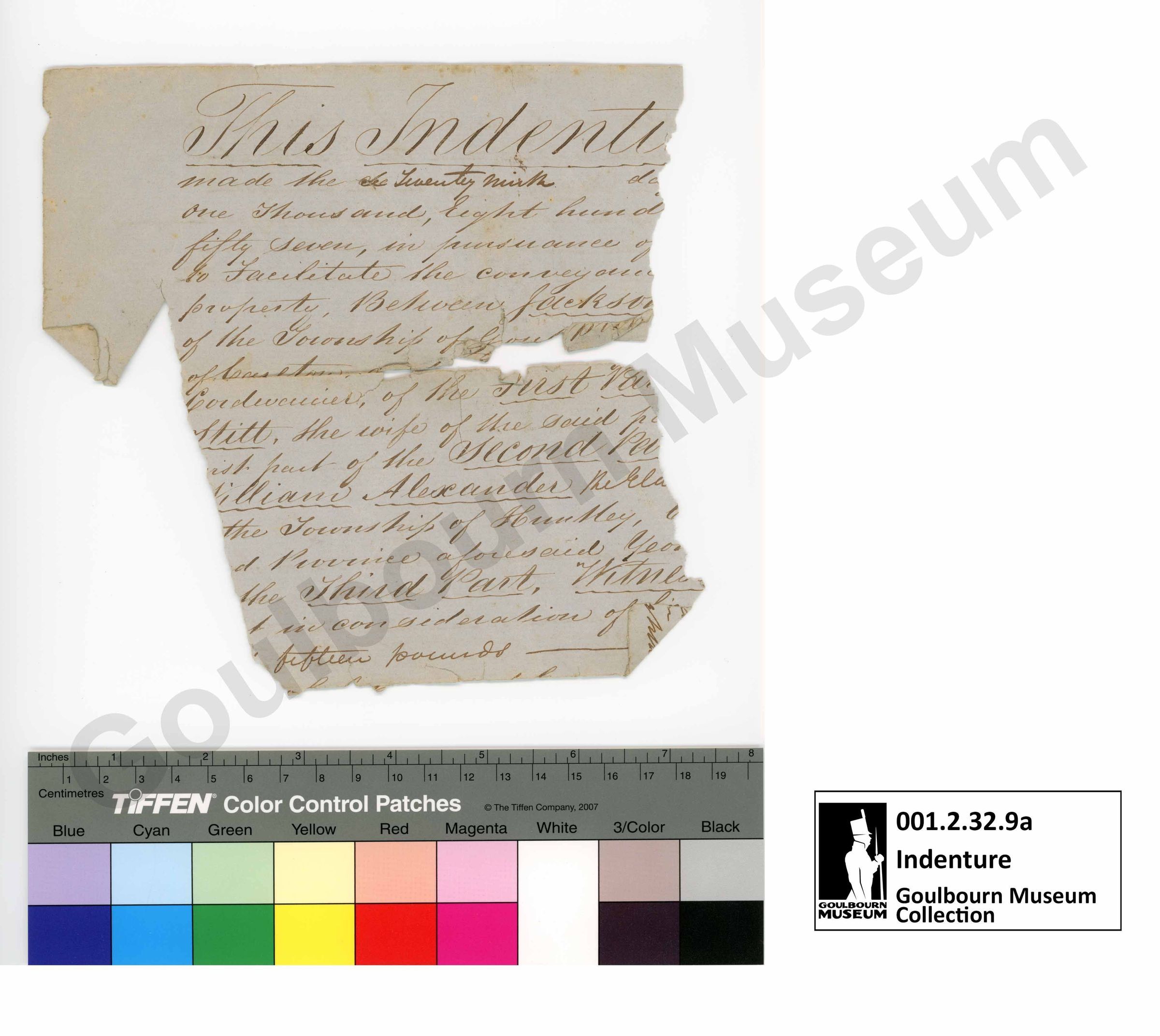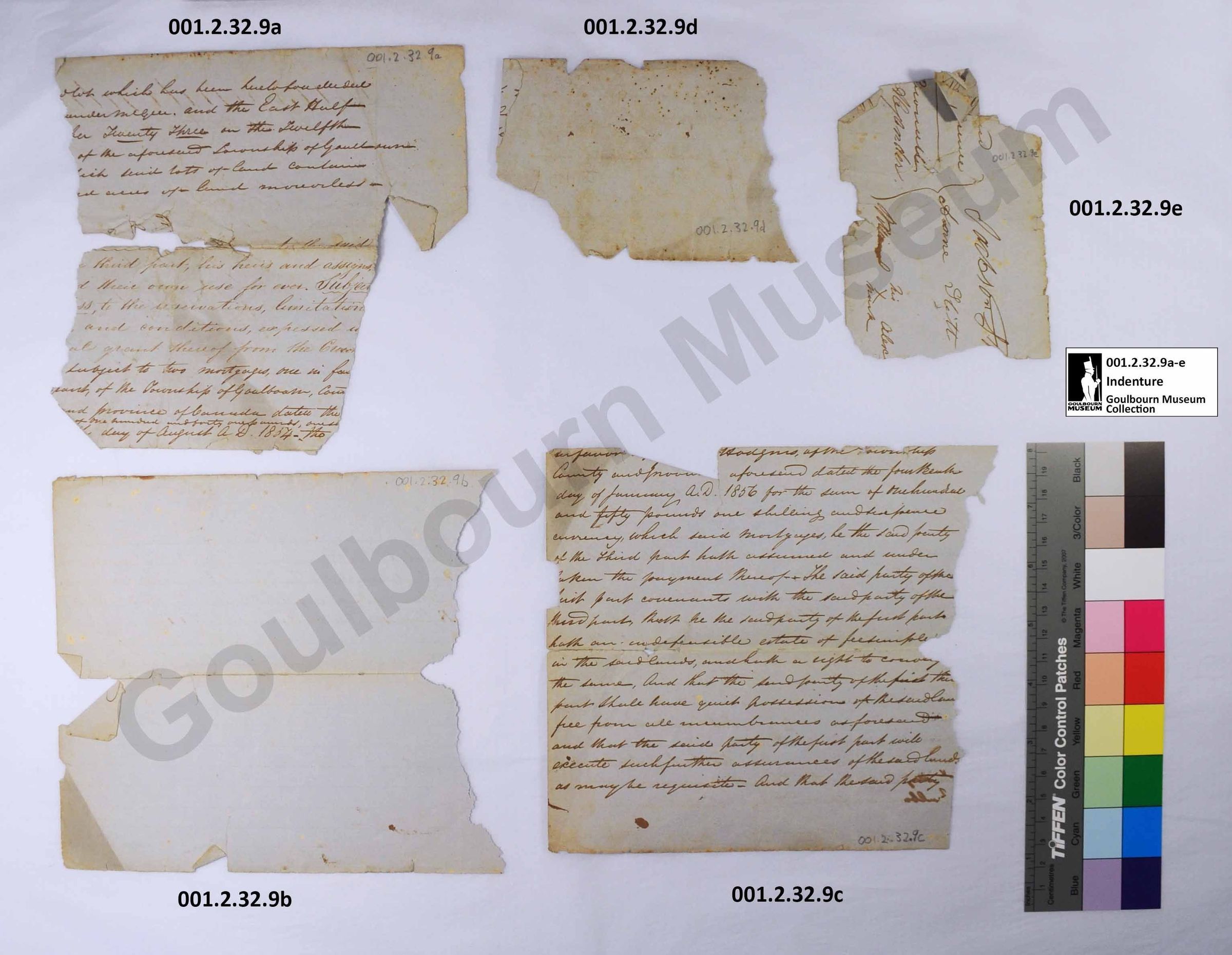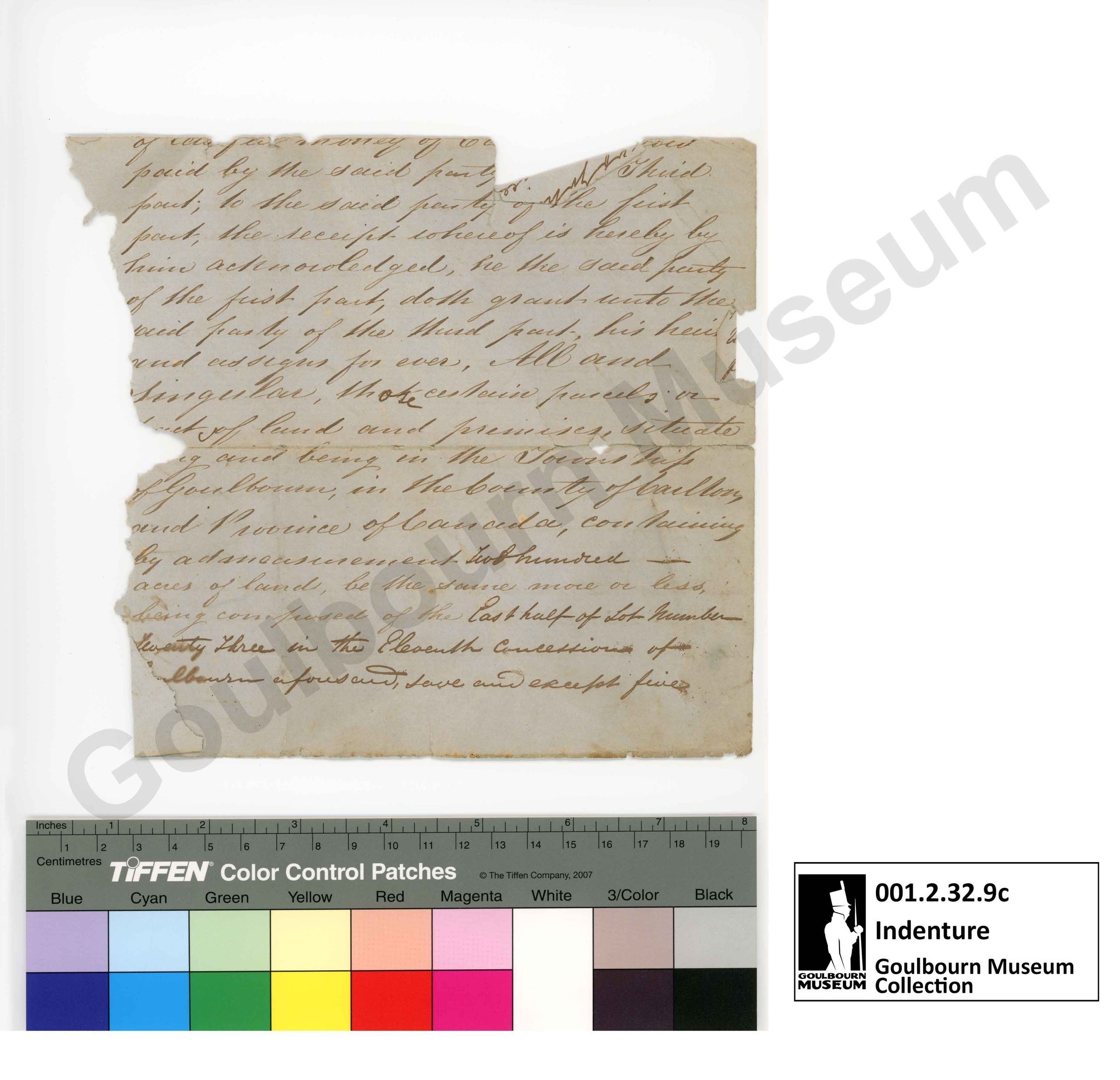 001.2.32.9e contains a section of the title page on the front, with the top and bottom having been torn off. The words "Bargain and Sale between Jackson Stitt and wife and William Alexander. Date 29 August, 1857" appear on the front. An additional inscription appears below rendered in pencil which appears to partially outline a mathematical equation. The back of this fragment contains text which is oriented perpendicular to the text on the front; a "{" symbol is visible at center.Context