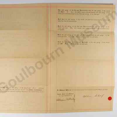 All the text on the proper right half of front is perpendicular to the primary body of text. This includes the title page which appears perpendicular to the primary text as this object was intended to be folded into a brochure form for transport and storage. There is a blue rubber stamp imprint in the top right quadrant of the front consisting of 7 lines of script; the stamp's fields are filled in with a black handwritten ink. The words "This Indenture" appear at the top of the proper left half of the front in a large black, decorative, printed font. There are two horizontal red lines which span the entire width of the front at the top and bottom; the top horizontal red line is comprised of three parallel red lines, the bottom horizontal red line is comprised of two parallel red lines. There are three vertical red lines which run the length of the proper left front page. The proper rightmost vertical line is comprised of three parallel lines; the other two vertical lines are comprised of two parallel red lines.