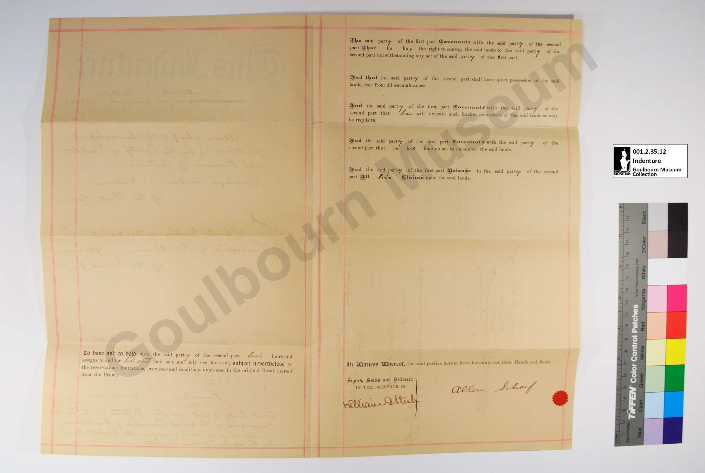 This object is a land deed situate between Allan Scharf and Charles Hartin. It is dated October 19, 1900. It concerns a parcel of land designated E1/2 Lot 15 Concession 12. The support is a rectangular cream colored piece of paper. The medium is a black printed ink. Red ink has been used to create borders. A rubber stamp imprint is rendered in blue ink. The fields are filled in by hand with a black and a brown/gold ink rendered in cursive.