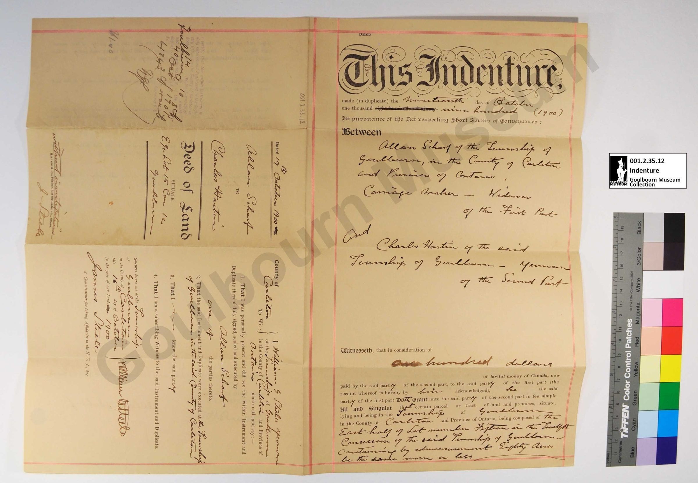 Indenture, Land Deed Situate: Allan Scharf to Charles Hartin, E1/2 Lot 15 Concession 12, 1900Entry/Object ID