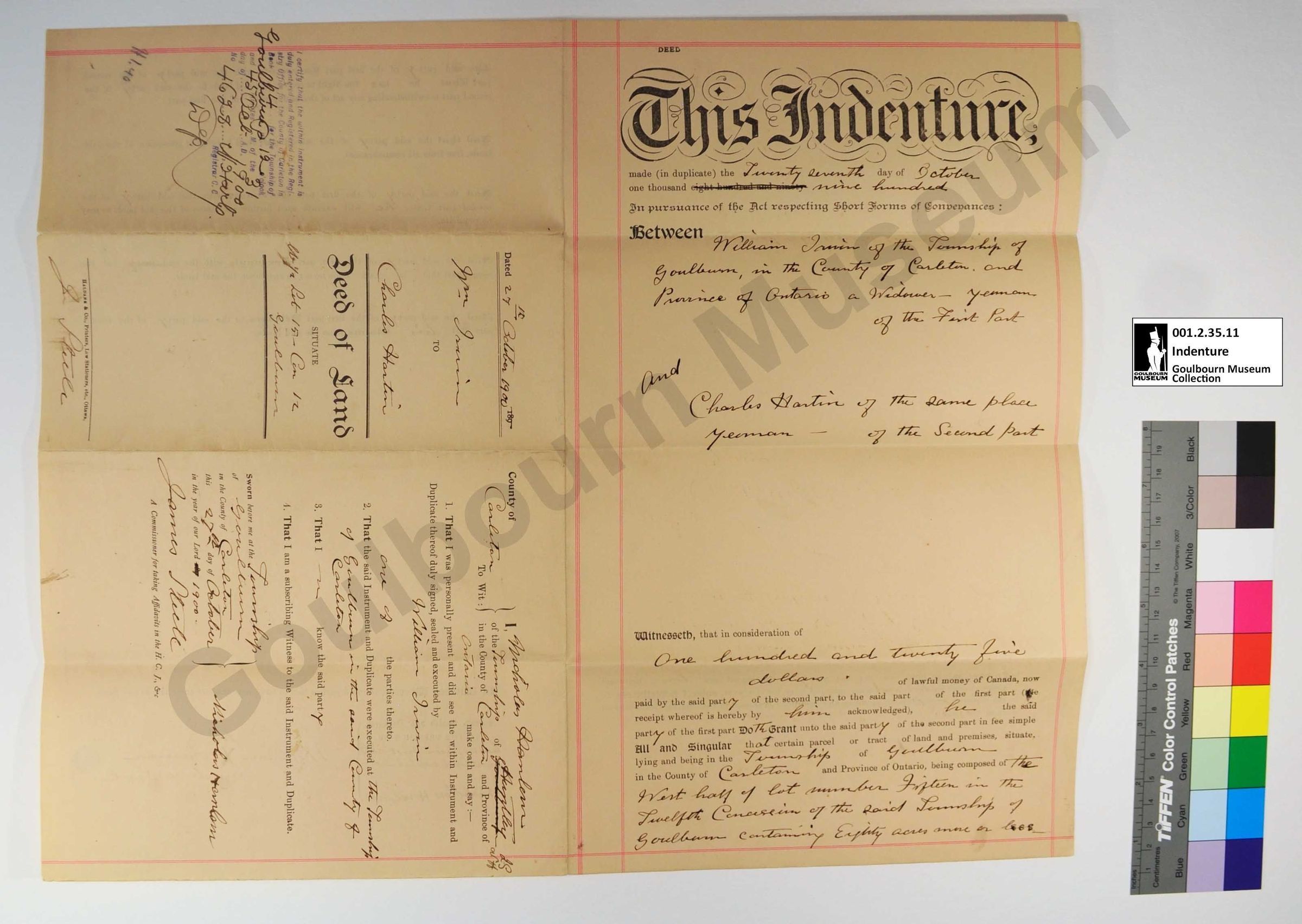 Indenture, Land Deed Situate: William Irwin and Charles Hartin, W1/2 Lot 15 Concession 12, 1900Entry/Object ID