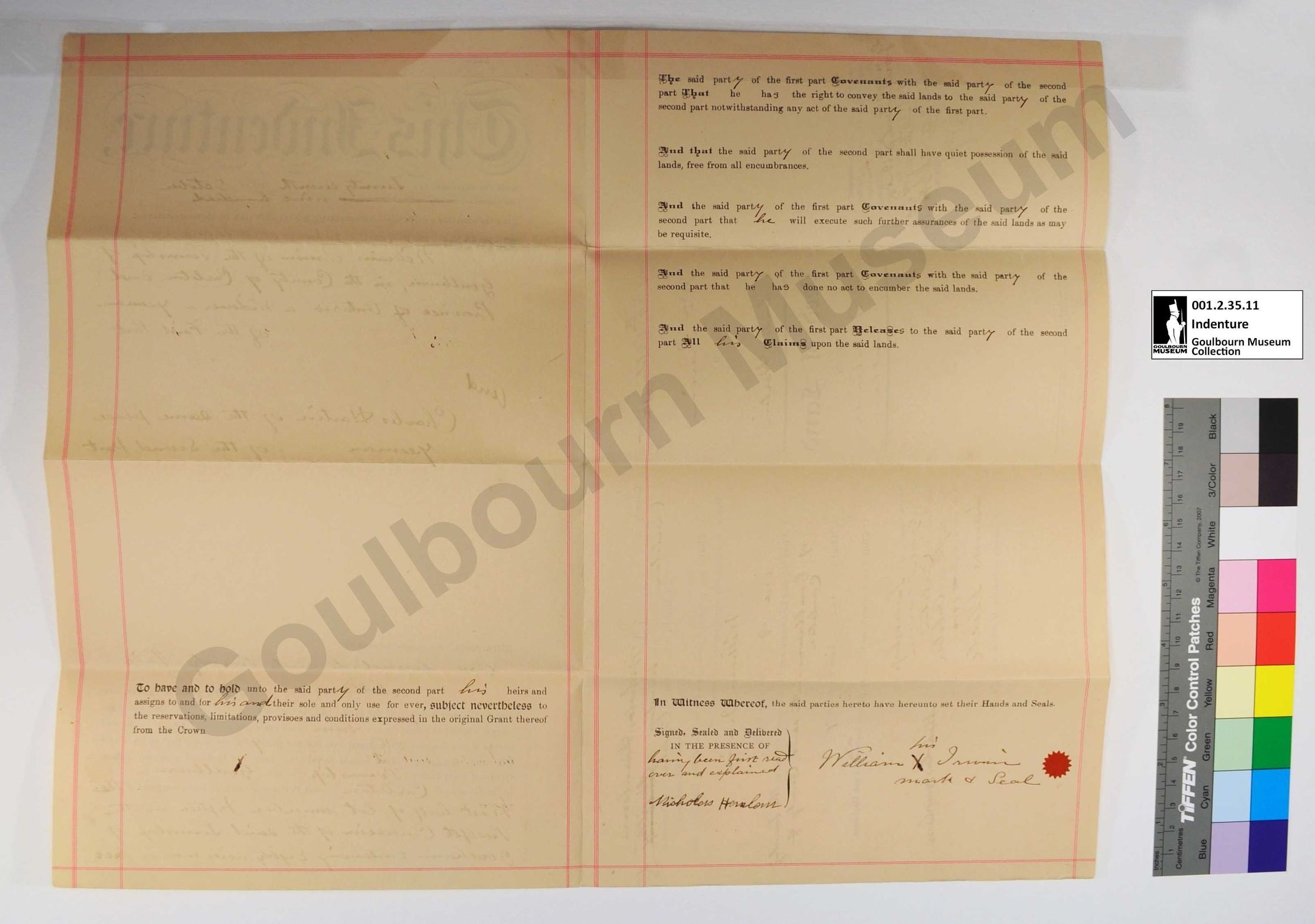 All the text on the proper side of the front is perpendicular to the primary body of text. This includes the title page which appears perpendicular to the primary text as this object was intended to be folded into a brochure form for transport and storage. There is a blue rubber stamp imprint in the top proper right quadrant of the front which consists of seven lines of script; the stamp has been filled in by hand with a black handwritten ink rendered in cursive. The words "This Indenture" appear in a larger, decorative, printed black font at the top of the proper left front page. There are two horizontal red lines which span the entire width of the front at the top and bottom; the top horizontal red line is comprised of three parallel red lines, the bottom horizontal red line is comprised of two parallel red lines. There are three vertical red lines which run the length of the proper left front page. The proper rightmost vertical line is comprised of three parallel lines; the other two vertical lines are comprised of two parallel red lines.