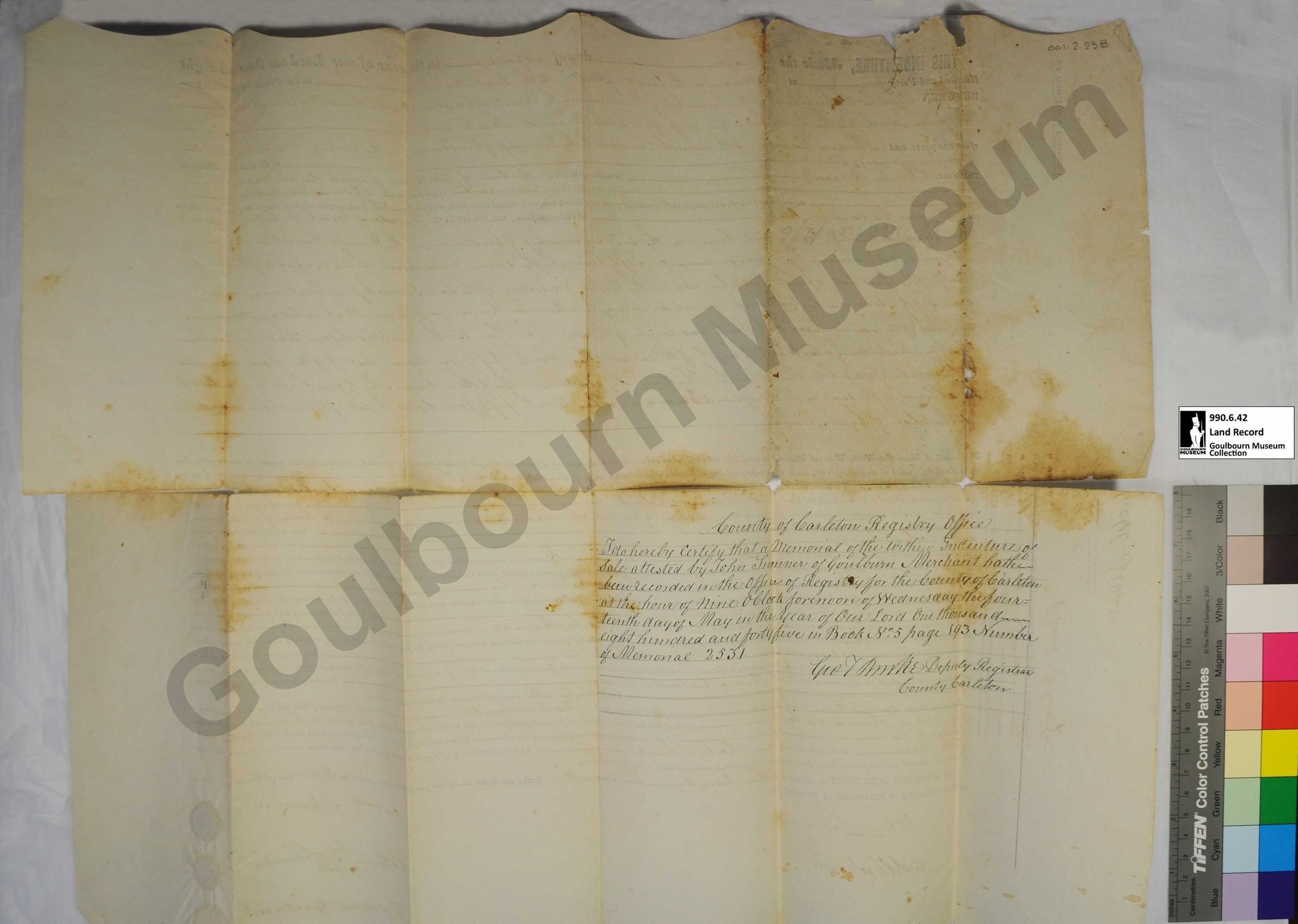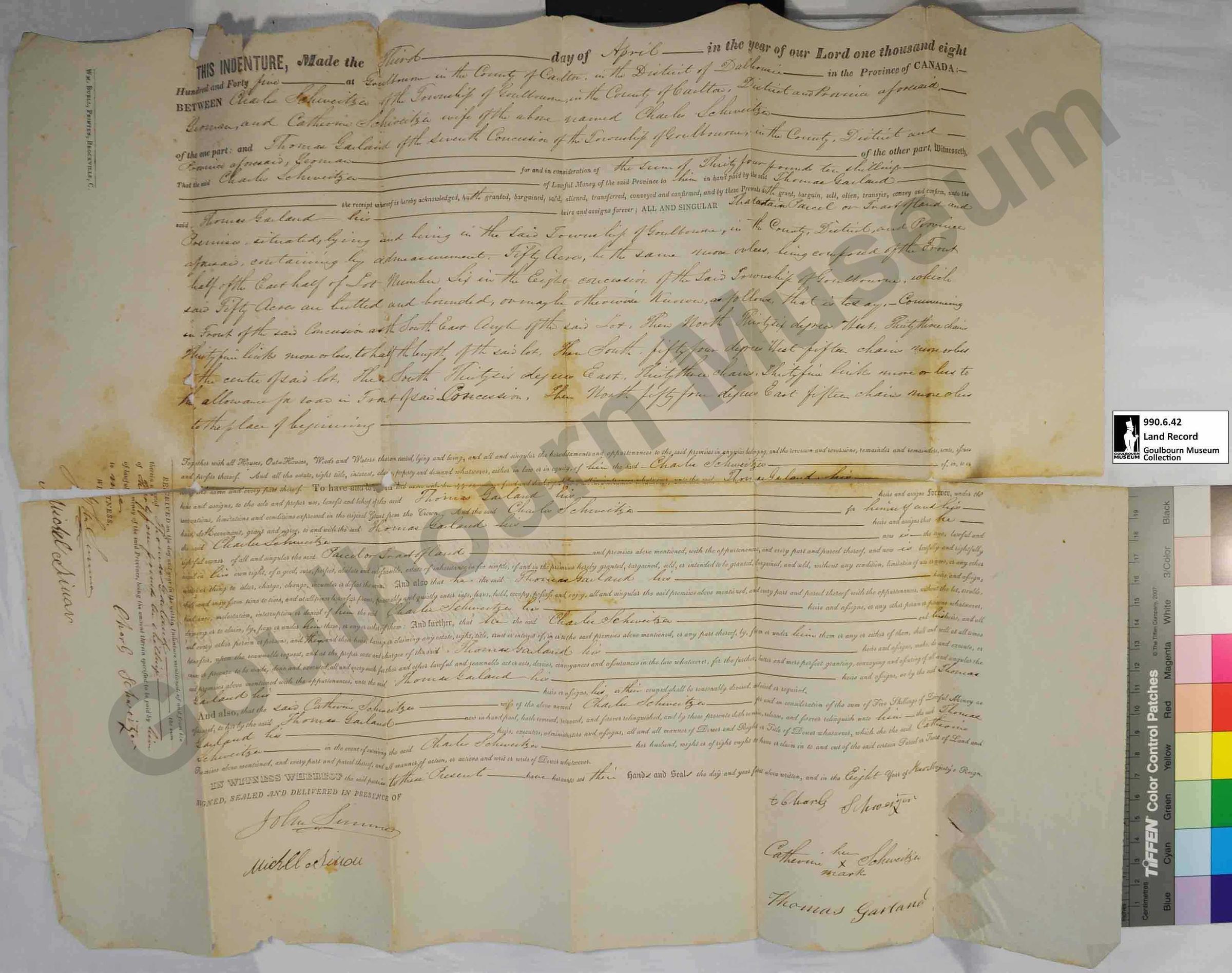 Indenture, Land Sale: Charles Switzer and Thomas Garland E1/2, Lot 6 Concession 8, 1845Entry/Object ID