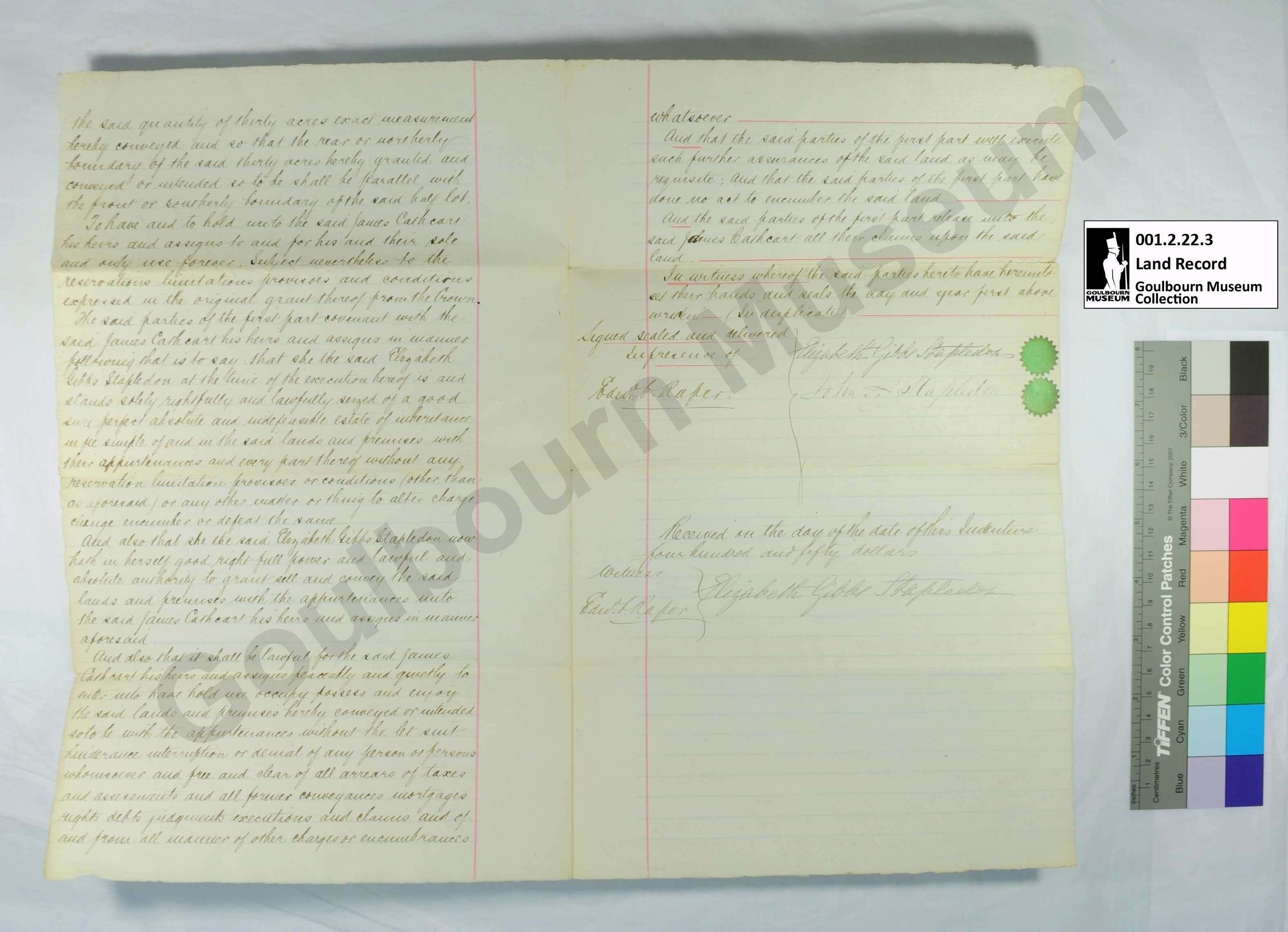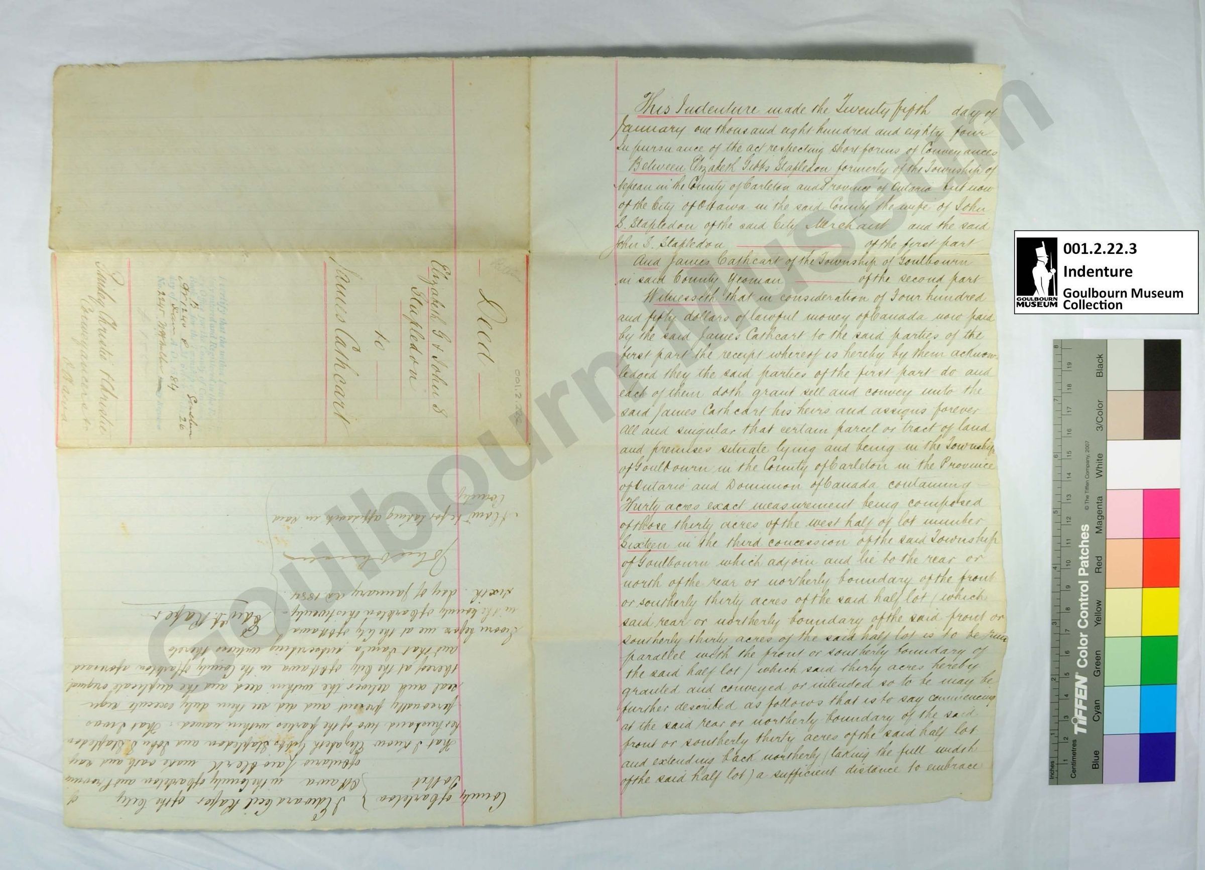 This object is a land transfer from Elizabeth Stapleton to James Cathcart. It is dated to January 25, 1884. It concerns a parcel of land designated as W1/2 Lot 16 Concession 3. The support is a large rectangular piece of paper that is cream in color. Two vertical red lines extend the length of the page on either side of center on both faces. Red lines also appear throughout the document underlining certain elements for administrative purposes. The title page appears smaller and aligned perpendicular to the rest of the document as this object was designed to be transported and stored in a folded position similar to a brochure. The medium is a handwritten black ink rendered in cursive. A blue ink stamp appears on the title page, located on the front at the proper top right quadrant when the page is unfolded; this stamp takes the form of 7 lines of printed script and is quite faded. A black handwritten ink has been used to fill out the forms of the stamp. The proper right bottom half of the front, excluding the title, is upside-down for unknown reasons. There are two green seals shaped like cogs with pointed teeth located along the proper right margin of the back in a vertical alignment; these occur slightly above the horizontal center.Context