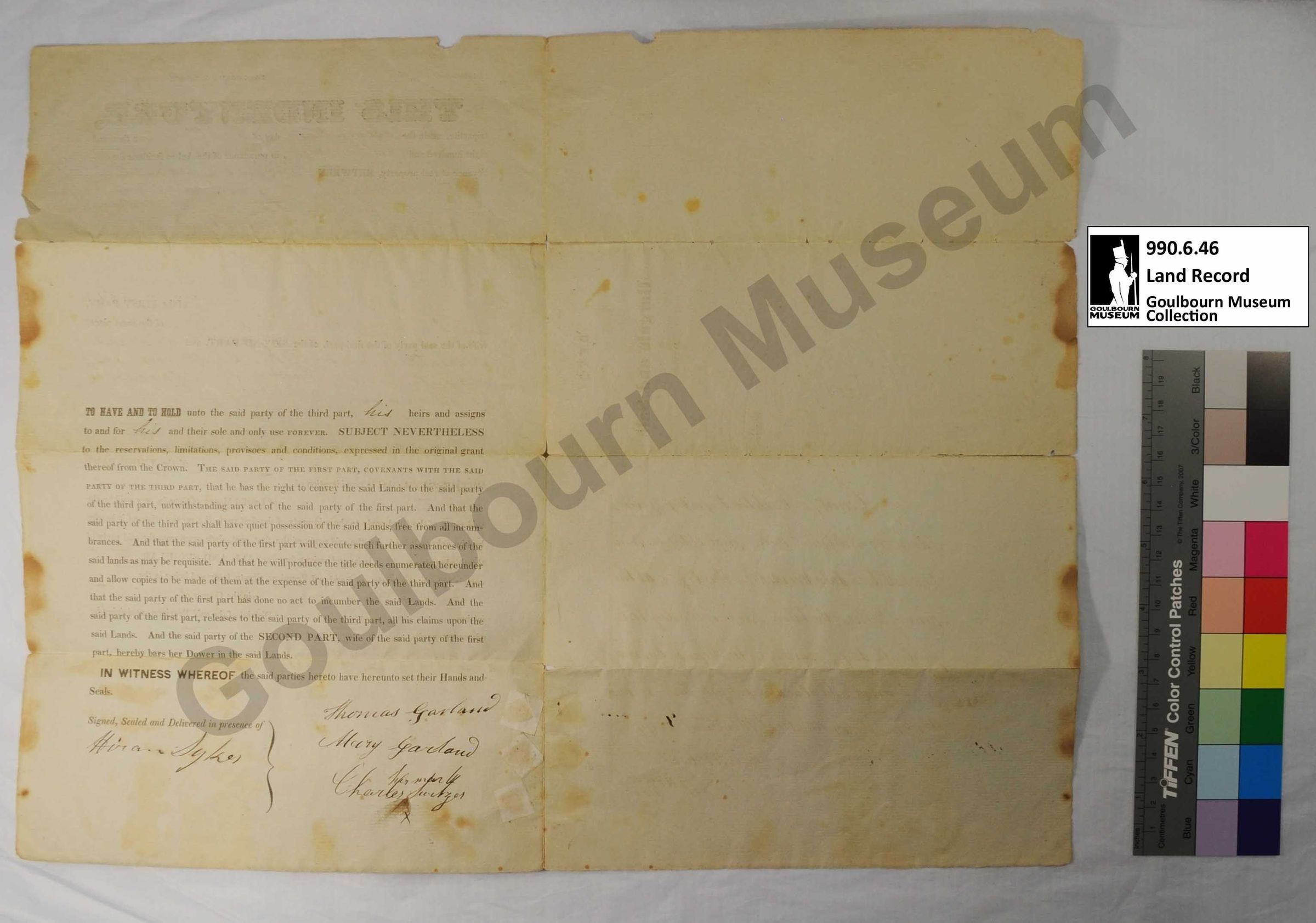 This object is significant as it pertains to the historic transfer of land in the Goulbourn area. It provides information about an individual and land linked to a historical family from the Goulbourn area. It is associated with the Switzer family who were some of the original settlers in the Goulbourn area through John Charles Schweitzel, an immigrant from Spain (the family was renamed Switzer at an unknown date).Lexicon