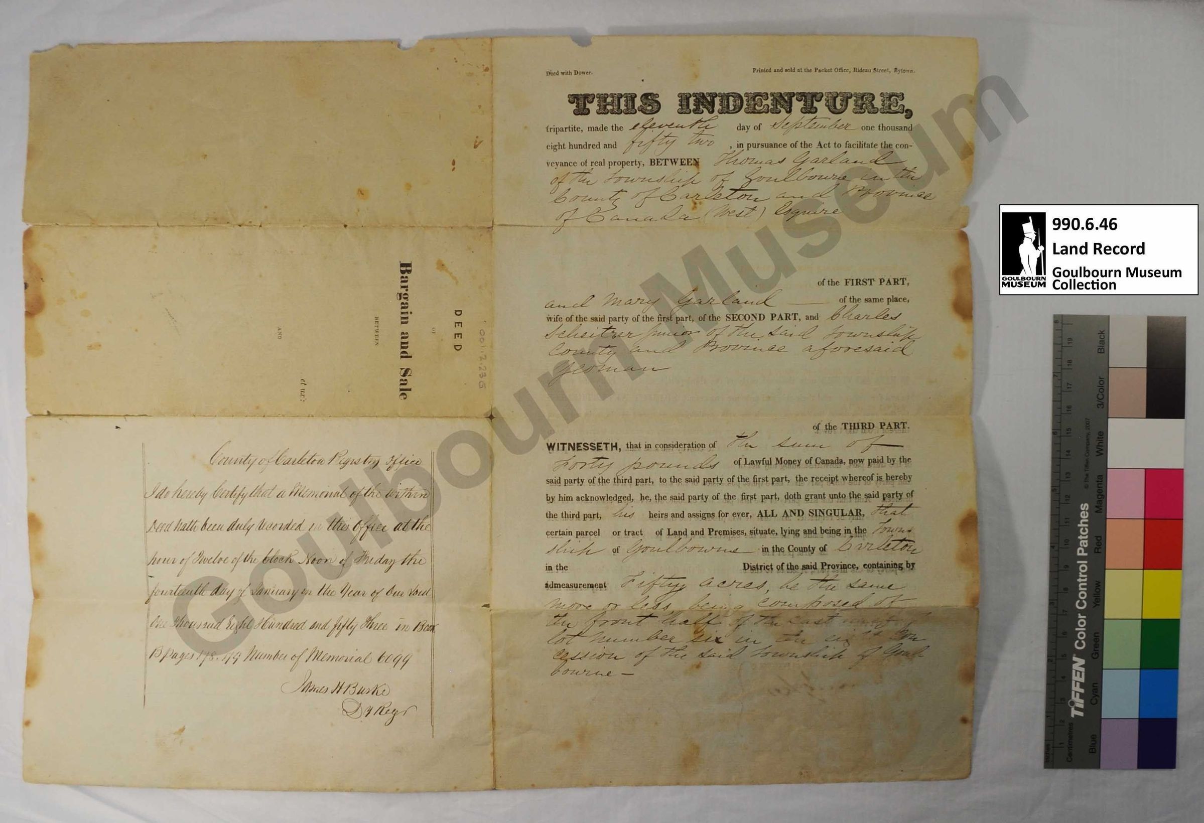 This object is an indenture documenting the bargain and sale of a plot of land between Thomas Garland and Charles Switzer Junior. It is dated September 11, 1852. The parcel of land in question is designated the F1/2 of E1/2 of lot 6 concession 8. The support is a cream colored sheet of paper. The medium is a black printed ink. The fields have been filled in with a black ink, handwritten and rendered in cursive. The title page appears on the front; perpendicular to the primary text as this object was intended to be folded into a brochure form for transport and storage. The words ""THIS INDENTURE" appear at the top of the proper left side of the front in a decorative font, in all capital letters. The text located at the proper bottom right corner of the front displays two vertical lines, comprised themselves of two smaller parallel lines, on either side of the text. The back contains a body of text in the proper bottom left corner. There are three seals on the proper bottom left corner of the back which consists of a square piece of light cream colored paper affixed to the document by some form of adhesive underneath; they are arranged in a vertical alignment.Context