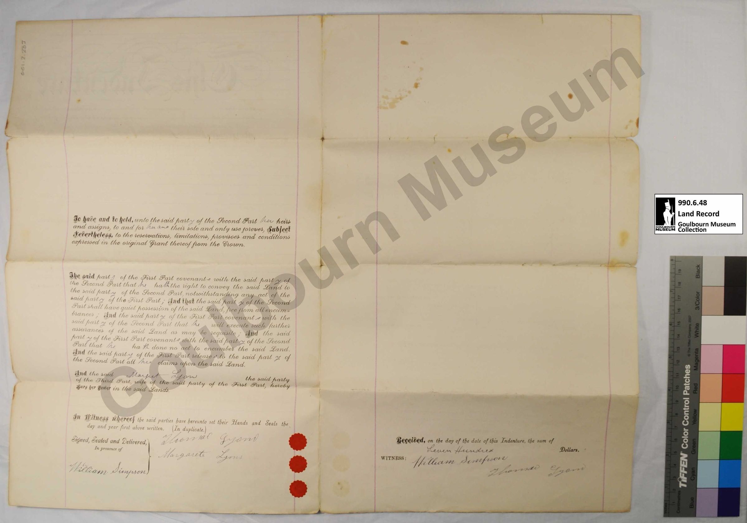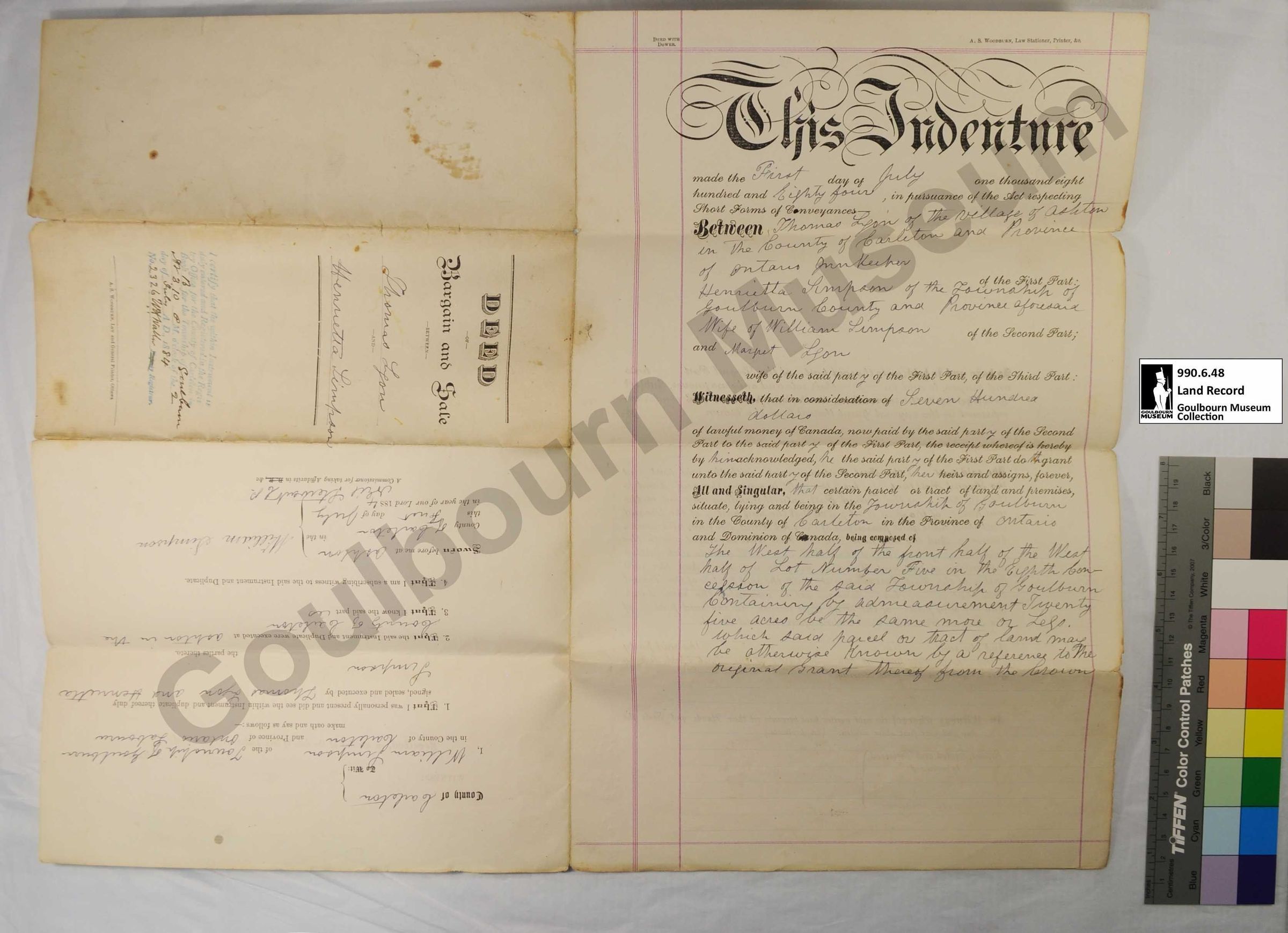 Indenture, Land Sale: Thomas Lyon and Henrietta Simpson, F1/2 of the W1/2 Lot 5 Concession 8 1884Entry/Object ID