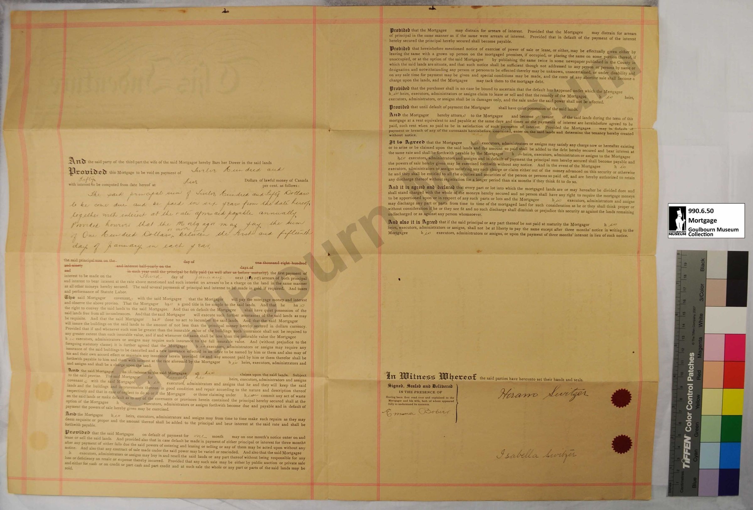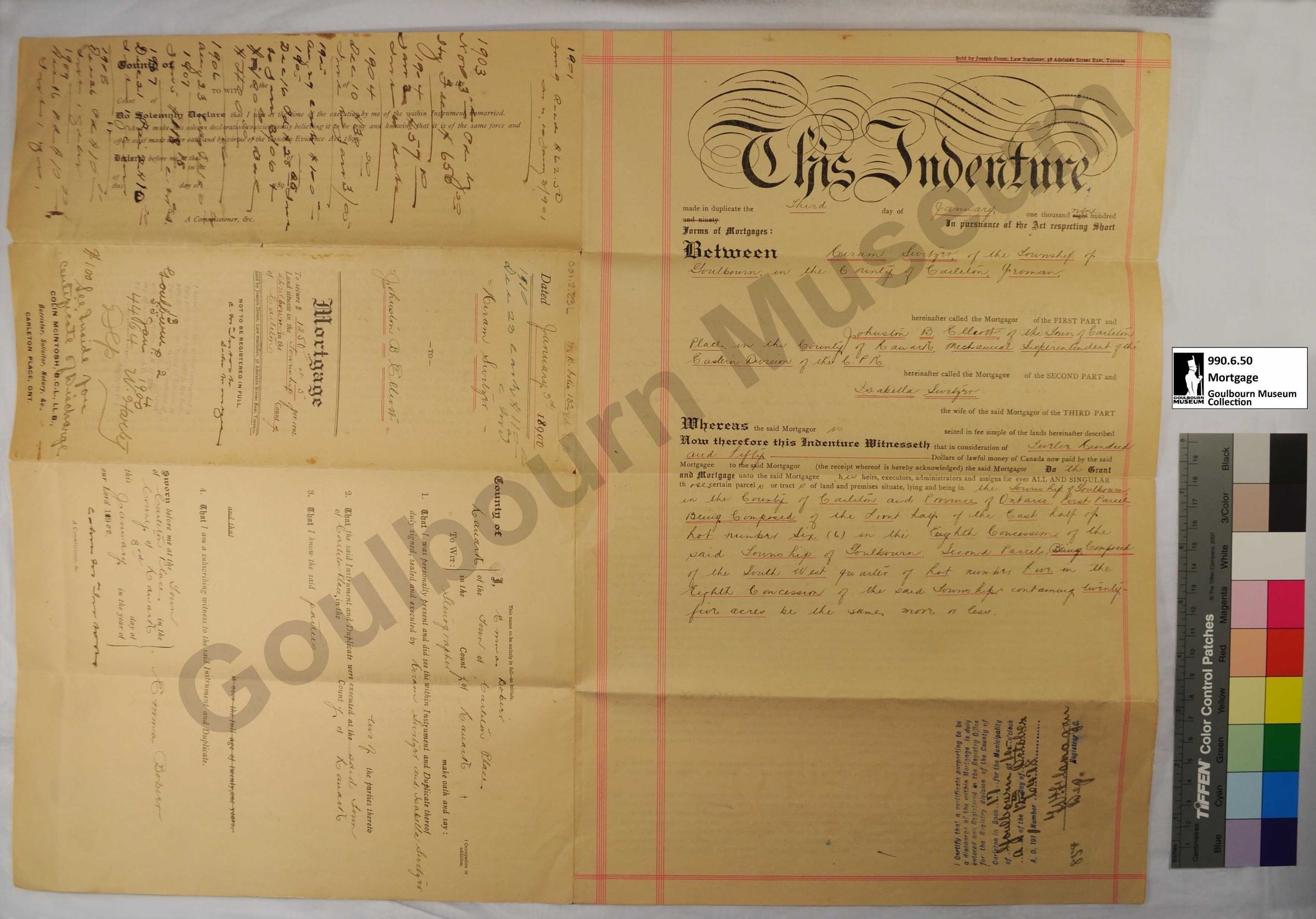 This object is a mortgage agreement between Hiram Switzer and Johnston B. Elliott. It is dated January 3, 1900. It concerns two parcels of land designated F1/2 E1/2 Lot 6 Concession 8 and the SW1/4 Lot 5 Concession 8. The support is a tan/cream coloured paper. The medium is a black printed ink. Red ink was used for underlining words, as well as for decorative borders. The words "This Indenture" are located at the top of the proper left front page in a large decorative font. The title page, located at the proper right top quadrant of the front, is perpendicular to the primary text as this object was intended to be folded into a brochure form for transport and storage. There is also a significant amount of handwritten text located at the proper top right corner of the front which does not appear to be directly associated with the body text; this is rendered perpendicular to the primary body of text. An additional body of text on the lower proper bottom right corner of the front is also perpendicular to the primary body of text. There is a blue rubber stamp imprint in the proper bottom right corner of the front containing 7 lines of script; the fields of the stamp have been filled in by hand with a blank ink, rendered in cursive. The stamp is perpendicular to the primary body of text.