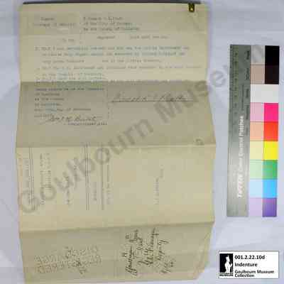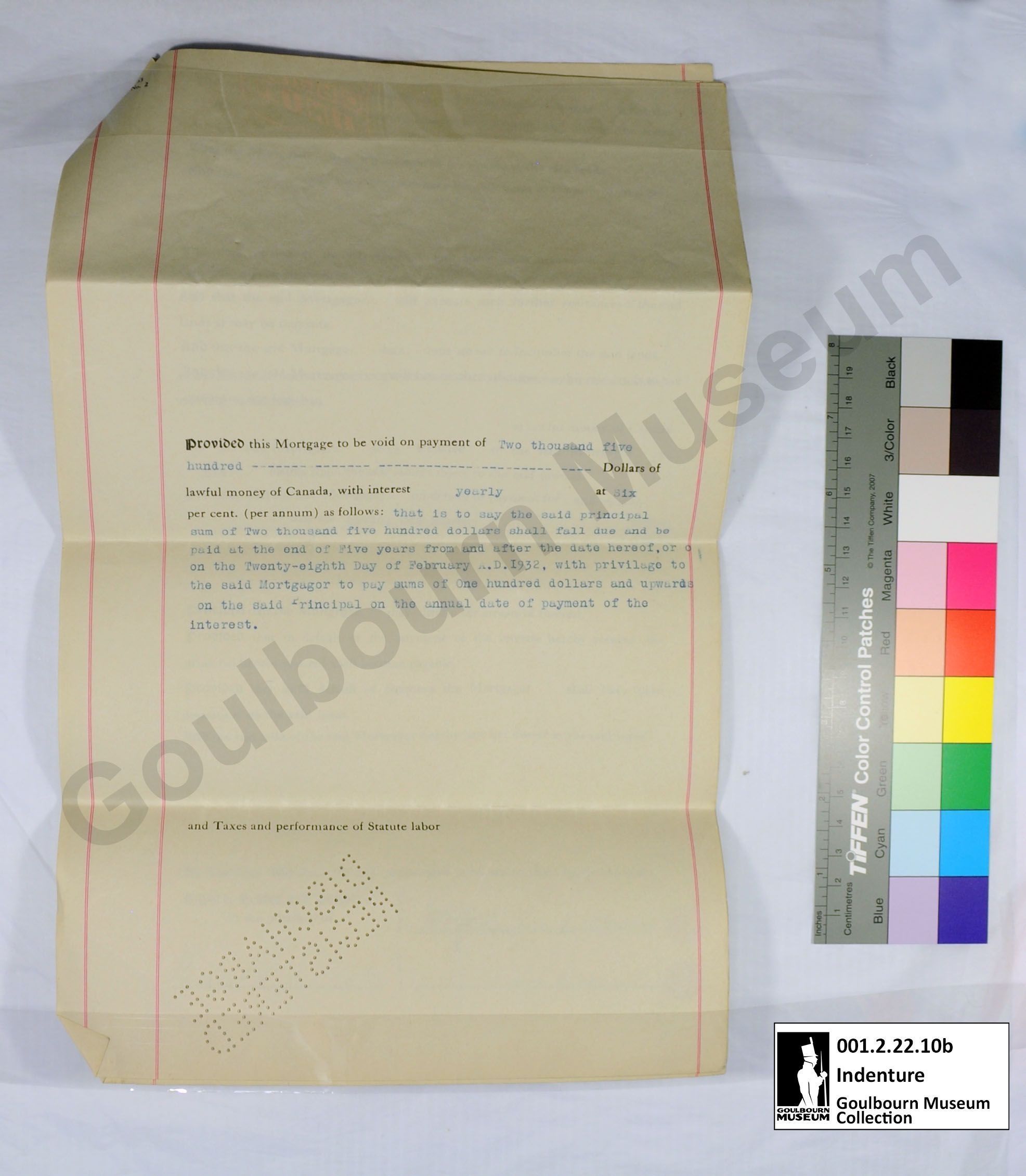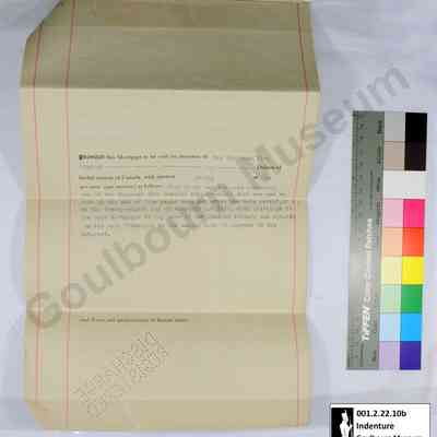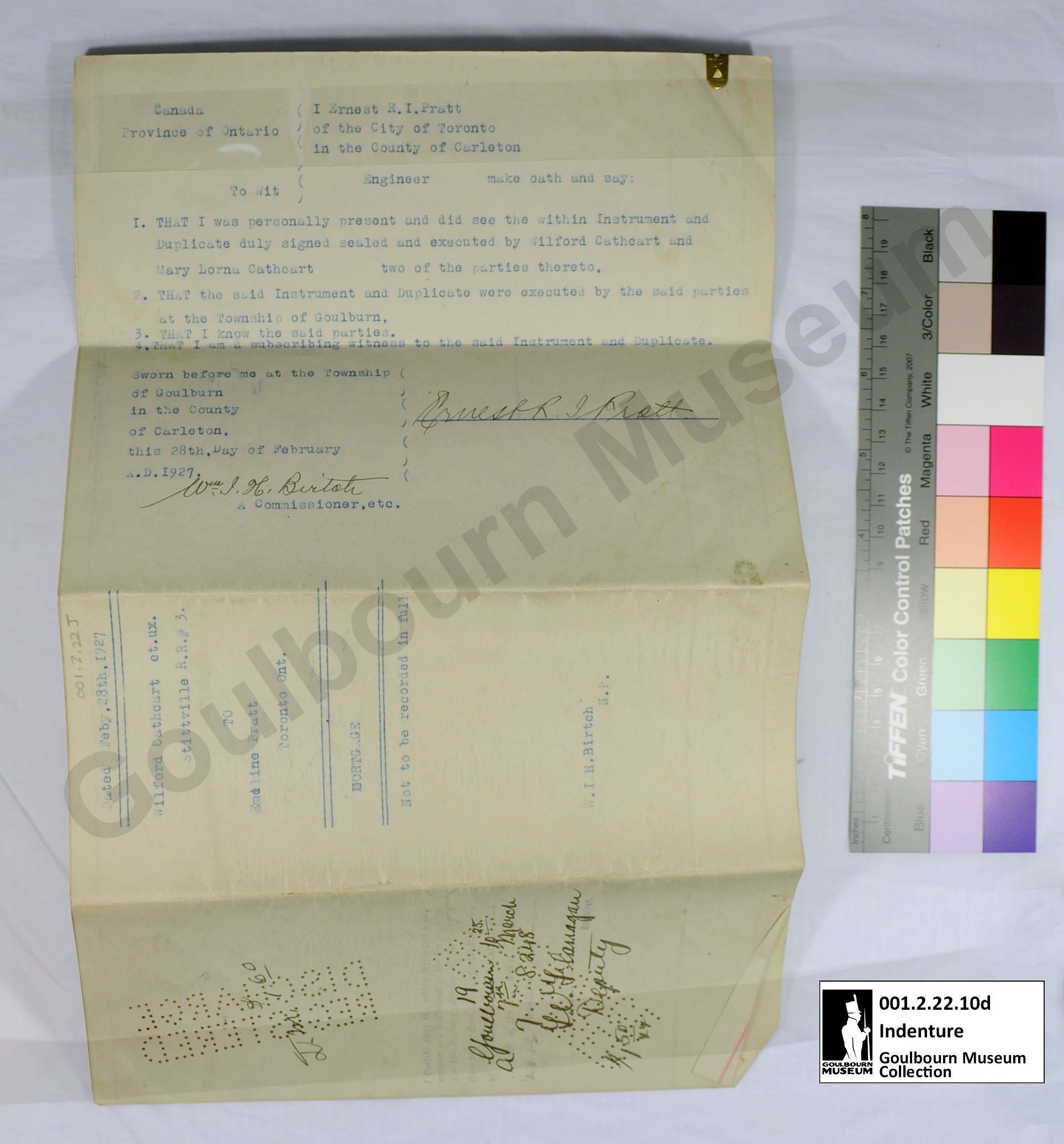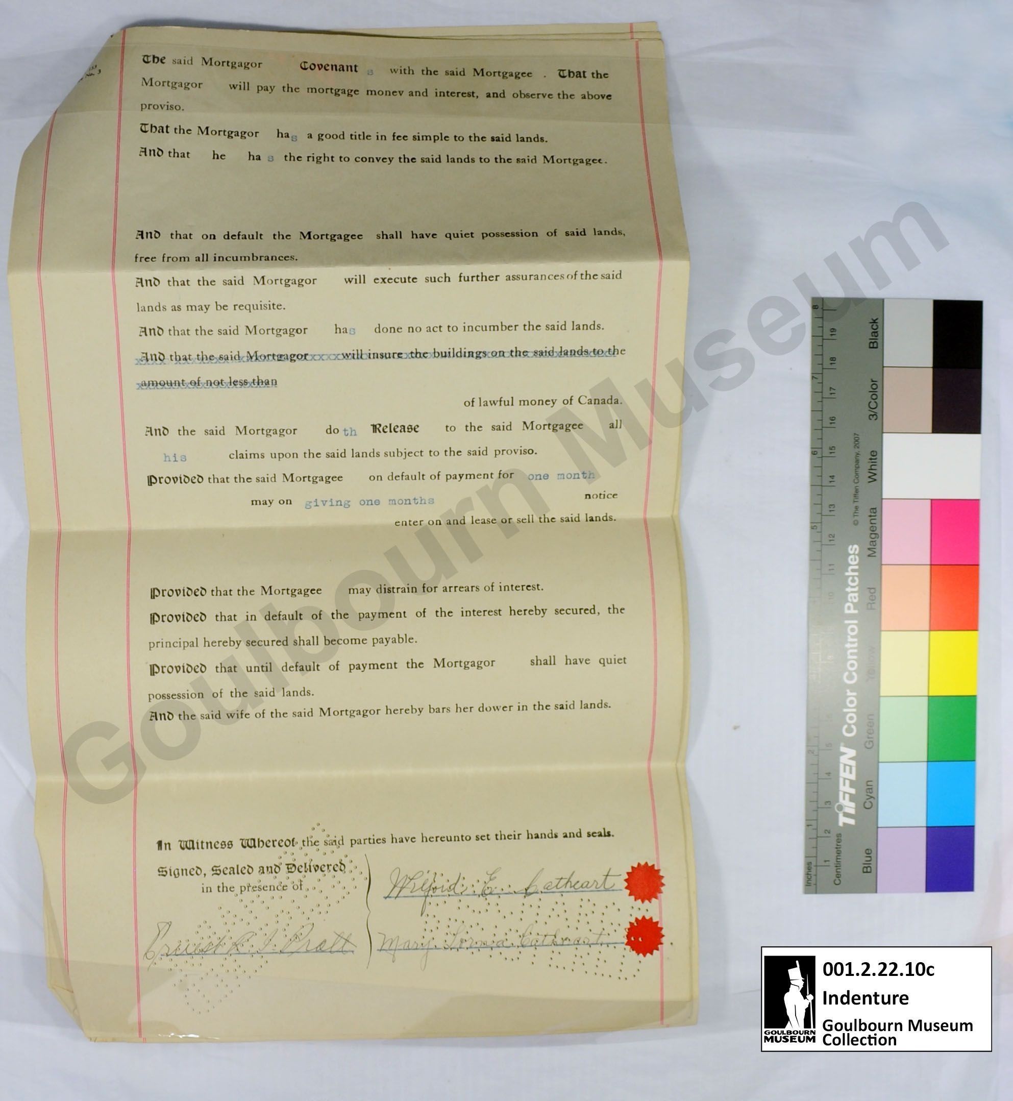 This object is a mortgage agreement between Wilford Cathcart and Emeline Pratt. It is dated to February 28, 1927. It concerns a parcel of land designated E1/2 Lot 24 Concession 7. It is comprised of four cream colored pieces of paper held together with a yellow brass clip located at the proper top right corner; the clip is affixed to the top edge of papers. The medium is a black and blue ink. Signatures are rendered in a handwritten black ink, rendered in cursive. The front page (a) second page (b) and third page (c) and fourth page (d), have three vertical red lines extending the length of the page on the front; two near the proper right margin and one near the proper left margin. The words "DISCHARGE REGISTERED" have been punched into the bottom proper right of all the pages with small holes, rendered in all capital letters; this appears mirrored when viewed from the front. Pages 3 and 4 (c and d) have an additional "DISCHARGE REGISTERED" mark located at the proper bottom left of the page, these are not mirrored when viewed from the front. Page 3 (c) has two circular red seals located in the proper bottom right corner. The front of page 4 is blank aside from the vertical red lines, the reverse of this page is the back of the object. The back of the object, aka the reverse of page 4, bears the title page which is situated in a perpendicular orientation in relation to the primary text of the document due to the fact that this object was intended to be folded into a brochure form for transport and storage. There is a rubber stamp rendered in black ink, badly faded, located at the bottom of the back approximately centered; this depicts 7 lines of script. The stamp has been filled in with a handwritten black ink.Context