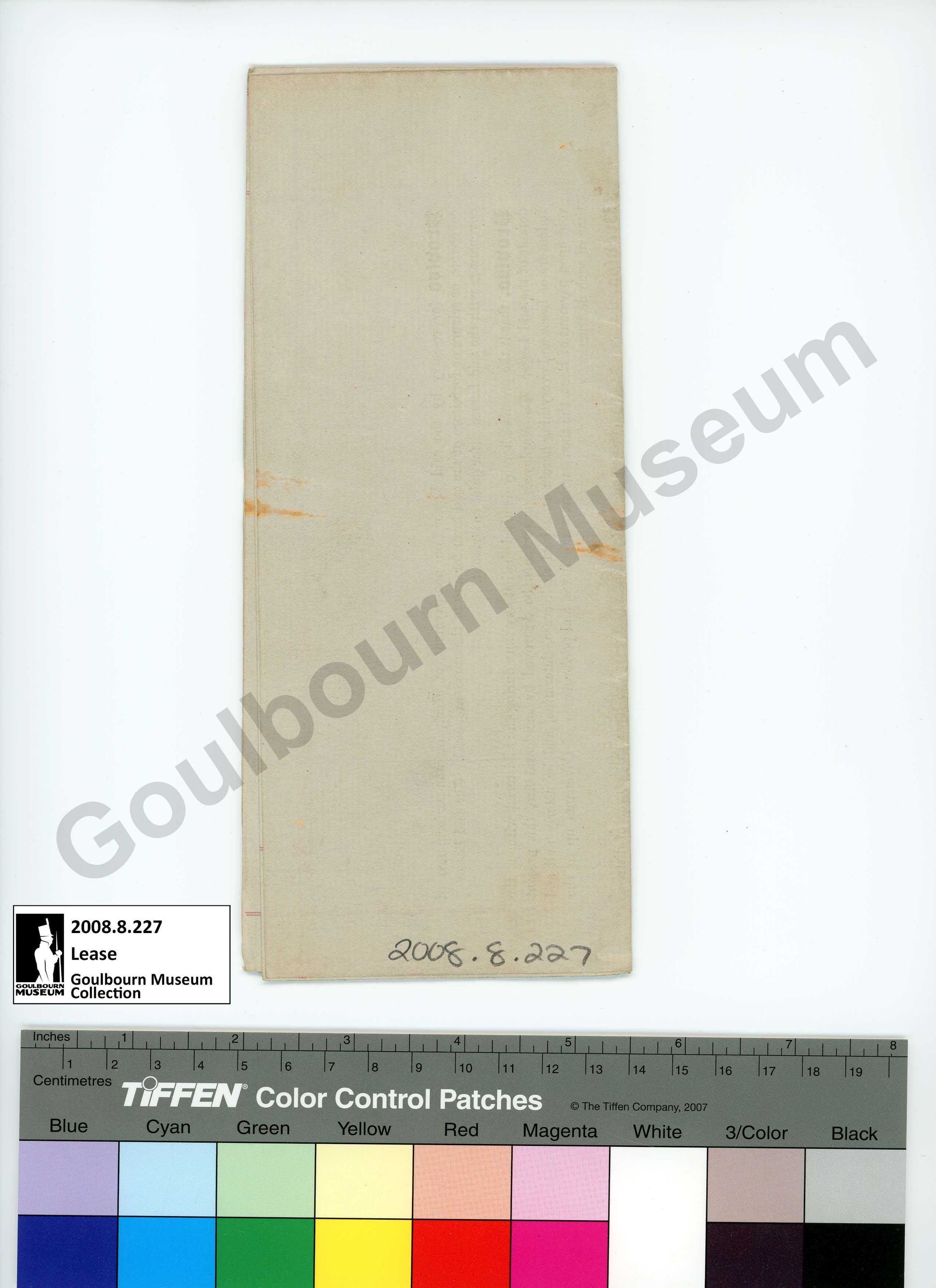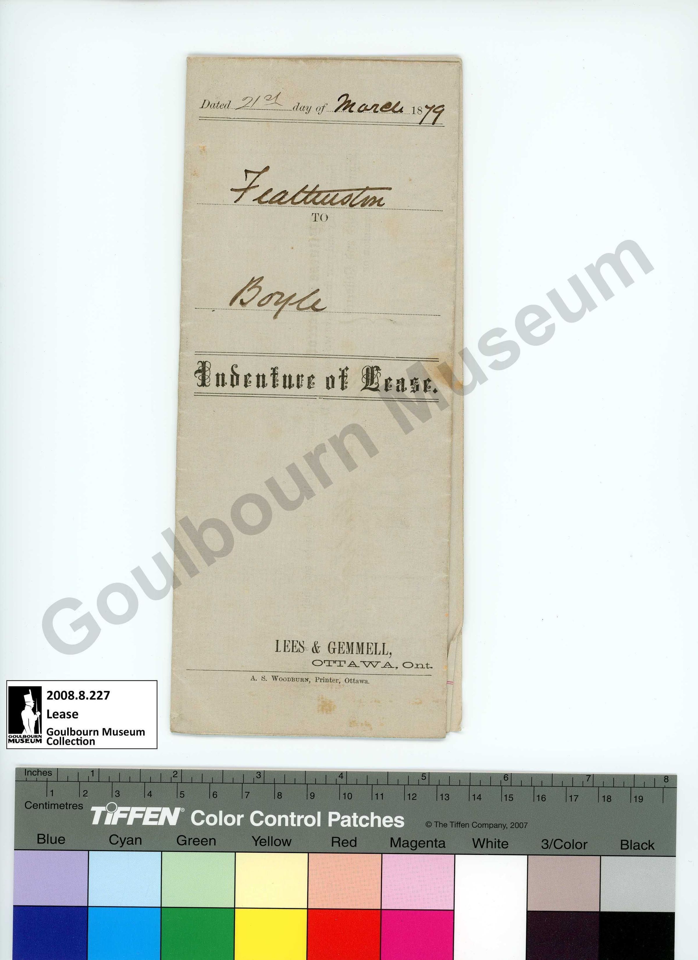 The artefact is an Indenture of Lease from an unspecified Featherston to a Boyle. Text on the obverse reads "Dated 21st day of March 1879. Featherston to Boyle. Indenture of Lease. Lees & Gemmel, Ottawa Ont. A.S. Woodburn, Printer, Ottawa." The reverse remains blank.Collection