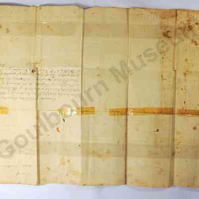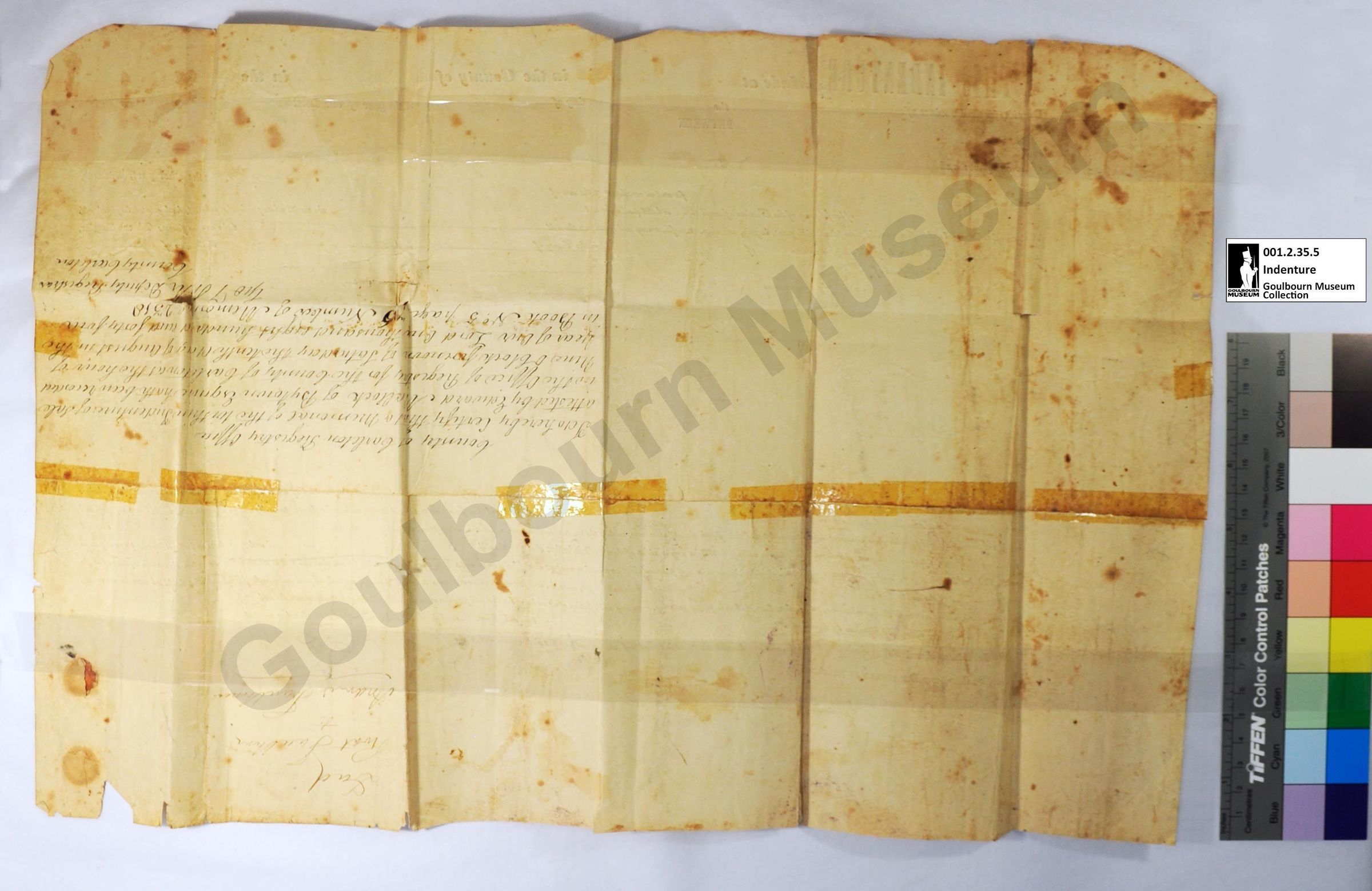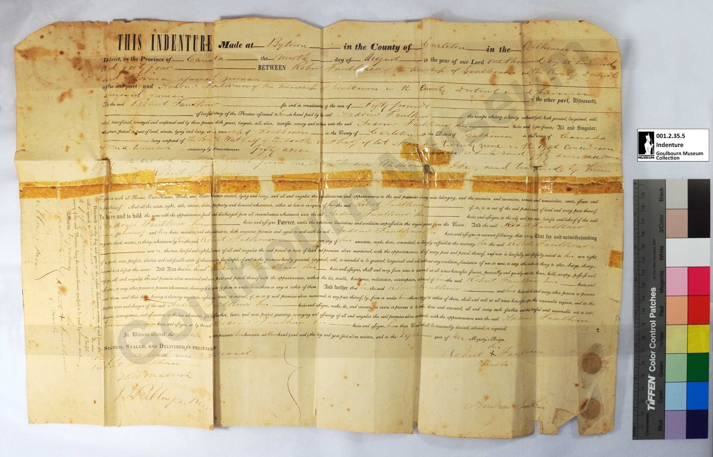 This object is an indenture between Robert Faulkner and Andrew Faulkner for the sum of 50 pounds. It is dated to August 1844. It concerns a parcel of land designated W1/2 of S(W or E)1/2 Lot 29 Concession 8. The support is a tan piece of paper that has been repaired with a clear adhesive tape; the paper under the tape has turned a darker shade of yellow brown. The medium is a black printed ink. The fields have been filled in with a black handwritten ink, rendered in cursive. There is a body of text in the proper bottom right corner of the front which is perpendicular to the primary body of text. The title "THIS INDENTURE" appears in all capital letters, in a larger font, at the top of the front with a bias towards the proper right side. There are two seals located at the proper bottom left corner of the front. These are comprised of a rhombus shaped piece of paper adhered onto a circular red substance underneath; the long points of the rhombuses point towards the top and bottom of the page. The paper of the seals have been imprinted onto the red circular substance with a circular imprint, comprised of many small holes. The top of the bottom seal is beginning to delaminate.