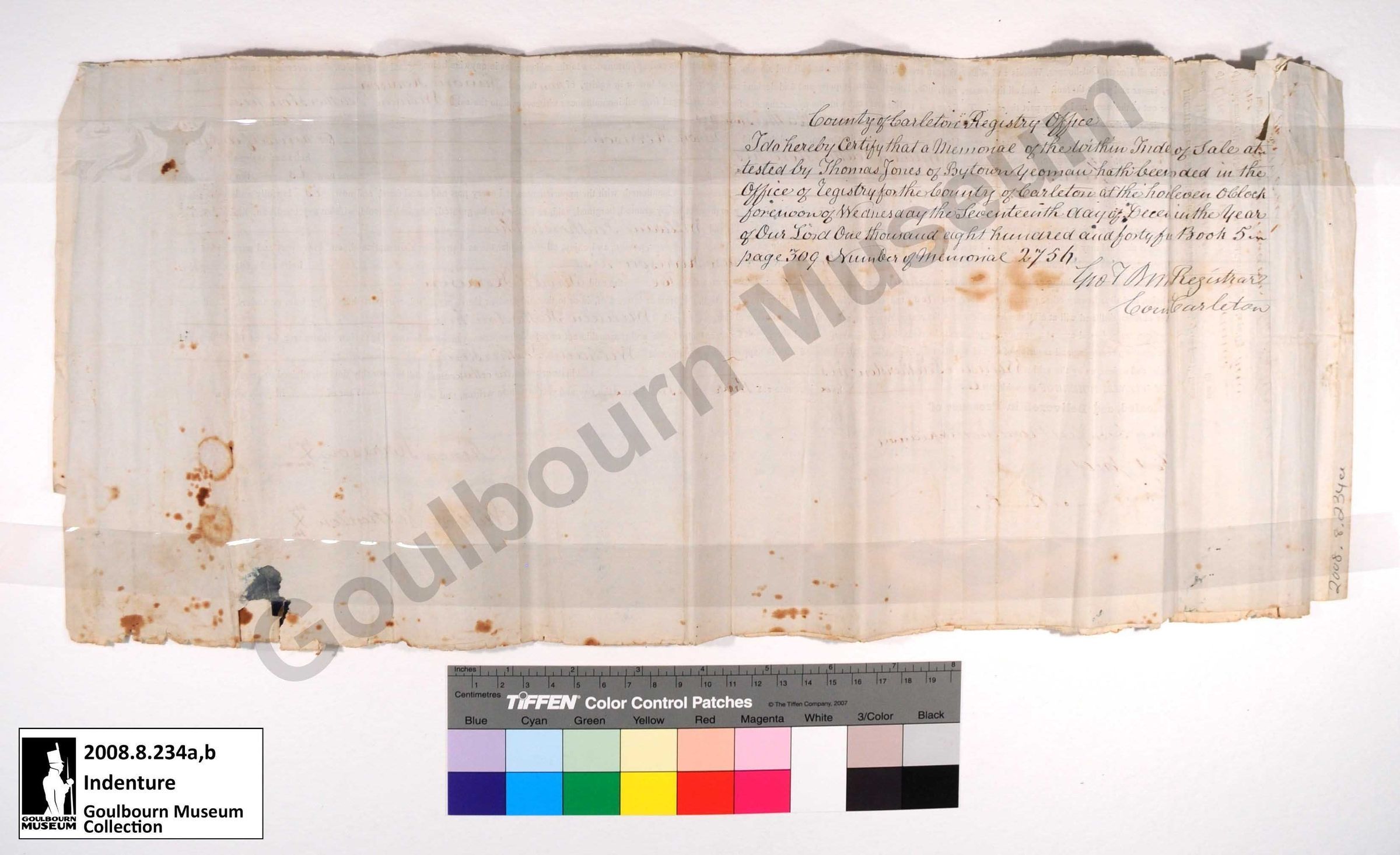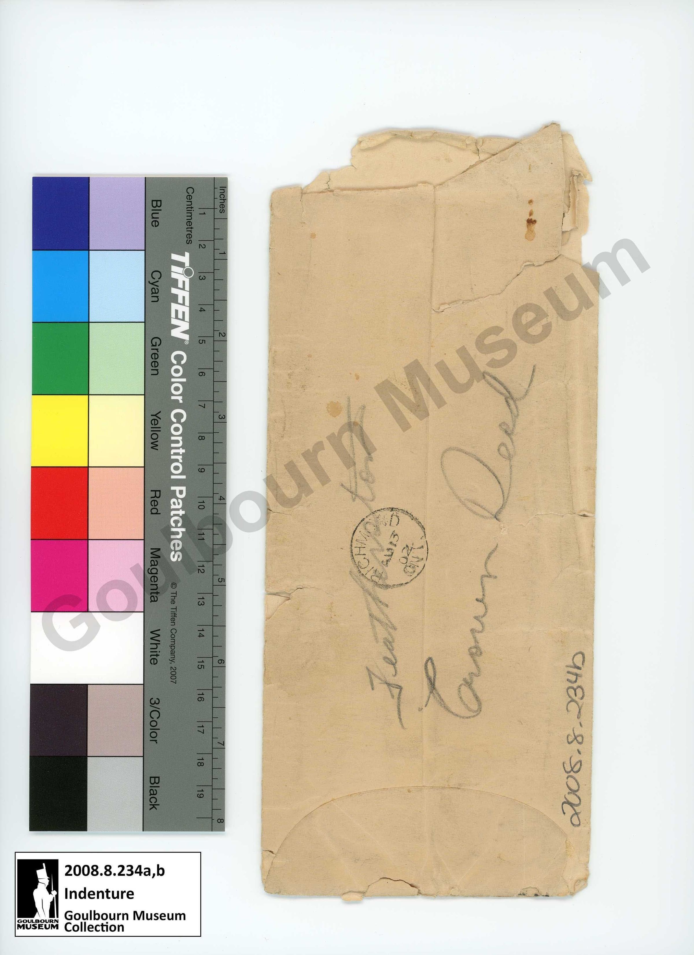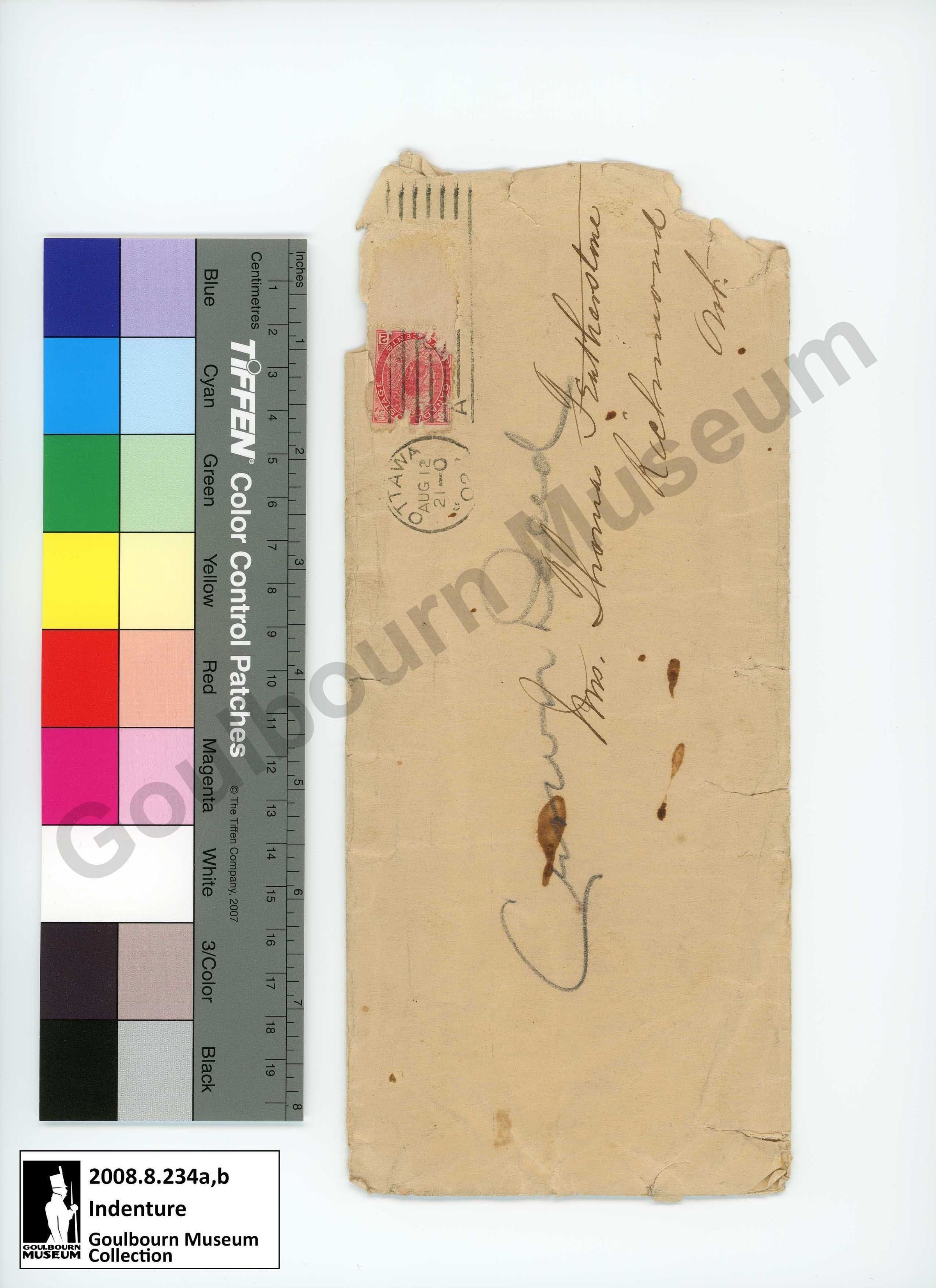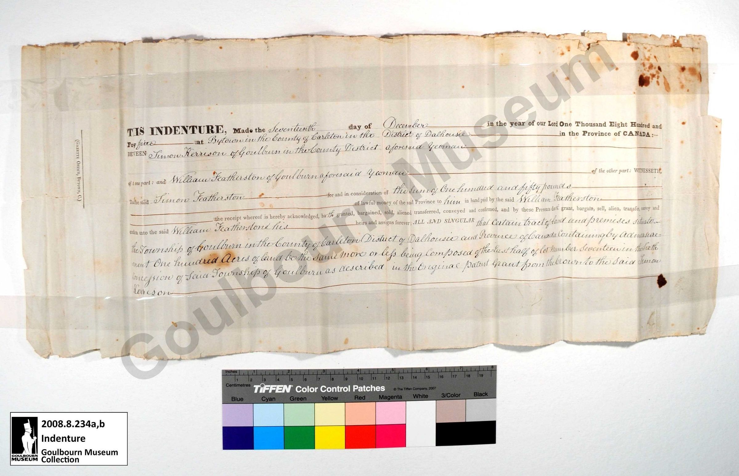 Mailed copy of an Indenture from The Township of Goulbourn in the County of Carleton, in the district of Dalhousie, and the Provence of Canada as well as the envelope it was originally transported in. The artefacts detail a land transfer from Simon Kerrison to William and Simon Featherston of 100 acres of land in Goulbourn Township.Collection