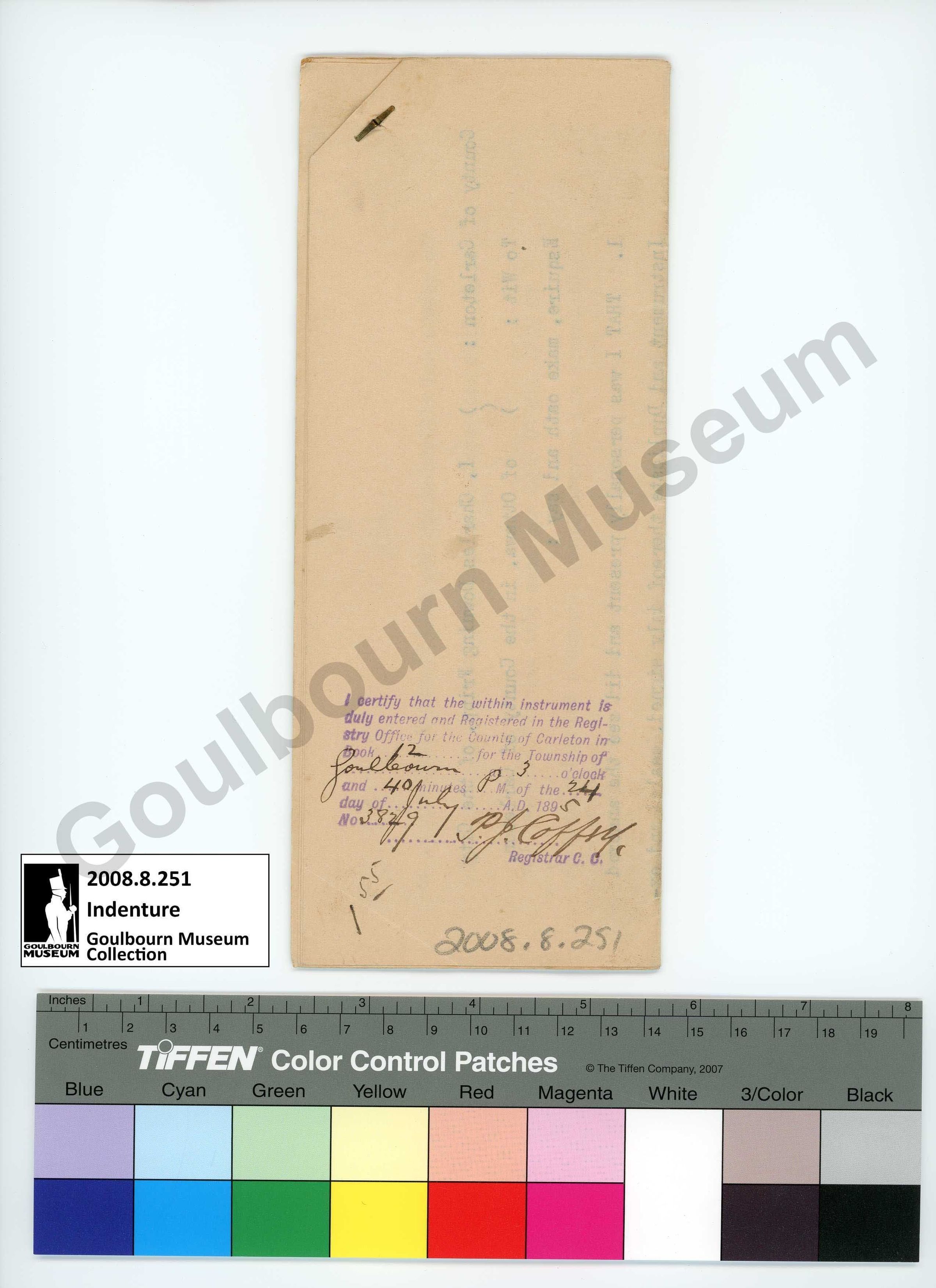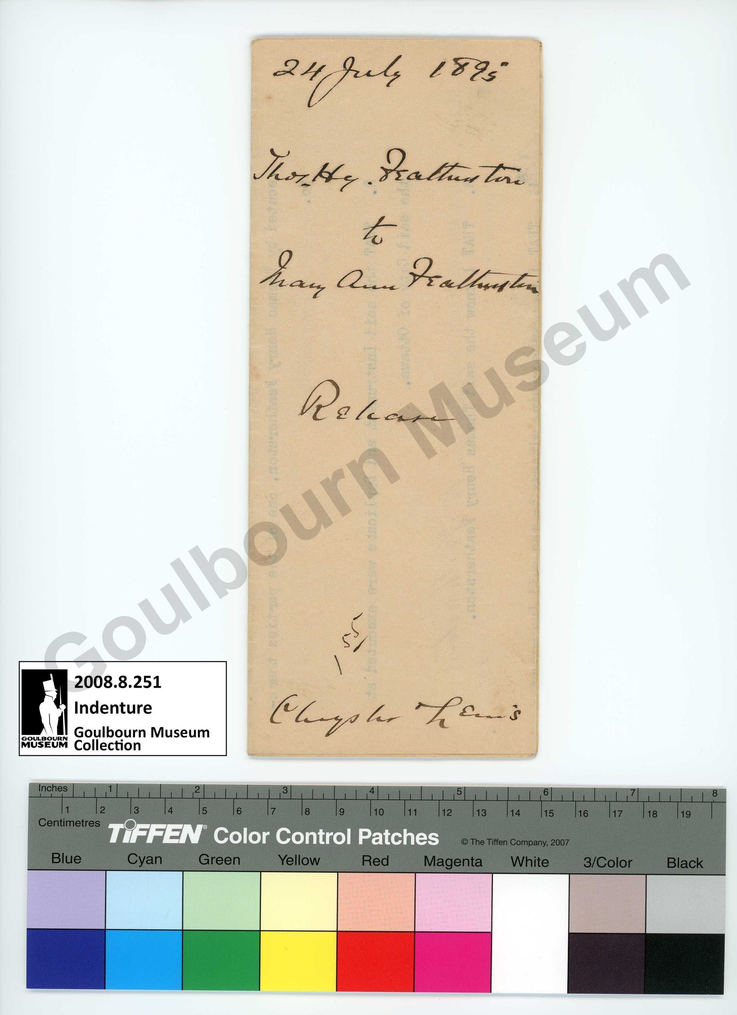 Artefact is a folded paper copy of an indenture between Thomas Featherston and Mary Ann Featherston. The front of the document reads, "24 July 1895 Thomas H. Featherston to Mary Ann Featherston release Christopher Lewis". The reverse reads, "I certify that the within instrument is duly entered and registered in the registry office for the county of Carleton in Book 12 for the Township of Goulbourn at 3 o'clock and 40 minutes P.M. of the 24 day of July A.D. 1895 No 3829 P.J. Coffey, Registrar C.C."Collection